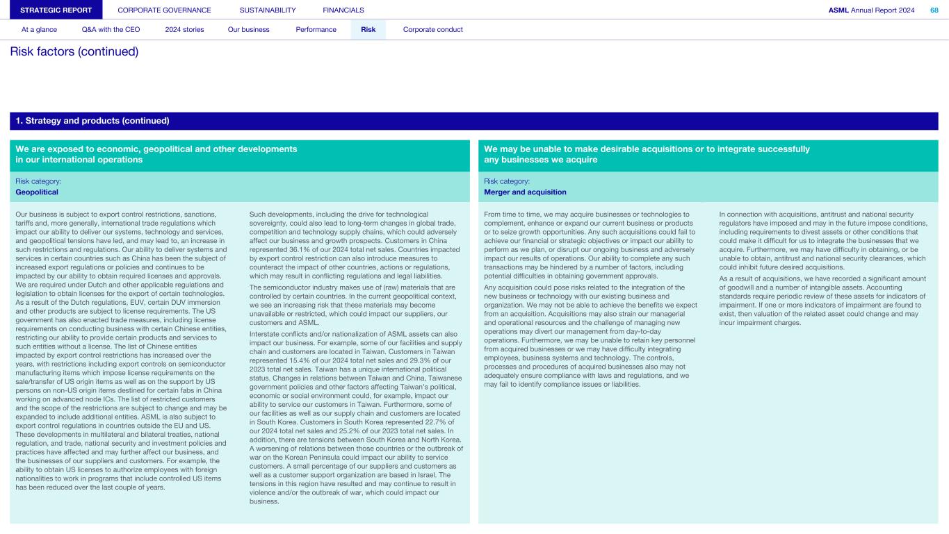 1.战略和产品(续)我们在国际业务中面临经济、地缘政治和其他发展风险我们可能无法进行理想的收购或成功整合我们收购的任何业务风险类别:风险类别:地缘政治并购我们的业务受到出口管制限制、制裁、关税,更广泛地说,国际贸易法规影响我们交付系统、技术和服务的能力,地缘政治紧张局势已导致并可能导致此类限制和法规的增加。我们在中国等某些国家提供系统和服务的能力一直受到出口法规或政策增加的影响,并继续受到我们获得所需许可证和批准的能力的影响。根据荷兰和其他适用的法规和立法,我们必须获得某些技术出口的许可证。由于荷兰法规,EUV、某些DUV浸入式和其他产品受许可要求的约束。美国政府还颁布了贸易措施,包括对与某些中国实体开展业务的许可要求,限制了我们在没有许可的情况下向这些实体提供某些产品和服务的能力。多年来,受出口管制限制影响的中国实体名单有所增加,限制包括对半导体制造项目的出口管制,这些项目对美国原产物品的销售/转让提出许可要求,以及美国人对运往中国某些从事先进节点IC的晶圆厂的非美国原产物品的支持。限制客户名单和限制范围可能会发生变化,可能会扩大到包括更多的实体。ASML还受到欧盟和美国以外国家出口管制法规的约束。多边和双边条约、国家监管以及贸易、国家安全和投资政策和做法的这些发展已经影响并可能进一步影响我们的业务以及我们的供应商和客户的业务。例如,在过去几年中,获得美国许可以授权具有外国国籍的员工在包括受管制的美国物品的项目中工作的能力有所降低。这些发展,包括对技术主权的推动,也可能导致全球贸易、竞争和技术供应链的长期变化,这可能对我们的业务和增长前景产生不利影响。中国客户占我们2024年总净销售额的36.1%。受出口管制限制影响的国家也可以出台措施,以抵消其他国家、行动或法规的影响,这可能导致法规和法律责任相互冲突。半导体产业利用的是某些国家控制的(原材料)材料。在当前的地缘政治背景下,我们认为这些材料可能无法获得或受到限制的风险越来越大,这可能会影响我们的供应商、我们的客户和ASML。州际冲突和/或ASML资产的国有化也可能影响我们的业务。例如,我们的一些设施和供应链以及客户都位于台湾。台湾客户占我们2024年总净销售额的15.4%,占2023年总净销售额的29.3%。台湾具有独特的国际政治地位。例如,台湾与中国大陆关系的变化、台湾政府政策以及影响台湾政治、经济或社会环境的其他因素可能会影响我们为台湾客户提供服务的能力。此外,我们的一些设施以及我们的供应链和客户都位于韩国。韩国客户占我们2024年总净销售额的22.7%,占2023年总净销售额的25.2%。此外,韩朝之间也存在紧张关系。这些国家之间的关系恶化或朝鲜半岛爆发战争可能会影响我们为客户提供服务的能力。我们的供应商和客户以及客户支持组织中有一小部分总部设在以色列。这一地区的紧张局势已经导致并可能继续导致暴力和/或战争爆发,这可能会影响我们的业务。我们可能会不时收购业务或技术,以补充、增强或扩展我们目前的业务或产品,或抓住增长机会。任何此类收购都可能无法实现我们的财务或战略目标,或影响我们按计划执行的能力,或扰乱我们正在进行的业务并对我们的经营业绩产生不利影响。我们完成任何此类交易的能力可能受到多种因素的阻碍, 包括在获得政府批准方面的潜在困难。任何收购都可能带来与新业务或技术与我们现有业务和组织的整合相关的风险。我们可能无法实现我们期望从一次收购中获得的收益。收购也可能使我们的管理和运营资源紧张,管理新业务的挑战可能会使我们的管理层从日常运营中分流。此外,我们可能无法从收购的业务中留住关键人员,或者我们可能难以整合员工、业务系统和技术。收购业务的控制、流程和程序也可能无法充分确保遵守法律法规,我们可能无法识别合规问题或责任。关于收购,反垄断和国家安全监管机构已经施加并可能在未来施加条件,包括要求剥离资产或其他可能使我们难以整合我们收购的业务的条件。此外,我们可能难以获得或无法获得反垄断和国家安全许可,这可能会抑制未来想要的收购。由于收购,我们录得大量商誉和若干无形资产。会计准则要求定期审查这些资产的减值指标。如果发现存在一项或多项减值指标,则相关资产的估值可能会发生变化,并可能产生减值费用。战略报告公司治理可持续发展财务ASML年度报告202468与CEO的一览问答2024故事我们的业务绩效风险公司行为风险因素(续)