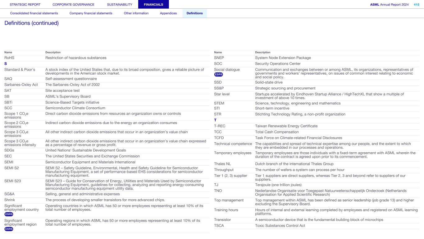 RoHS对有害物质的限制S标准普尔美国股票指数,由于其广泛的组成,给出了美国股市发展的可靠图景。SAQ自我评估问卷萨班斯-奥克斯利法案2002年萨班斯-奥克斯利法案SAT现场验收测试SB ASML监事会SBTi科学目标倡议SCC半导体气候联盟范围1 CO2e排放一组织拥有或控制的资源的直接二氧化碳排放范围2 CO2e排放由于一组织消耗的能源而产生的间接二氧化碳排放范围3 CO2e排放一组织价值链中发生的所有其他间接二氧化碳排放范围3 CO2e排放强度所有其他间接二氧化碳排放发生在一个组织的价值链中,以收入或毛利润的百分比表示。SDGs联合国可持续发展目标SEC美国证券交易委员会SEMI半导体设备和材料国际SEMI S2 SEMI S2 –安全指南,半导体制造设备的环境、健康和安全指南,一套基于性能的半导体制造设备EHS考虑因素。SEMI S23 SEMI S23 –半导体制造设备使用的能源、公用事业和材料的节约指南,收集、分析和报告耗能半导体制造设备公用事业数据的指南。SG & A销售、一般和管理费用缩减了为更先进的芯片开发更小晶体管的进程。重要就业国家ASML拥有50名或更多雇员、至少占其雇员总数10%的营运国。重要就业区域ASML拥有50名或更多员工、至少占其员工总数10%的经营区域。名称描述SNEP系统节点扩展包SOC安全运营中心社会对话,就经济社会政策方面共同关心的问题,在ASML、其组织、政府代表和工人代表之间或之间进行沟通和交流。SSD固态硬盘SS & P战略采购和采购由Eindhoven Startup Alliance/HighTechXL加速的明星级初创公司显示出10倍以上的投资倍数。STEM科学、技术、工程和数学STI短期激励STR Stitching Technology Rating,一家非营利组织T T-REC台湾Renewable能源证书TCC总现金补偿TCFD气候相关财务披露工作组技术能力我国人民中技术专长的能力和传播范围,以及它们在多大程度上嵌入我们的流程和运营中。临时雇员临时雇员是指与ASML签订定期协议且合同期限在合同开始前约定的个人。泰雷兹NL国际分公司泰雷兹集团吞吐量荷兰分公司一个系统每小时可处理的晶片数量Tier1(2,3)供应商Tier1供应商是直接供应商,而Tier2,3及以上是指我们供应商的供应商。TJ Terajoule(one trillion joules)TNO Nederlandse Organisatie voor Toegepast Natuurwetenschappelijk Onderzoek(荷兰应用科学研究组织)最高管理层ASML内的最高管理层定义为高级领导(工作等级13)及以上,不包括监事会。培训课时由员工完成并在ASML学习平台注册的内外部学习课时。晶体管一种半导体器件,是微芯片的基础构建块TSCA有毒物质控制法案名称描述战略报告公司治理可持续财务ASML年度报告2024415合并财务报表公司财务报表其他信息附录定义(续)