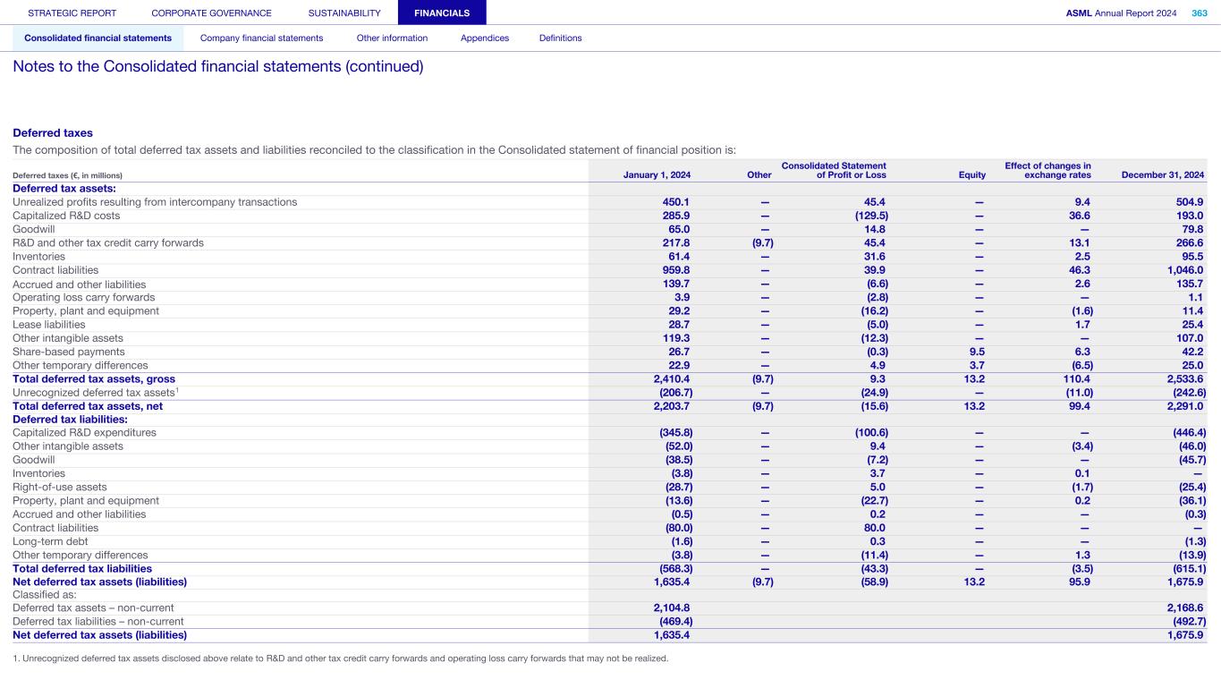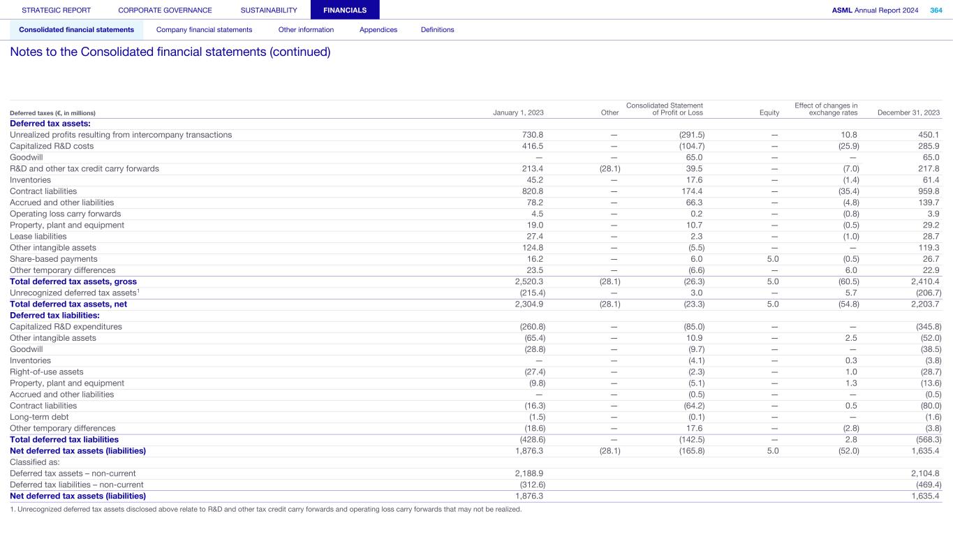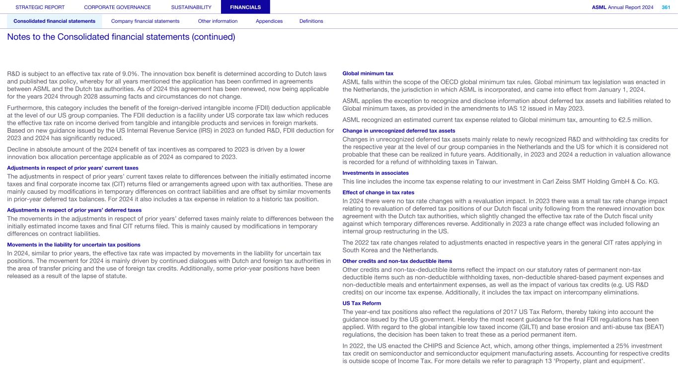 研发适用9.0%的有效税率。Innovation box benefit是根据荷兰法律和已公布的税收政策确定的,据此,对于提到的所有年份,该申请已在ASML与荷兰税务机关的协议中得到确认。截至2024年,本协议已续签,现在适用于2024年至2028年,前提是事实和情况不发生变化。此外,这一类别还包括适用于我们美国集团公司层面的外国衍生无形收入(FDII)扣除的利益。FDII扣除是美国公司税法下的一项便利,它降低了外国市场有形和无形产品和服务所得收入的有效税率。基于美国国税局(IRS)于2023年发布的关于资助研发的新指南,2023年和2024年的FDII扣除额已大幅减少。与2023年相比,2024年税收优惠福利的绝对金额下降是由于与2023年相比,截至2024年适用的创新箱分配百分比较低。以前年度当期税项的调整以前年度当期税项的调整涉及提交的初步估计所得税与最终企业所得税(CIT)申报表或与税务机关商定的安排之间的差异。这些主要是由于合同负债的暂时性差异的修改造成的,并被上一年递延税项余额的类似变动所抵消。对于2024年,它还包括与历史税收状况相关的税收支出。以往年度递延税项调整以往年度递延税项调整的变动主要与初步估计的所得税与最终提交的企业所得税申报表之间的差异有关。这主要是合同负债暂时性差异的修改造成的。2024年不确定税务状况的负债变动,与往年类似,有效税率受到不确定税务状况负债变动的影响。2024年的运动主要是由与荷兰和外国税务当局在转让定价和使用外国税收抵免领域的持续对话推动的。此外,由于法规失效,一些上一年的职位已被释放。全球最低税ASML属于OECD全球最低税规则的范围。全球最低税立法在ASML所在的司法管辖区荷兰颁布,自2024年1月1日起生效。根据2023年5月发布的IAS 12修订中的规定,ASML适用该例外情况来确认和披露与Global Minimum Taxes相关的递延所得税资产和负债的信息。ASML确认了与Global最低税相关的估计当前税费,金额为250万欧元。未确认递延所得税资产变动未确认递延所得税资产变动主要与我们在荷兰和美国的集团公司层面新确认的相应年度的研发和预提税收抵免有关,这些被认为不太可能在未来年度实现。此外,在2023年和2024年,台湾的预扣税退款记录了估价津贴的减少。对联营公司的投资这一行包括与我们对Carl Zeiss SMT Holding GmbH & Co. KG的投资有关的所得税费用。税率变化的影响2024年没有重估影响的税率变化。在与荷兰税务当局续签创新盒子协议之后,2023年有一个与我们荷兰财政统一的递延税收头寸重估相关的小幅税率变化影响,该协议略微改变了临时差异逆转的荷兰财政统一的有效税率。此外,在美国进行内部集团重组后,2023年还包括了利率变化影响。2022年税率变动与韩国和荷兰适用的一般企业所得税税率在相应年份颁布的调整有关。其他抵免额和非扣税项目其他抵免额和非扣税项目反映了对我们的法定税率的影响,例如不可扣除的预扣税、不可扣除的共享支付费用和不可扣除的餐饮和娱乐费用,以及各种税收抵免(例如美国研发抵免额)对我们的所得税费用的影响。此外,它还包括对公司间抵销的税收影响。美国税改年终税务状况也反映了2017年美国税改的规定, 从而考虑到美国政府发布的指导意见。特此适用FDII最终法规的最新指南。关于全球无形低税收入(GILTI)和税基侵蚀和反滥用税(BEAT)条例,已决定将这些视为定期永久项目。2022年,美国颁布了《CHIPS和科学法案》,除其他外,该法案对半导体和半导体设备制造资产实施了25%的投资税收抵免。各自抵免额的会计核算不在所得税范围内。有关更多详情,请参阅第13段‘物业、厂房及设备’。战略报告公司治理可持续发展财务ASML年度报告2024361合并财务报表公司财务报表其他信息附录定义合并财务报表附注(续)