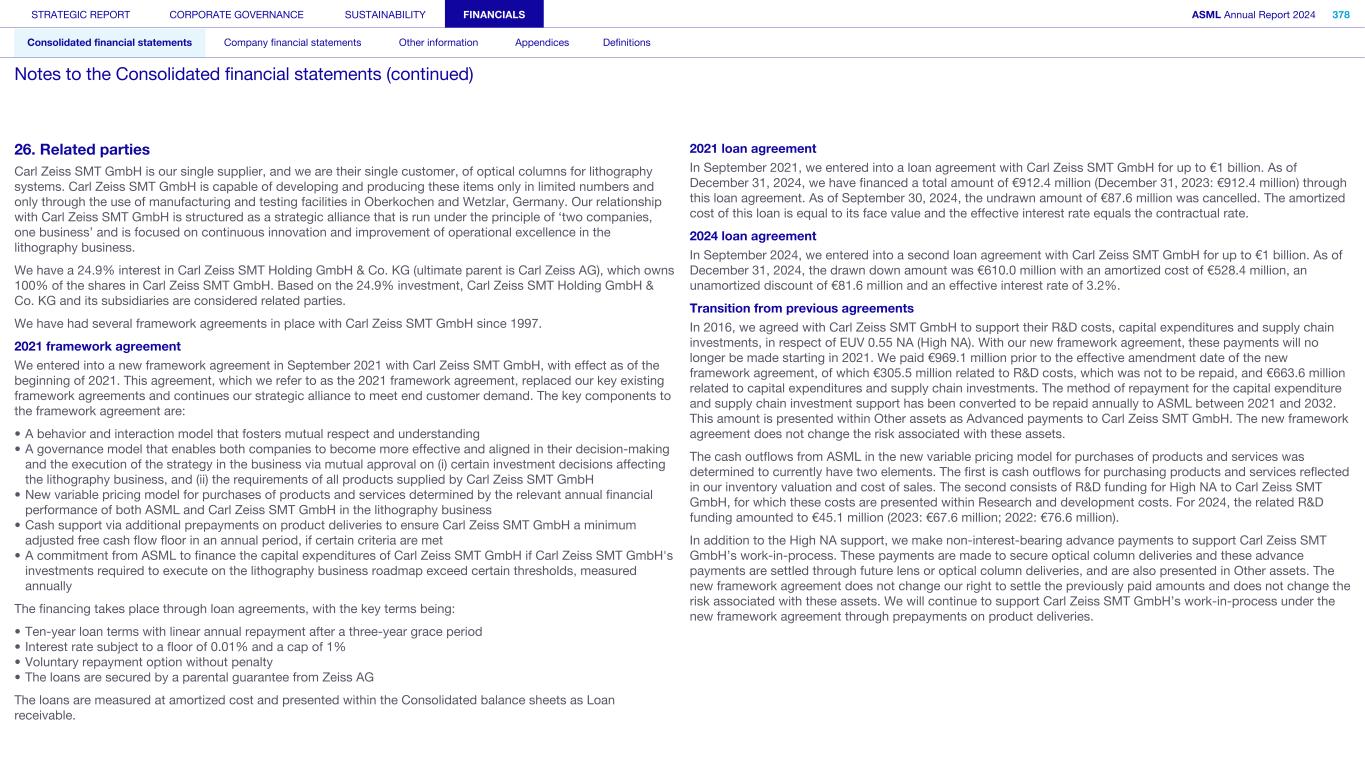 26.关联方Carl Zeiss SMT GmbH是我们光刻系统光学柱的单一供应商,我们是他们的单一客户。Carl Zeiss SMT GmbH能够开发和生产这些产品的数量有限,并且只能通过使用位于德国Oberkochen和Wetzlar的制造和测试设施。我们与Carl Zeiss SMT GmbH的关系是一个战略联盟,在‘两家公司,一项业务’的原则下运行,并专注于持续创新和改善光刻业务的卓越运营。我们拥有Carl Zeiss SMT Holding GmbH & Co. KG(最终母公司为Carl Zeiss AG)的24.9%权益,后者拥有Carl Zeiss SMT GmbH的100%股权。根据24.9%的投资,Carl Zeiss SMT Holding GmbH & Co. KG及其子公司被视为关联方。自1997年以来,我们与Carl Zeiss SMT GmbH签订了多项框架协议。2021年框架协议我们于2021年9月与Carl Zeiss SMT GmbH签订了新的框架协议,自2021年初生效。该协议,我们称之为2021年框架协议,取代了我们现有的关键框架协议,并继续我们的战略联盟,以满足终端客户的需求。框架协议的关键组成部分是:•一种行为和互动模式,促进相互尊重和理解•一种治理模式,通过就(i)影响光刻业务的某些投资决策相互批准,使两家公司能够在其决策和业务中执行战略方面变得更加有效和一致,(ii)Carl Zeiss SMT GmbH供应的所有产品的要求•新的产品和服务采购可变定价模式由光刻业务中ASML和Carl Zeiss SMT GmbH双方的相关年度财务业绩确定•通过产品交付的额外预付款提供现金支持,以确保Carl Zeiss SMT GmbH在年度期间有最低的调整后自由现金流下限,如果满足某些标准•如果Carl Zeiss SMT GmbH执行光刻业务路线图所需的投资超过某些阈值(每年衡量一次),ASML承诺为Carl Zeiss SMT GmbH的资本支出提供资金,融资每年通过贷款协议进行,关键条款为:• 10年期贷款期限,三年宽限期后按年线性偿还•利率有0.01%的下限和1%的上限•自愿还款选择权而不受违约•贷款由Zeiss AG的母公司担保担保。贷款按摊余成本计量,并在综合资产负债表中作为应收贷款列报。2021年贷款协议2021年9月,我们与Carl Zeiss SMT GmbH签订了高达10亿欧元的贷款协议。截至2024年12月31日,我们通过该贷款协议融资总额为9.124亿欧元(2023年12月31日:9.124亿欧元)。截至2024年9月30日,8760万欧元的未提取金额已被注销。这笔贷款的摊余成本等于其面值,实际利率等于合同利率。2024年贷款协议2024年9月,我们与Carl Zeiss SMT GmbH签订了第二份贷款协议,金额高达10亿欧元。截至2024年12月31日,已提取金额为6.10亿欧元,摊销成本为5.284亿欧元,未摊销折扣为8160万欧元,实际利率为3.2%。从之前的协议过渡到2016年,我们与Carl Zeiss SMT GmbH就EUV 0.55 NA(High NA)达成协议,支持他们的研发成本、资本支出和供应链投资。根据我们的新框架协议,从2021年开始将不再支付这些款项。我们在新框架协议生效修订日期之前支付了9.691亿欧元,其中3.055亿欧元与研发成本有关,未予偿还,6.636亿欧元与资本支出和供应链投资有关。资本开支和供应链投资支持的偿还方式已转换为在2021-2032年期间每年向ASML偿还。该金额在其他资产中列报为向Carl Zeiss SMT GmbH支付的预付款。新的框架协议不会改变与这些资产相关的风险。新的购买产品和服务的可变定价模型中来自ASML的现金流出,目前确定为具有两个要素。首先是购买产品和服务的现金流出,反映在我们的存货估值和销售成本中。第二个包括向Carl Zeiss SMT GmbH提供High NA的研发资金,这些费用在研发成本中列示。2024年,相关研发经费为4510万欧元(2023年:6760万欧元;2022年:7660万欧元)。除了高NA的支持, 我们支付无息预付款以支持Carl Zeiss SMT GmbH的在制品。这些付款是为了确保光学柱交付,这些预付款通过未来的镜头或光学柱交付来结算,也在其他资产中列报。新的框架协议不会改变我们结算先前支付的金额的权利,也不会改变与这些资产相关的风险。我们将继续通过产品交付预付款支持Carl Zeiss SMT GmbH在新框架协议下的在制品。战略报告公司治理可持续发展金融公司ASML 2024年度报告378合并财务报表公司财务报表其他信息附录定义合并财务报表附注(续)