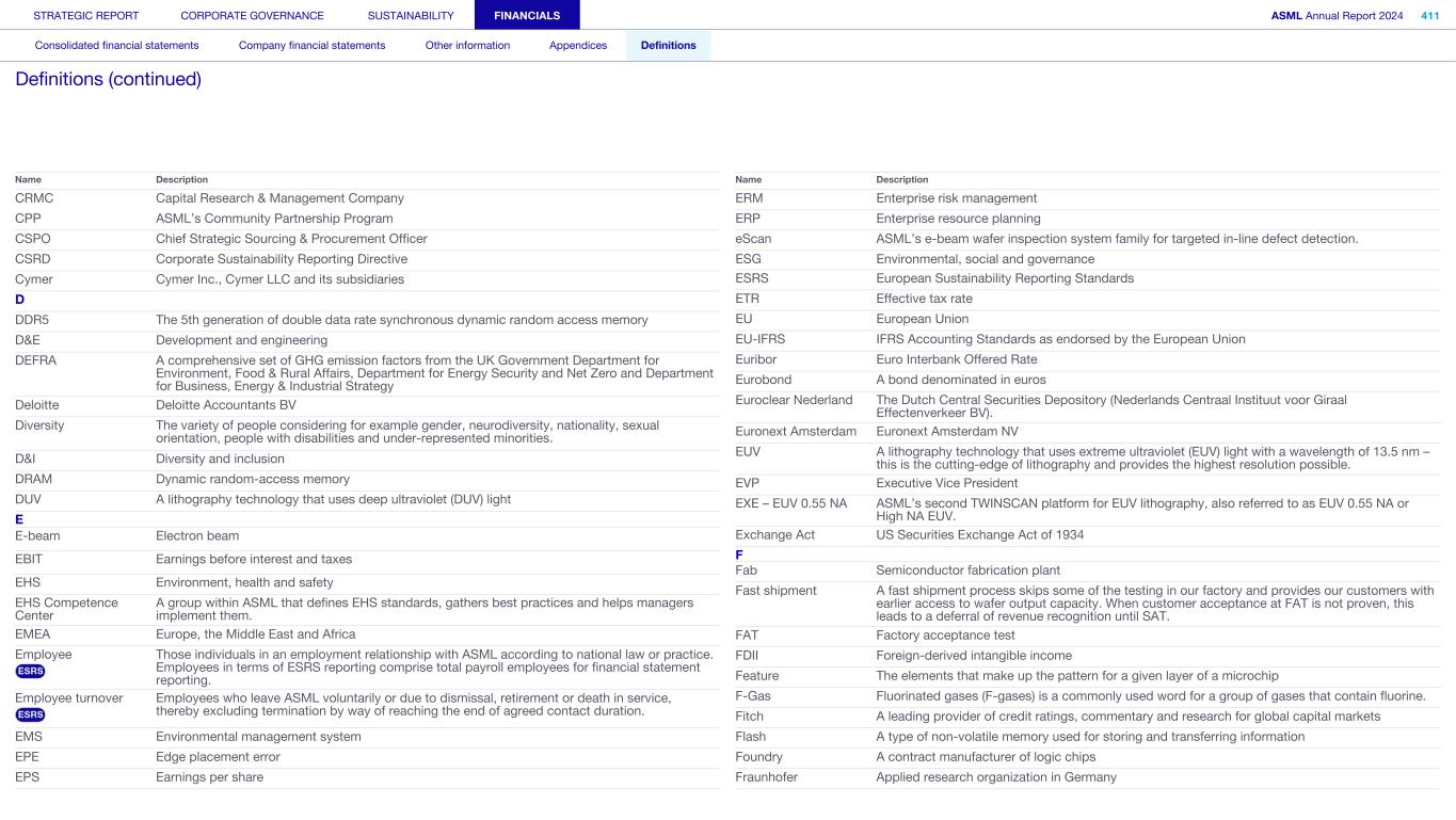 CRMC资本研究与管理公司CPP ASML的社区合作伙伴计划CSPO首席战略采购和采购官CSRD企业可持续发展报告指令Cymer Cymer Inc.、Cymer LLC及其子公司D DDR5第5代双数据速率同步动态随机存取存储器D & E开发和工程DEFRA英国政府环境、食品与农村事务部、能源安全和净零以及商业、能源与工业战略部德勤会计师事务所BV多样性综合考虑的人群多样性,例如性别、神经多样性、国籍,性取向、残疾人和代表性不足的少数群体。D & I多样性和包容性DRAM动态随机存取存储器DUV一种光刻技术,使用深紫外(DUV)光E电子束电子束息税前利润EHS环境、健康和安全EHS主管中心是ASML内的一个小组,负责定义EHS标准、收集最佳实践并帮助管理人员实施这些标准。EMEA欧洲、中东和非洲地区雇员那些根据国家法律或实践与ASML保持雇佣关系的个人。ESRS报告方面的员工包括财务报表报告的工资总额员工。员工更替自愿或因解雇、退休或服务期间死亡而离开ASML的员工,从而不包括以达到约定联系期限结束的方式终止的员工。EMS环境管理系统EPE边缘放置错误EPS每股收益名称说明ERM企业风险管理ERP企业资源规划eScan丨ASML的e-beam晶圆检测系统系列,用于有针对性的在线缺陷检测。ESG环境、社会和治理ESRS欧洲可持续发展报告准则ETR有效税率欧盟欧盟EU-IFRS国际财务报告准则认可的欧盟EU-IFRS会计准则以欧元计价的欧元Euribor欧元银行间同业拆借利率欧元债券A债券Euroclear Nederland The Dutch Central Securities存管机构(Nederlands Centraal Instituut voor Giraal EffectenVerkeer BV)。Euronext Amsterdam Euronext Amsterdam NV EUV一种使用波长为13.5 nm的极紫外(EUV)光的光刻技术——这是光刻技术的前沿,可提供尽可能高的分辨率。EVP执行副总裁EXE – EUV 0.55 NA ASML的第二个用于EUV光刻的TWINSCAN平台,也称为EUV 0.55 NA或High NA EUV。交易法1934年美国证券交易法F晶圆厂半导体制造厂快速出货快速出货过程跳过了我们工厂的一些测试,为我们的客户提供了更早获得晶圆输出产能的机会。当FAT的客户接受度没有得到证明时,这将导致收入确认推迟到SAT。FAT工厂验收测试FDII外资无形收入特征构成微芯片给定层F-Gas氟化气体(F-gases)图案的元素是一组含氟气体的常用词。惠誉为全球资本市场提供信用评级、评论和研究的领先提供商Flash一种用于存储和传输信息的非易失性存储器代工厂逻辑芯片的合同制造商德国弗劳恩霍夫应用研究机构名称描述战略报告公司治理可持续性财务ASML年度报告2024 411合并财务报表公司财务报表其他信息附录定义(续)