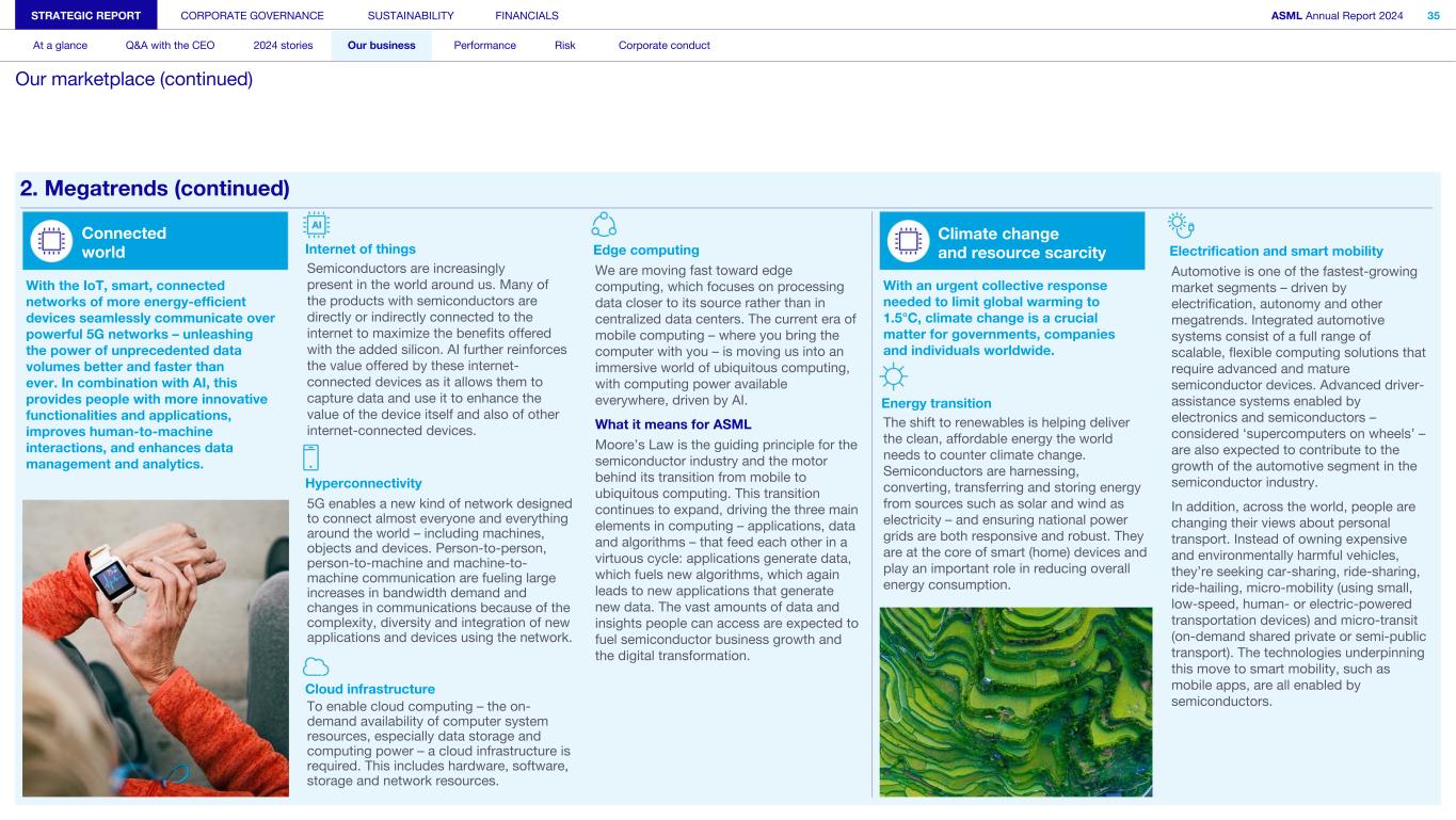 物联网半导体越来越多地出现在我们周围的世界中。许多带有半导体的产品直接或间接连接到互联网,以最大限度地发挥添加硅带来的好处。人工智能进一步加强了这些联网设备提供的价值,因为它允许它们捕获数据并使用数据来提高设备本身以及其他联网设备的价值。超连接5G实现了一种新型网络,旨在连接世界各地几乎所有人和一切——包括机器、物体和设备。由于使用网络的新应用和设备的复杂性、多样性和集成性,人对人、人对机器和机器对机器的通信正在推动带宽需求的大幅增长和通信的变化。云基础设施使能云计算——计算机系统资源的按需可用性,特别是数据存储和计算能力——需要云基础设施。这包括硬件、软件、存储和网络资源。边缘计算我们正在向边缘计算快速迈进,它专注于处理更接近其来源的数据,而不是在集中式数据中心。当前的移动计算时代——随身携带计算机——正将我们带入一个无处不在的计算沉浸式世界,在人工智能的驱动下,计算能力无处不在。它对于ASML摩尔定律意味着什么,对于半导体产业的指导原则,以及其从移动计算向泛在计算过渡背后的马达。这种转变继续扩大,推动了计算中的三个主要元素——应用程序、数据和算法——在良性循环中相互补充:应用程序产生数据,为新算法提供燃料,这再次导致产生新数据的新应用程序。人们可以访问的大量数据和洞察力有望推动半导体业务增长和数字化转型。气候变化和资源稀缺随着将全球变暖限制在1.5 ° C所需的紧急集体反应,气候变化对世界各地的政府、企业和个人来说都是至关重要的事情。能源转型向可再生能源的转变正在帮助提供全球应对气候变化所需的清洁、负担得起的能源。半导体正在利用、转换、转移和储存来自太阳能和风能等来源的能量作为电力——并确保国家电网既反应灵敏又稳健。它们是智能(家居)设备的核心,在降低整体能耗方面发挥着重要作用。电气化和智能移动汽车是增长最快的细分市场之一——受到电气化、自动驾驶和其他大趋势的推动。集成汽车系统由全系列可扩展、灵活的计算解决方案组成,这些解决方案需要先进和成熟的半导体设备。电子和半导体——被认为是‘车轮上的超级计算机’——支持的先进驾驶辅助系统也有望为半导体行业汽车细分市场的增长做出贡献。此外,在世界各地,人们正在改变他们对个人交通工具的看法。他们不再拥有昂贵且对环境有害的车辆,而是寻求汽车共享、拼车、叫车、微型出行(使用小型、低速、人力或电力驱动的交通工具)和微型交通(按需共享的私人或半公共交通工具)。移动应用程序等支撑这一向智能移动的技术,都是由半导体支持的。战略报告企业治理可持续发展金融家们ASML年度报告202435与CEO的问答一目了然2024年的故事我们的业务绩效风险企业行为我们的市场(续)通过物联网连接世界,由更节能的设备组成的智能连接网络通过强大的5G网络无缝通信——比以往任何时候都更好、更快地释放出前所未有的数据量的力量。结合AI,这为人们提供了更多创新功能和应用,改善了人与机器的交互,并增强了数据管理和分析。2.大趋势(续)