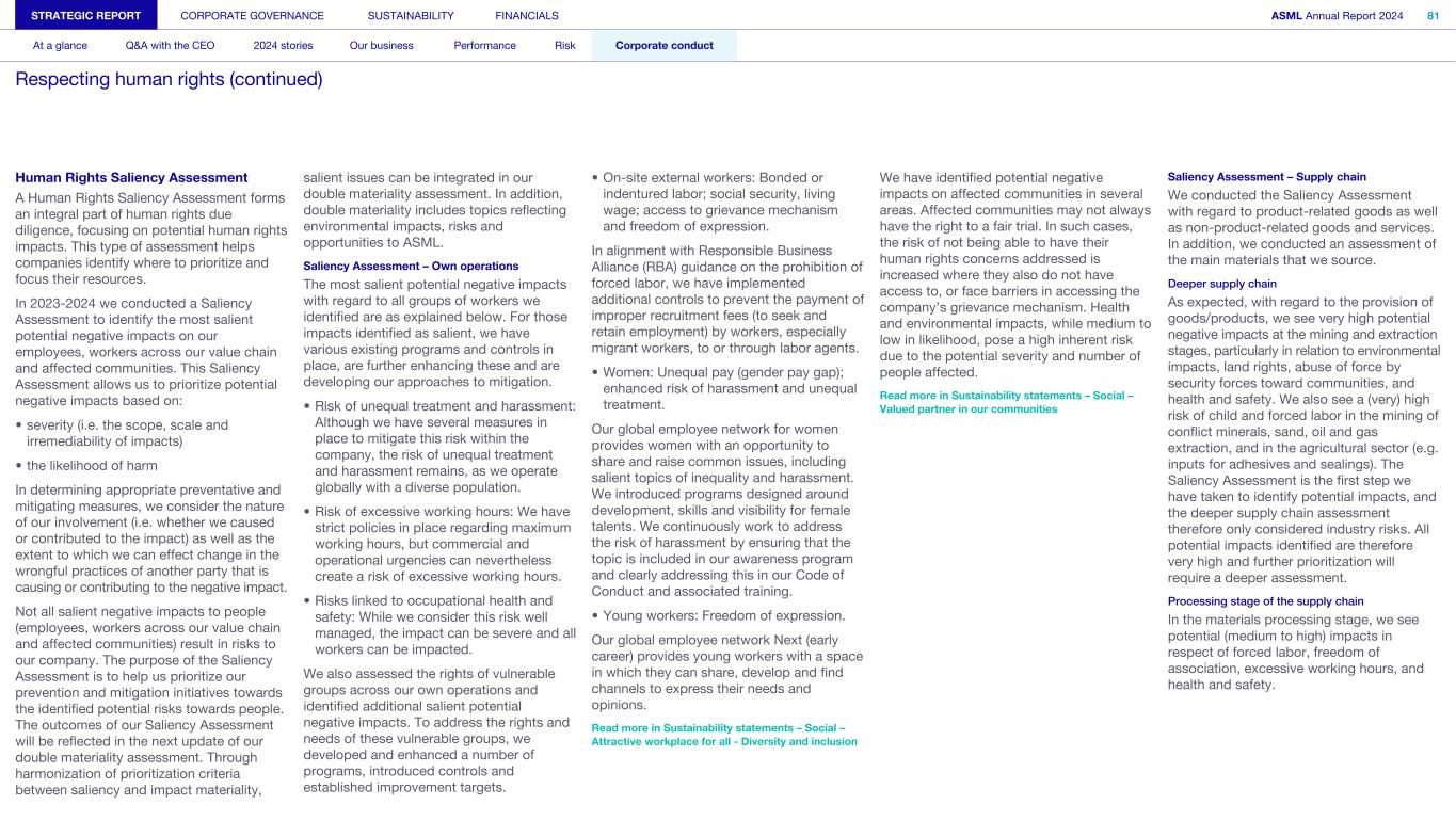 人权显著性评估A人权显著性评估是人权尽职调查的一个组成部分,重点关注潜在的人权影响。这种类型的评估有助于公司确定优先考虑的地方并集中其资源。在2023-2024年,我们进行了一次显着评估,以确定对我们的员工、整个价值链中的工人和受影响社区最显着的潜在负面影响。这一显着评估使我们能够根据以下因素确定潜在负面影响的优先顺序:•严重程度(即影响的范围、规模和不可补救性)•损害的可能性在确定适当的预防和减轻措施时,我们会考虑我们参与的性质(即我们是否造成或促成了影响)以及我们能够在多大程度上改变正在造成或促成负面影响的另一方的不法做法。并非所有对人(员工、我们价值链中的工人和受影响的社区)的显着负面影响都会给我们的公司带来风险。显着评估的目的是帮助我们将我们的预防和缓解举措优先用于已确定的对人们的潜在风险。我们的显着评估结果将反映在我们的双重重要性评估的下一次更新中。通过协调突出度和影响重要性之间的优先排序标准,可以将突出问题整合到我们的双重重要性评估中。此外,双重重要性还包括反映对ASML的环境影响、风险和机遇的主题。显着评估–自有运营我们确定的所有工人群体最显着的潜在负面影响如下所述。对于那些被确定为突出的影响,我们有各种现有的计划和控制措施,正在进一步加强这些计划和措施,并正在制定我们的缓解方法。•不平等待遇和骚扰风险:尽管我们在公司内部采取了几项措施来减轻这种风险,但不平等待遇和骚扰的风险仍然存在,因为我们在全球开展业务,拥有多样化的人口。•工作时间过长的风险:关于最长工作时间,我们制定了严格的政策,但商业和运营紧急情况仍可能造成工作时间过长的风险。•与职业健康和安全相关的风险:虽然我们认为这一风险得到了妥善管理,但影响可能很严重,所有工人都可能受到影响。我们还在我们自己的业务中评估了弱势群体的权利,并确定了其他显着的潜在负面影响。为了解决这些弱势群体的权利和需求,我们制定和加强了一些方案,引入了控制措施,并确立了改善目标。•现场外来工:保税或契约劳工;社会保障、生活工资;申诉机制准入和言论自由。根据负责任的商业联盟(RBA)关于禁止强迫劳动的指导意见,我们实施了额外的控制措施,以防止工人,特别是移民工人向或通过劳动代理人支付不正当的招聘费用(以寻求和保留就业)。•妇女:薪酬不平等(性别薪酬差距);骚扰和不平等待遇风险增加。我们面向女性的全球员工网络为女性提供了一个分享和提出共同问题的机会,包括不平等和骚扰的突出话题。我们为女性人才推出了围绕发展、技能和知名度设计的项目。我们不断努力解决骚扰风险,确保将该主题纳入我们的意识计划,并在我们的行为准则和相关培训中明确解决这一问题。•青年工人:言论自由。我们的全球员工网络Next(早期职业生涯)为年轻员工提供了一个空间,他们可以在其中分享、发展并找到表达需求和意见的渠道。阅读更多可持续发展声明–社会–对所有人都有吸引力的工作场所-多样性和包容性我们在几个领域确定了对受影响社区的潜在负面影响。受影响的社区可能并不总是有权获得公平审判。在这种情况下,如果他们也无法获得或在获得公司申诉机制方面面临障碍,则无法让他们的人权问题得到解决的风险就会增加。健康和环境影响虽然可能性中等到较低,但由于潜在的严重程度和受影响的人数,构成了很高的固有风险。阅读更多可持续发展声明–社会–我们社区中有价值的合作伙伴显着评估–供应链我们对与产品相关的商品以及与非产品相关的商品和服务进行了显着评估。此外, 我们对我们采购的主要材料进行了评估。正如预期的那样,在提供商品/产品方面,我们看到采矿和开采阶段的潜在负面影响非常高,特别是在环境影响、土地权、安全部队对社区滥用武力以及健康和安全方面。我们还看到,在冲突矿产的开采、沙子、石油和天然气开采以及农业部门(例如粘合剂和密封件的投入)中,童工和强迫劳动的风险(非常)高。显著性评估是我们为识别潜在影响而采取的第一步,因此更深层次的供应链评估只考虑了行业风险。因此,确定的所有潜在影响都非常高,进一步确定优先次序将需要进行更深入的评估。供应链的加工阶段在材料加工阶段,我们看到在强迫劳动、结社自由、工作时间过长以及健康和安全方面的潜在(中高)影响。战略报告企业治理可持续发展财务公司ASML年度报告202481与CEO问答一览2024故事我们的业务绩效风险尊重人权的企业行为(续)