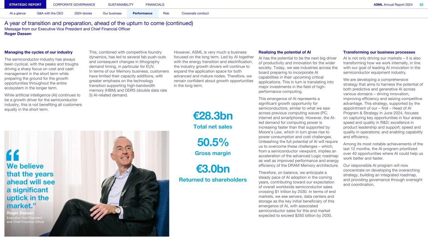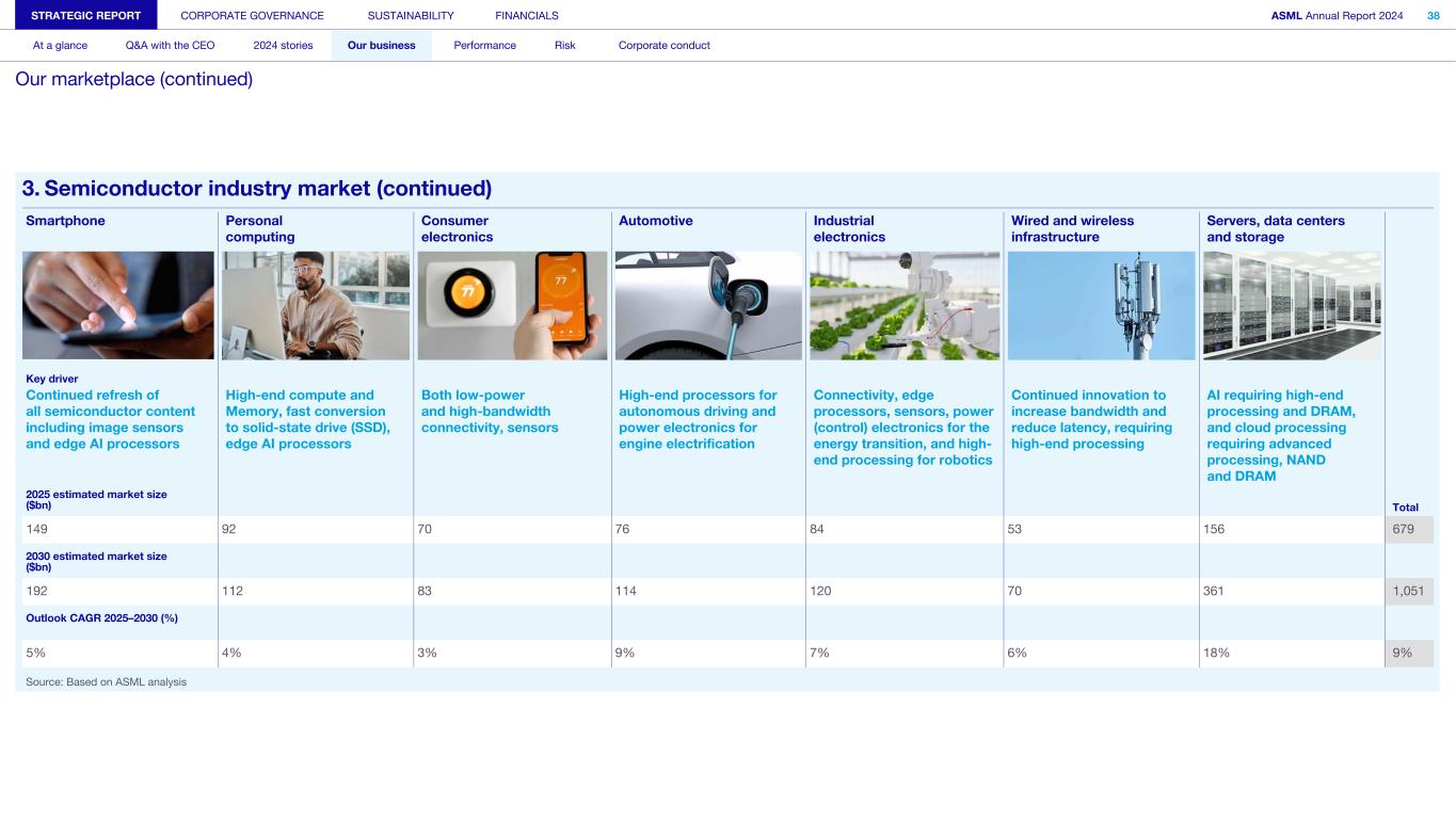 管理我们行业的周期半导体行业一直是周期性的,波峰和波谷在短期内推动了对成本和现金管理的高度关注,同时在长期内为整个生态系统的增长机会做好了准备。虽然人工智能(AI)继续成为半导体行业的增长动力,但这并没有在短期内平等地惠及所有客户。这与竞争性代工动态相结合,导致了几家晶圆厂的推出以及随之而来的光刻需求时间变化,特别是对于EUV。在我们的内存业务方面,客户的产能增加有限,更加强调支持高带宽内存(HBM)和DDR5(双倍数据速率5)AI相关需求的技术过渡。然而,ASML在很大程度上是一项着眼于长期的业务。在AI的引领下,加上能源转型和电气化,行业增长驱动力将持续扩大先进节点和成熟节点的应用空间。因此,我们对长期的增长机会仍然充满信心。实现AI的潜力AI有潜力成为更广泛社会的下一个生产力和创新的重要驱动力。今天,我们看到各行各业都在准备将AI功能纳入即将推出的关键应用程序中。这反过来又转化为对高性能计算领域的重大投资。人工智能的出现代表了半导体的重大增长机会,类似于我们在之前的计算浪潮(PC、互联网和智能手机)中看到的情况。然而,人工智能主导的计算能力需求增长速度超过了摩尔定律支持的需求,这反过来又带来了功耗和成本挑战。释放人工智能的全部潜力将需要我们克服这些挑战——从半导体的角度来看,这意味着先进的逻辑路线图的加速以及DRAM内存架构的性能和能效的提高。因此,总的来说,我们预计未来几年人工智能的采用速度将保持稳定,这有助于我们预计到2030年全球半导体整体销售额将突破1万亿美元。在终端市场方面,我们认为服务器、数据中心和存储是人工智能出现的关键初步受益者,预计到2030年,这一终端市场的相关半导体销售额将超过3500亿美元。改变我们的业务流程AI不仅推动了我们的市场——它还改变了我们的内部工作方式,这符合我们在半导体设备行业引领AI创新的目标。我们正在制定一项全面战略,旨在利用预测和生成人工智能在各个领域的潜力——推动创新、提高效率并抓住竞争优势。这一战略得到了我们于2024年6月任命的–首位– AI计划与战略负责人的支持,该战略侧重于抓住四个领域的关键机会:研发方面的速度和质量;产品领先和支持方面的卓越;运营方面的速度和质量;以及赋能能力和效率。在过去12个月最引人注目的成就中,人工智能项目优先考虑了超过40个机会,人工智能可以帮助我们更好、更快地工作。我们负责任的人工智能计划现在将专注于制定总体战略,构建一体化路线图,并通过监督和协调提供治理。战略报告公司治理可持续财务ASML年度报告202452与CEO的问答一目了然2024年的故事我们的业务绩效风险公司进行了一年的过渡和准备,领先于未来的好转(续)我们执行副总裁兼首席财务官 Roger Dassen的消息283亿欧元总净销售额50.5%毛利率30亿欧元返还股东“我们相信,未来几年市场将出现显着上升。”Roger Dassen执行副总裁兼首席财务官