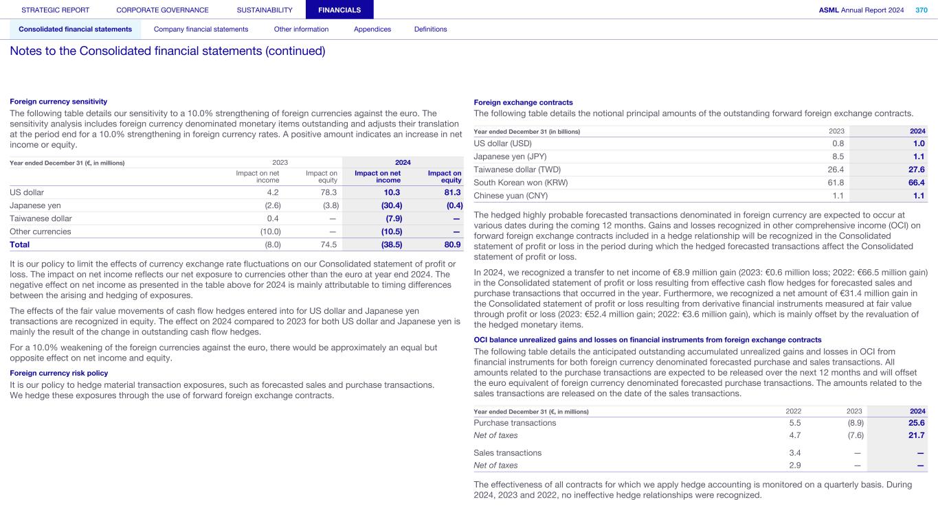 外汇敏感度下表详细列出了我们对外币兑欧元走强10.0%的敏感度。敏感性分析包括外币计价的未偿货币项目,并根据外币汇率走强10.0%调整其在期末的换算。金额为正表示净收入或权益增加。截至12月31日止年度(欧元,百万)20232024年对净收益的影响对权益的影响对净收益的影响对权益的影响美元4.278.3 10.38 1.3日元(2.6)(3.8)(30.4)(0.4)台币0.4 —(7.9)—其他货币(10.0)—(10.5)—合计(8.0)74.5(38.5)80.9我们的政策是限制货币汇率波动对我们的综合损益表的影响。对净收入的影响反映了我们在2024年底对欧元以外货币的净敞口。上表所列2024年净收入的负面影响主要归因于风险敞口的产生和对冲之间的时间差异。就美元和日元交易订立的现金流量套期公允价值变动的影响在权益中确认。与2023年相比,美元和日元对2024年的影响主要是未偿现金流对冲变化的结果。对于外币兑欧元贬值10.0%,将对净收入和权益产生大致相等但相反的影响。外汇风险政策对冲重大交易风险敞口是我们的政策,例如预测的销售和购买交易。我们通过使用远期外汇合约对冲这些风险敞口。外汇合约下表详细列出未偿还远期外汇合约的名义本金金额。截至12月31日止年度(十亿)20232024年美元(美元)0.8 1.0日元(日元)8.5 1.1台币(新台币)26.427.6韩元(韩元)61.866.4人民币(元)1.1 1.1以外币计价的被对冲极有可能的预测交易预计将在未来12个月的不同日期发生。计入套期关系的远期外汇合约在其他综合收益(OCI)中确认的损益将在被套期的预测交易影响合并损益表的期间在合并损益表中确认。2024年,我们在合并损益表中确认了890万欧元的净收益(2023年:60万欧元的亏损;2022年:6650万欧元的收益),这是由于对当年发生的预测销售和采购交易进行了有效的现金流对冲。此外,我们在综合损益表中确认了以公允价值计量且其变动计入损益的衍生金融工具产生的净收益3140万欧元(2023年:收益5240万欧元;2022年:收益360万欧元),这主要被被对冲货币项目的重估所抵消。外汇合约金融工具的OCI余额未实现损益下表详细列出了外币计价的预测采购和销售交易的金融工具的OCI预期未实现累计未实现损益。与购买交易相关的所有金额预计将在未来12个月内发布,并将抵消以外币计价的预测购买交易的欧元等值。与销售交易相关的金额在销售交易发生之日发布。截至12月31日止年度(欧元,百万)202220232024购买交易5.5(8.9)25.6税后净额4.7(7.6)21.7销售交易3.4 ——税后净额2.9 ——我们对其应用套期会计的所有合同的有效性按季度进行监测。在2024年、2023年和2022年期间,没有确认无效的套期关系。战略报告公司治理可持续发展财务ASML年度报告2024370合并财务报表公司财务报表其他信息附录定义合并财务报表附注(续)