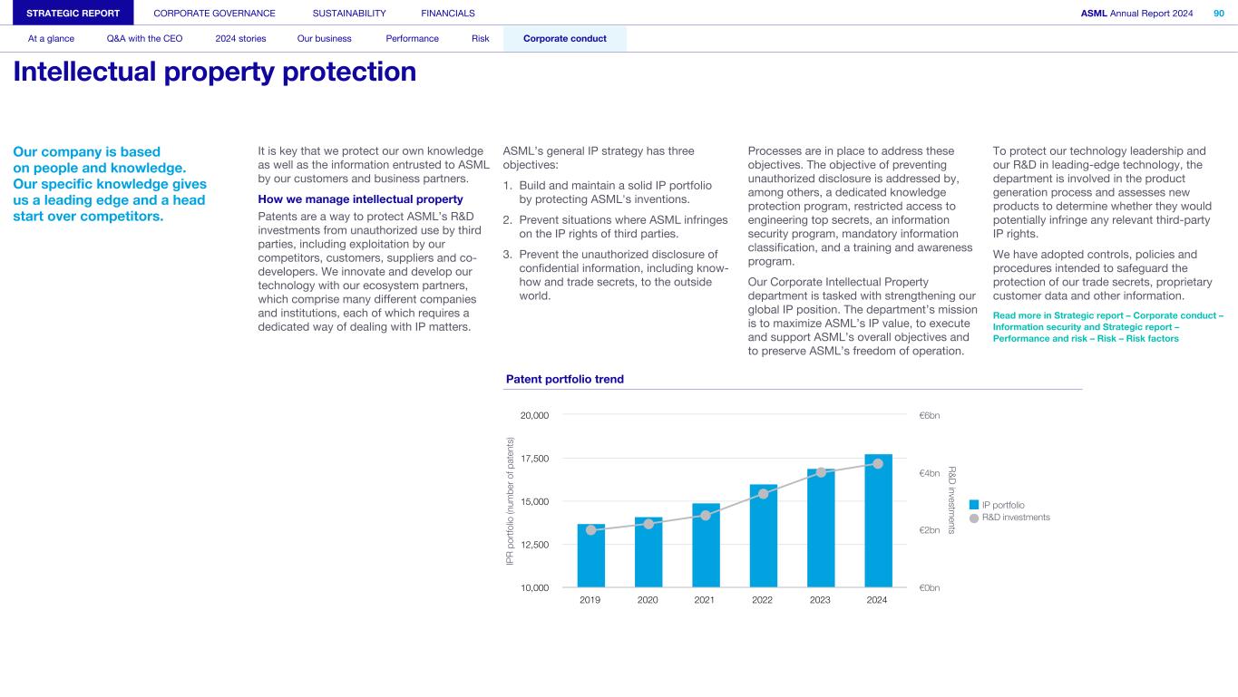 我们公司立足于人和知识。我们的具体知识给了我们领先优势和领先于竞争对手的领先优势。关键是我们要保护好自己的知识以及客户和业务合作伙伴委托给ASML的信息。我们如何管理知识产权专利是保护ASML的研发投资免受第三方未经授权使用的一种方式,包括被我们的竞争对手、客户、供应商和共同开发者利用。我们与我们的生态系统合作伙伴一起创新和开发我们的技术,这些合作伙伴包括许多不同的公司和机构,每一个都需要一种专门的方式来处理知识产权问题。ASML的一般IP战略有三个目标:1。通过保护ASML的发明,建立并维护一个稳固的IP组合。2.防范ASML侵犯第三方知识产权的情形。3.防止未经授权向外界泄露机密信息,包括专有技术和商业秘密。专利组合趋势IP R p或tfo lio(n um be r o f p at en ts)研发投资ents IP组合研发投资201920202021202220222023202410,00012,50015,00017,50020,000,000,000,000,000,000,000,000,000,000,000,000,000,000,000,000,000,000,000,000,000,000,000,000,000,000,000,000,000,000,000,000,000,防止未经授权披露的目标,除其他外,通过专门的知识保护计划、限制访问工程最高机密、信息安全计划、强制性信息分类以及培训和意识计划来解决。我们的企业知识产权部门的任务是加强我们的全球知识产权地位。该部门的使命是最大限度地发挥ASML的IP价值,执行和支持ASML的总体目标,并维护ASML的运营自由。为保护我们的技术领先地位和我们在前沿技术方面的研发,该部门参与产品生成过程并评估新产品以确定它们是否会潜在地侵犯任何相关的第三方知识产权。我们采取了旨在保护我们的商业秘密、专有客户数据和其他信息的控制、政策和程序。在战略报告中阅读更多内容–企业行为–信息安全和战略报告–绩效和风险–风险–风险因素战略报告企业治理可持续性财务202490年度报告与CEO问答一览2024故事我们的业务绩效风险企业行为知识产权保护