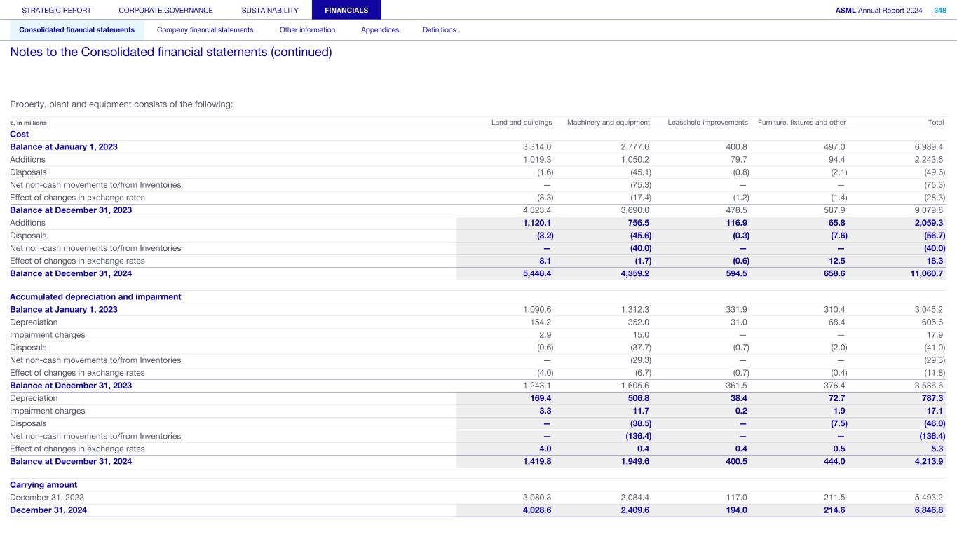 不动产、厂房和设备包括:2023年1月1日成本余额3,314.02,777.6400.84 97.06,989.4新增1,0 19.31,050.27 9.79 4.42,243.6处置(1.6)(45.1)(0.8)(2.1)(49.6)进出存货的非现金变动净额——(75.3)——(75.3)汇率变动的影响(8.3)(17.4)(1.2)(1.4)(28.3)2023年12月31日余额4,323.43,690.04 78.5587.99,079.8新增1,120.17 56.51 16.96 5.82,059.3处置(3.2)(45.6)(0.3)(7.6)(56.7)进出存货的非现金变动净额——(40.0)——(40.0)汇率变动的影响8.120245,448.44,359.2594.5658.61 1,0 60.7 2023年1月1日累计折旧和减值余额1,090.61,312.33 31.93 10.43,045.2折旧154.23 52.03 1.068.4605.6减值费用2.9 15.0 —— 17.9处置(0.6)(37.7)(0.7)(2.0)(41.0)进出存货的非现金变动净额——(29.3)——(29.3)汇率变动的影响(4.0)(6.7)(0.7)(0.4)(11.8)12月31日余额,20231,243.11,605.63 61.5 376.43,586.6折旧169.45 06.838.47 2.77 87.3减值费用3.31 1.7 0.2 1.91 7.1处置—(38.5)—(7.5)(46.0)进出存货的非现金变动净额—(136.4)——(136.4)汇率变动的影响4.0 0.4 0.4 0.55.3 2024年12月31日余额1,419.81,949.6400.54 44.04,213.9账面金额2023年12月31日3,080.32,084.41 17.02 11.55,493.22024年12月31日4,028.62,409.6 194.02 14.66,846.8欧元,单位:百万土地和建筑物机械设备租赁物改良家具,夹具和其他总战略报告公司治理可持续发展财务ASML年度报告2024348合并财务报表公司财务报表其他信息附录定义合并财务报表附注(续)