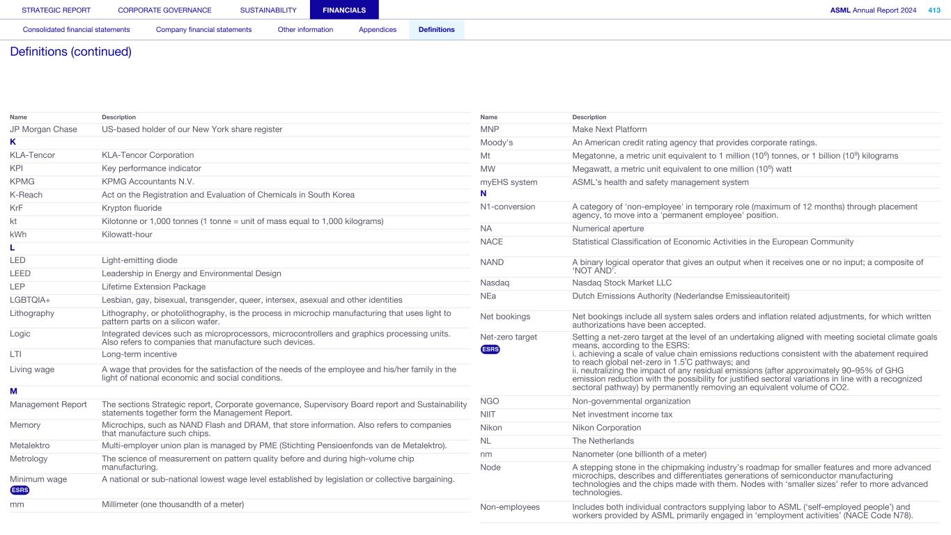 摩根大通纽约股票登记册K KLA-Tencor KLA-Tencor Corporation KPI关键绩效指标KPMG KPMG Accountants N.V. K-Reach Act on the Registration and Evaluation of Chemicals in South Korea KrF Krypton Fluoride kt kilotonne or 1,000 tons(1 tonne =单位质量等于1,000 kg)kWh kWh kWh L LED发光二极管LEED Leadership in Energy and Environmental Design LEP Lifetime Extension Package LGBTQIA +女同性恋、男同性恋、双性恋、跨性别、双性人、无性和其他身份Lithography,或photolithography,是微芯片制造中使用光对硅片上的零件进行图案化的工艺。逻辑集成器件,如微处理器、微控制器和图形处理单元。也指制造这类设备的公司。LTI长期激励生活工资结合国民经济和社会状况,提供满足职工及其家庭需要的工资。M管理层报告部分战略报告、公司治理、监事会报告和可持续发展声明共同构成管理层报告。存储信息的内存微芯片,如NAND Flash和DRAM。也指制造这类芯片的公司。Metalektro多雇主工会计划由PME(Stichting Pensioenfonds van de Metalektro)管理。计量大批量芯片制造前和过程中对图案质量的测量科学。最低工资由立法或集体谈判确定的全国或次全国最低工资水平。mm毫米(千分之一米)名称说明MNP Make Next Platform 穆迪是一家提供企业评级的美国信用评级机构。Mt Megatonne,一个公制单位相当于100万(106)吨,或10亿(109)公斤MW兆瓦,一个公制单位相当于一百万(106)瓦myEHS系统ASML的健康和安全管理系统N N1-通过安置代理转换为临时角色(最长12个月)的一类‘非雇员’,以转入‘永久雇员’职位。NA数值孔径NACE欧洲共同体经济活动统计分类NAND一种二元逻辑算子,当它收到一个或没有输入时给出一个输出;‘NOT AND’的合成。纳斯达克纳斯达克 Stock Market LLC NEa Dutch Emissions Authority(Nederlandse Emissieautoriteit)净预订量净预订量包括所有系统销售订单和与通货膨胀相关的调整,目前已接受书面授权。净零目标根据ESRS,在与实现社会气候目标相一致的事业水平上设定净零目标意味着:一是实现与在1.5 ° C路径中达到全球净零所需的减排一致的价值链减排规模;二是通过永久去除等量的二氧化碳来中和任何剩余排放的影响(在进行了大约90 – 95%的GHG减排并有可能根据公认的部门路径进行合理的部门变化之后)。NGO非政府组织NIIT净投资所得税尼康尼康公司NL荷兰nm纳米(十亿分之一米)节点是芯片制造行业更小特性和更先进微芯片路线图的敲门砖,它描述并区分了几代半导体制造技术以及用它们制造的芯片。‘尺寸更小’的节点指的是更先进的技术。非雇员包括向ASML(‘个体经营者’)提供劳动力的个人承包商和主要从事‘就业活动’(NACE代码N78)的由ASML提供的工人。名称说明战略报告公司治理可持续发展财务ASML年度报告2024413合并财务报表公司财务报表其他信息附录定义(续)