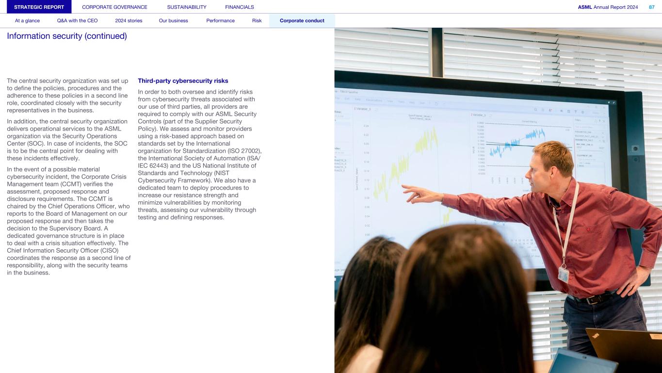 中央安全组织成立,以二线角色界定这些政策、程序和遵守这些政策,与业务中的安全代表密切协调。此外,中央安全组织通过安全运营中心(SOC)向ASML组织提供运营服务。在发生事件时,SOC要成为有效处理这些事件的中心点。如果发生可能的重大网络安全事件,企业危机管理团队(CCMT)将核实评估、提议的响应和披露要求。CCMT由首席运营官担任主席,他向管理委员会报告我们提出的回应,然后将决定提交给监事会。建立专门的治理结构,有效应对危机局势。首席信息安全官(CISO)与业务中的安全团队一起作为第二条责任线协调响应。第三方网络安全风险为了监督和识别与我们使用第三方相关的网络安全威胁带来的风险,所有提供商都必须遵守我们的ASML安全控制(供应商安全政策的一部分)。我们根据国际标准化组织(ISO 27002)、国际自动化协会(ISA/IEC 62443)和美国国家标准与技术研究院(NIST Cybersecurity Framework)制定的标准,使用基于风险的方法评估和监测供应商。我们还有一个专门的团队来部署程序,通过监测威胁、通过测试和定义响应评估我们的脆弱性来增加我们的抵抗强度并最大限度地减少漏洞。战略报告企业治理可持续发展财务ASML年度报告2024 87与CEO的一览问答2024故事我们的业务绩效风险企业行为信息安全(续)