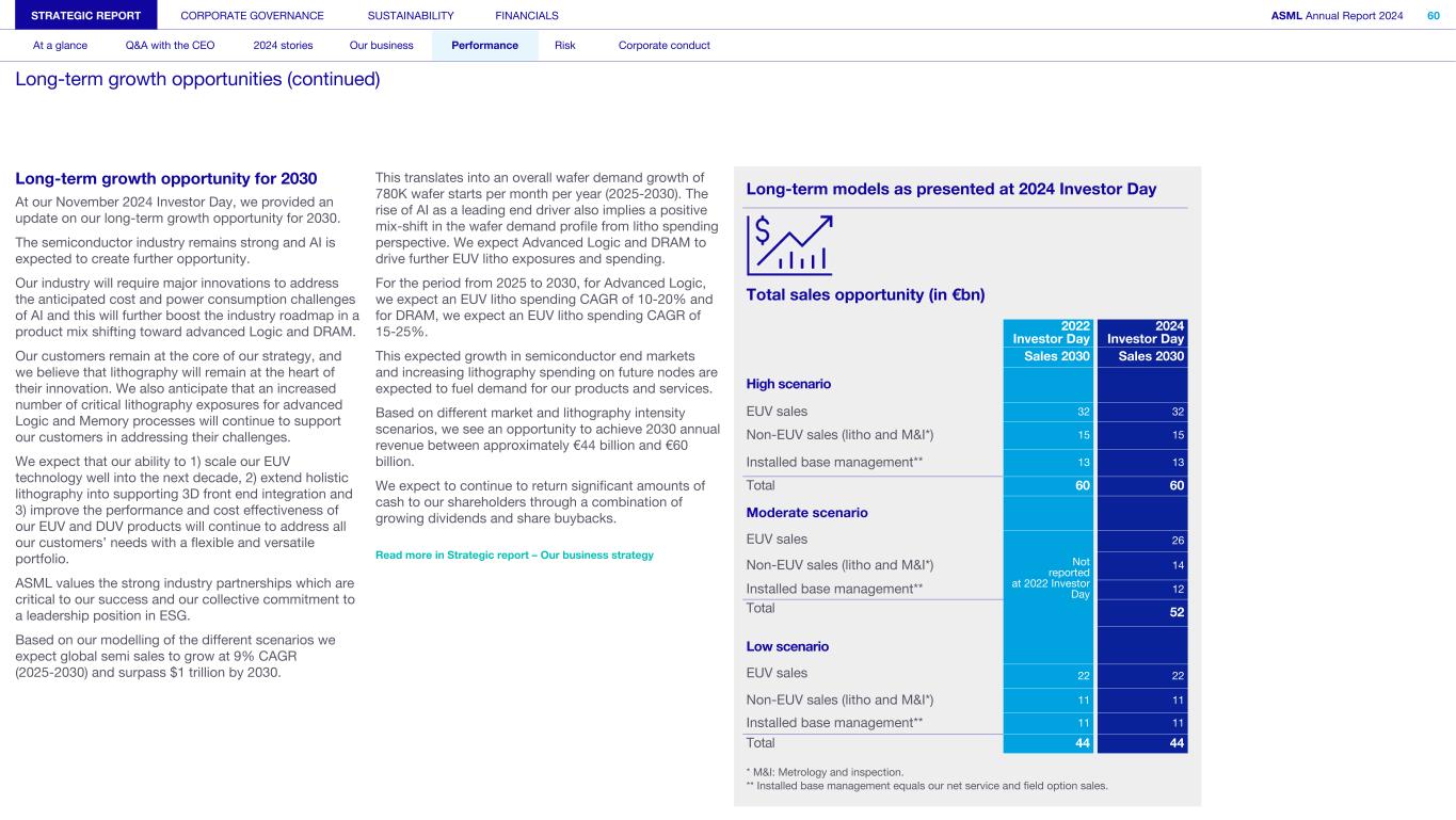 2030年的长期增长机会在2024年11月的投资者日上,我们提供了关于2030年长期增长机会的最新信息。半导体行业保持强劲,AI有望创造进一步机会。我们的行业将需要重大创新,以应对人工智能预期的成本和功耗挑战,这将进一步推动产品组合向先进逻辑和DRAM转变的行业路线图。我们的客户仍然是我们战略的核心,我们相信光刻技术仍将是他们创新的核心。我们还预计,更多用于先进逻辑和内存工艺的关键光刻曝光将继续支持我们的客户应对他们的挑战。我们预计,我们的能力1)将我们的EUV技术很好地扩展到下一个十年,2)将整体光刻扩展到支持3D前端集成,以及3)提高我们的EUV和DUV产品的性能和成本效益,将继续以灵活和多功能的产品组合满足客户的所有需求。ASML重视强大的行业合作伙伴关系,这对我们的成功以及我们对ESG领导地位的集体承诺至关重要。根据我们对不同情景的建模,我们预计全球半导体销售额将以9%的复合年增长率(2025-2030年)增长,到2030年将超过1万亿美元。这转化为每年(2025-2030年)每月780K晶圆开工的整体晶圆需求增长。人工智能作为领先的终端驱动因素的崛起,也意味着从litho支出的角度来看,晶圆需求状况出现了积极的混合转变。我们预计Advanced Logic和DRAM将推动进一步的EUV litho曝光和支出。对于2025-2030年,对于Advanced Logic,我们预计EUV litho支出CAGR为10-20 %,对于DRAM,我们预计EUV litho支出CAGR为15-25 %。半导体终端市场的这种预期增长以及未来节点上光刻支出的增加预计将推动对我们产品和服务的需求。基于不同的市场和光刻强度场景,我们看到了在2030年实现年收入约440亿欧元至600亿欧元之间的机会。我们预计将通过不断增长的股息和股票回购相结合的方式,继续向我们的股东返还大量现金。在战略报告中阅读更多内容–我们在2024年投资者日上提出的业务战略长期模型总销售机会(十亿欧元)2022年投资者日2024年投资者日销售额2030销售额2030高情景C M EUV销售额3232非EUV销售额(litho和M & I*)1515已安装底座管理**1313总计6060中等情景EUV销售未在2022年投资者日报告26非EUV销售(litho和M & I*)14已安装底座管理**12总计52低场景6 EUV销量2222非EUV销量(litho和M & I*)1111已安装底座管理**1111合计4444*M & I:计量检测。**已安装的基地管理等于我们的净服务和现场期权销售。战略报告企业治理可持续发展财务ASML年度报告202460一览与CEO的问答2024故事我们的业务绩效风险企业行为长期增长机会(续)