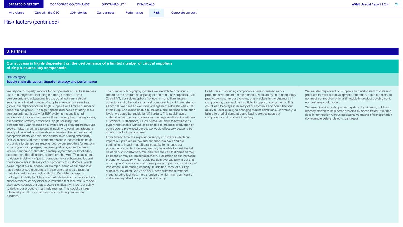 3.合作伙伴我们的成功高度依赖于有限数量的单一来源关键组件关键供应商的表现风险类别:供应链中断、供应商战略和绩效我们依赖第三方供应商提供我们系统中使用的组件和子组件,包括其设计。这些组件和子组件是从单一供应商或数量有限的供应商处获得的。随着我们业务的增长,我们对单一供应商或数量有限的供应商的依赖也在增长。我们的许多组件的高度专业化性质,特别是对于EUV系统,意味着从多个供应商采购是不经济的。在很多情况下,我们的采购策略规定了‘单一采购,双重能力’。我们对有限的一组供应商的依赖涉及几个风险,包括可能无法及时以可接受的成本获得所需组件或子组件的充足供应,以及对定价和质量的控制减少。由于我们的供应商因停工、火灾、能源短缺和准入问题、大流行病爆发、洪水、网络攻击、封锁、破坏或其他自然灾害或其他原因而经历的中断,这些组件和子组件的供应可能会出现延迟。这可能会导致零件、组件或子组件的交付延迟,从而导致我们向客户交付产品的延迟,这可能会影响我们的业务。例如,由于材料短缺和网络攻击,我们的一些供应商的运营出现了中断。持续的延误或长期无法获得足够的组件或子组件交付,或任何其他需要我们寻求替代供应来源的情况,都可能严重阻碍我们及时交付产品的能力。这可能会损害与我们客户的关系,并对我们的业务产生重大影响。我们能够生产的光刻系统数量受到我们的主要供应商之一卡尔蔡司SMT的产能的限制,卡尔蔡司SMT是我们唯一的透镜、镜子、照明器、采集器和其他关键光学组件(我们将其称为光学器件)的供应商。我们与卡尔·蔡司SMT有独家安排。如果这家供应商变得无法维持和提高生产水平,我们可能无法履行订单。这可能会对我们的业务产生实质性影响,并损害与客户的关系。此外,如果Carl Zeiss SMT终止与我们的供应关系或无法长期维持光学产品的生产,我们实际上将无法开展我们的业务。我们不时遇到供应限制,这可能会影响我们的生产。我们和我们的供应商已经并正在继续投资于额外的产能,以提高我们的产能。然而,我们可能无法满足客户的全部需求。我们还面临需求可能减少或可能不足以充分利用我们增加的产能的风险,这可能导致我们和我们的供应商的运营出现产能过剩,从而导致更高的成本和增加产能的投资损失。此外,我们的大多数关键供应商,包括卡尔蔡司SMT,拥有数量有限的制造设施,其中断可能会对我们的产能产生重大不利影响。随着我们的产品变得更加复杂,获得组件的交货时间增加了。我们未能充分预测对我们系统的需求,或组件发货的任何延迟,都可能导致组件供应不足。这可能会导致我们的系统交付延迟,并可能限制我们对不断变化的市场条件做出快速反应的能力。相反,未能预测需求可能会导致组件供应过剩和库存过时。我们还依赖供应商开发新的模型和产品,以满足我们的发展路线图。如果我们的供应商在产品开发方面不符合我们的要求或时间表,我们的业务可能会受到影响。我们历来通过飞机运送我们的系统,但最近开始通过海运运送一些系统。我们面临与使用替代运输工具相关的风险(例如延误、缺陷、损坏)。战略报告公司治理可持续发展财务ASML年度报告202471与CEO的一览问答2024故事我们的业务绩效风险公司行为风险因素(续)