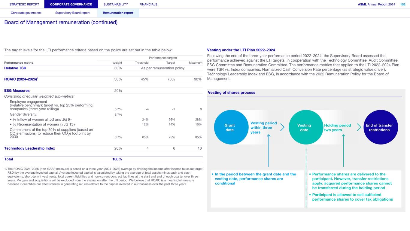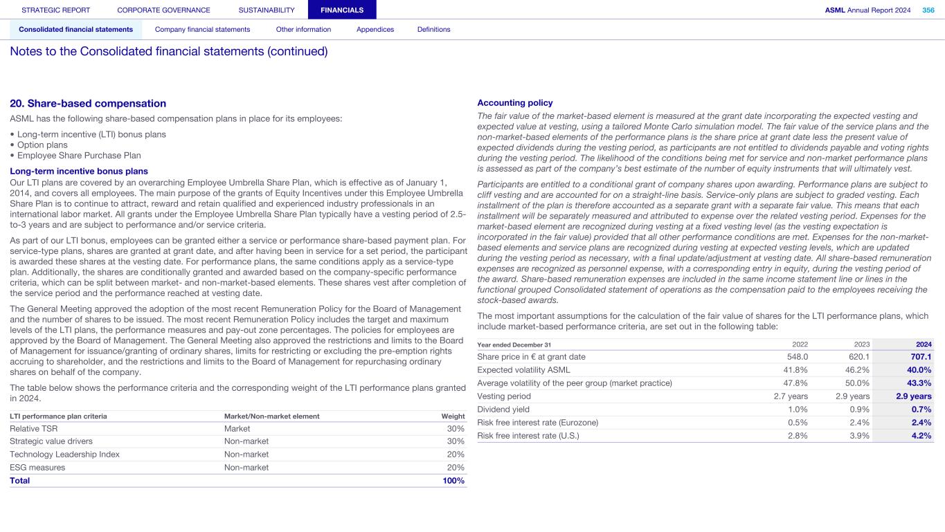 20.基于股份的薪酬ASML为其员工制定了以下基于股份的薪酬计划:•长期激励(LTI)奖金计划•期权计划•员工股份购买计划长期激励奖金计划我们的LTI计划由总体员工保护伞股份计划覆盖,该计划自2014年1月1日起生效,涵盖所有员工。根据本员工伞式股份计划授予股权激励的主要目的是在国际劳动力市场上继续吸引、奖励和留住合格和有经验的行业专业人士。员工伞式股份计划下的所有授予通常具有2.5至3年的归属期,并受业绩和/或服务标准的约束。作为我们LTI奖金的一部分,员工可以被授予服务或绩效份额支付计划。对于服务型计划,在授予日授予股份,在服务了一段时间后,参与者在归属日获得这些股份。对于绩效计划,适用与服务型计划相同的条件。此外,这些股份还根据公司特定的业绩标准有条件地授予和授予,这些标准可以分为市场和非市场要素。该等股份于服务期届满及于归属日达成业绩后归属。股东大会批准通过管理委员会的最新薪酬政策和发行股份数量。最新的薪酬政策包括LTI计划的目标和最高水平、绩效衡量标准和支付区域百分比。有关雇员的政策由管理委员会批准。股东大会还批准了对管理委员会发行/授予普通股的限制和限制、对限制或排除股东产生的优先购买权的限制以及对管理委员会代表公司回购普通股的限制和限制。下表显示了2024年授予的LTI绩效计划的绩效标准和相应权重。LTI绩效计划标准市场/非市场要素权重相对TSR市场30%战略价值驱动因素非市场30%技术领先指数非市场20% ESG衡量非市场20%合计100%会计政策基于市场的要素的公允价值在授予日计量时包含预期归属和归属时的预期价值,使用定制的蒙特卡罗模拟模型。服务计划和业绩计划的非市场要素的公允价值是授予日的股价减去归属期内预期股息的现值,因为参与者在归属期内无权获得应付股息和投票权。服务和非市场绩效计划满足条件的可能性作为公司对最终归属的权益工具数量的最佳估计的一部分进行评估。参与者有权在授予时有条件授予公司股份。业绩计划实行断崖式归属,按直线法核算。仅服务计划受分级归属约束。因此,该计划的每一期均作为单独的赠款入账,并具有单独的公允价值。这意味着,每一期将单独计量,并在相关归属期内计入费用。在满足所有其他业绩条件的情况下,基于市场的要素的费用在归属时按固定归属水平确认(因为归属预期已计入公允价值)。非市场要素和服务计划的费用在归属期间按预期归属水平确认,必要时在归属期内更新,并在归属日期进行最终更新/调整。所有以股份为基础的薪酬费用在奖励归属期内确认为人员费用,并在权益中有相应的分录。以股份为基础的薪酬支出与支付给接受以股票为基础的奖励的员工的薪酬一样,包含在职能分组合并经营报表的同一损益表项目或项目中。LTI业绩计划计算股票公允价值的最重要假设,其中包括基于市场的业绩标准, 下表列出:截至2022年12月31日止年度202220232024年授予日股价(欧元)548.06 20.17 07.1预期波动率ASML 41.8% 46.2% 40.0%同业集团平均波动率(市场惯例)47.8% 50.0% 43.3%归属期2.7年2.9年2.9年股息收益率1.0% 0.9% 0.7%无风险利率(欧元区)0.5% 2.4% 2.4%无风险利率(美国)2.8% 3.9% 4.2%战略报告公司治理可持续发展金融界丨ASML丨2024356年度合并财务报表公司财务报表其他信息附录定义合并财务报表附注(续)