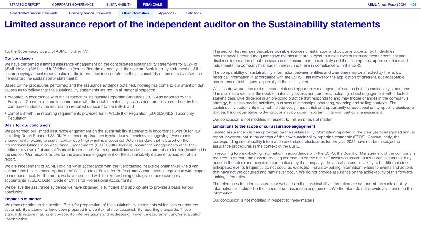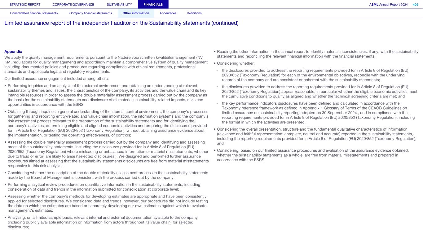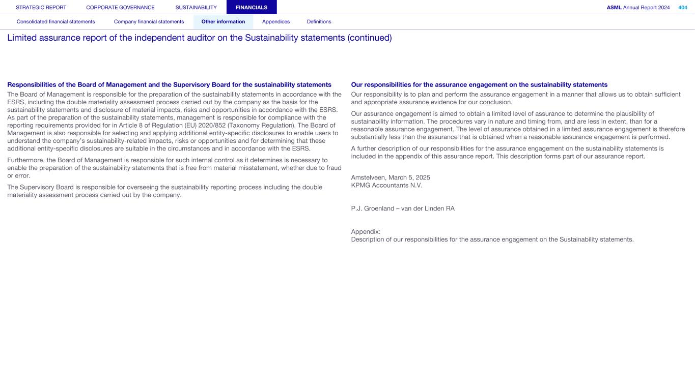 管理委员会和监事会对可持续发展声明的责任管理委员会负责根据ESRS编制可持续发展声明,包括公司进行的双重重要性评估过程,作为可持续发展声明的基础,并根据ESRS披露重大影响、风险和机会。作为编制可持续性声明的一部分,管理层有责任遵守条例(EU)2020/852(分类条例)第8条规定的报告要求。管理委员会还负责选择和应用额外的特定实体披露,以使用户能够了解公司与可持续发展相关的影响、风险或机会,并负责确定这些额外的特定实体披露是否适合特定情况并符合ESRS。此外,管理委员会负责其认为必要的内部控制,以使编制的可持续性报表不存在重大错报,无论是由于欺诈还是错误。监事会负责监督可持续发展报告流程,包括公司开展的双重重要性评估流程。我们对可持续发展报表上的鉴证业务的责任我们的责任是以一种使我们能够为我们的结论获得充分和适当的鉴证证据的方式规划和执行鉴证业务。我们的保证参与旨在获得有限程度的保证,以确定可持续性信息的合理性。与合理的鉴证业务相比,这些程序在性质和时间上有所不同,而且程度较小。因此,在有限保证业务中获得的保证水平大大低于在执行合理保证业务时获得的保证。本鉴证报告附录进一步描述了我们对可持续发展声明的鉴证业务的责任。本说明构成我们鉴证报告的一部分。阿姆斯特丹,2025年3月5日KPMG Accountants N.V. P.J. Groenland – van der Linden RA Appendix:Description of our responsibilities for the assurance engagement on the Sustainability statements。战略报告公司治理可持续发展财务ASML年度报告2024404合并财务报表公司财务报表其他信息附录定义独立审计师关于可持续发展报表的有限鉴证报告(续)