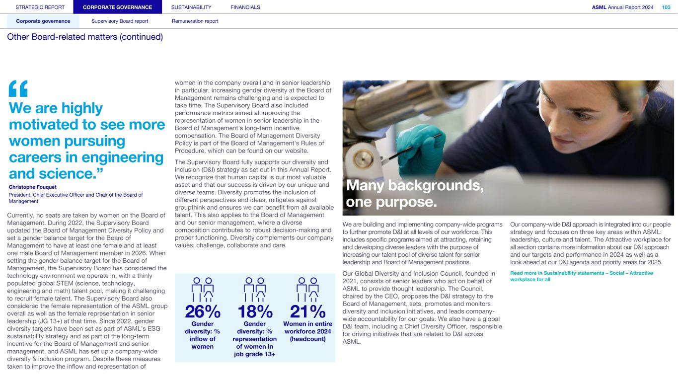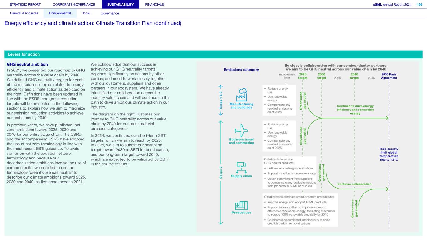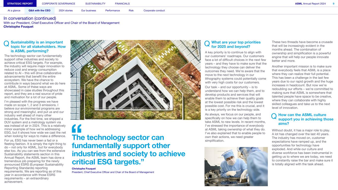 问可持续发展是所有利益相关方的重要课题。ASML的表现如何?科技部门可以从根本上支持其他行业和社会实现关键的ESG目标。例如,该行业将需要重大创新来降低与人工智能相关的成本和能源消耗——这将推动有利于整个生态系统的协作进步。我们有机会以超出我们在ASML所做工作的方式做出贡献。这些方式中的一些在本报告通篇的案例研究中得到了展示,它们是我们很多人真正的骄傲和动力来源。我对我们在范围1、2和3排放方面取得的进展感到高兴。我相信我们的环保计划是强大和有意义的,并使我们和我们的行业远远领先于许多其他行业。2024年,我们首次通过海运而不是空运运送了DUV系统和计量系统。这是我们如何应对ESG的一个相对较小的例子,但它表明了我们在寻找有所作为的方法时撒下的网有多广。对我们来说,ESG从来就不是一种时尚,也不是一种稍纵即逝的时尚。这完全是正确的做法——不仅对ASML如此,对其他所有人也是如此。从这份年度报告中内容丰富的可持续发展声明部分可以看出,ASML团队为迎接新公布的ESRS(欧洲可持续发展报告标准)报告要求做了大量的准备工作。截至今年,我们正在根据这些ESRS要求进行报告——这是一项非凡的成就。问:你们在2025年及以后的首要任务是什么?一个关键的优先事项是继续与客户的路线图保持一致。我们的客户在未来几年面临很多艰难的选择——他们必须确保他们选择的技术能够提供他们需要的结果。我们意识到,在我们的光刻系统中转向下一种技术可能会给我们的客户带来非常高的成本。我们的任务——也是我们的机会——是了解我们如何帮助他们,并开发产品和服务,使他们能够以尽可能低的风险和尽可能低的成本实现其质量目标。对我来说,这是至关重要的,这是技术方面的关键优先事项。与往常一样,我们关注的是我们的员工,特别是我们可以如何帮助他们将ASML提升到新的水平。近几个月来,我强调了ASML每个人对自己所做工作拥有自主权的重要性。我还解释过,要让人们拥有自己的行为,我们需要更多的简化。这两条线索已成为一场十字军东征,在未来几个月将越来越明显。所有权与简单化相结合,是一台强大的引擎,将帮助我们的人民更好、更多地进行创新。另一个重要的使命是确保每个人都觉得ASML是一个可以充分发挥自己潜力的地方。由于我们的快速增长和员工人数的大幅增加,这在过去几年中一直是一个挑战。但现在我们加倍努力——我们致力于确保ASML是有才华的人有发挥创造力的空间的地方,在那里他们可以与技术精湛的同事合作,将我们带到新的创新水平。Q ASML文化如何支持您实现这些目标?毫无疑问,它可以发挥重大作用。过去40年发生了很大变化。行业前行,客户期待升温,科技机会爆发。尽管我们的文化和多样化的员工队伍在帮助我们取得今天的成就方面发挥了重要作用,但我们需要不断提高标准,并确保它与未来的任务完全一致。战略报告公司治理可持续发展财务ASML年度报告20249一览与首席执行官的问答2024故事我们的业务绩效风险与我们的总裁、首席执行官兼管理委员会主席Christophe Fouquet对话(续)中的公司行为科技部门可以从根本上支持其他行业和社会实现关键的ESG目标。”Christophe Fouquet总裁、首席执行官兼管理委员会主席