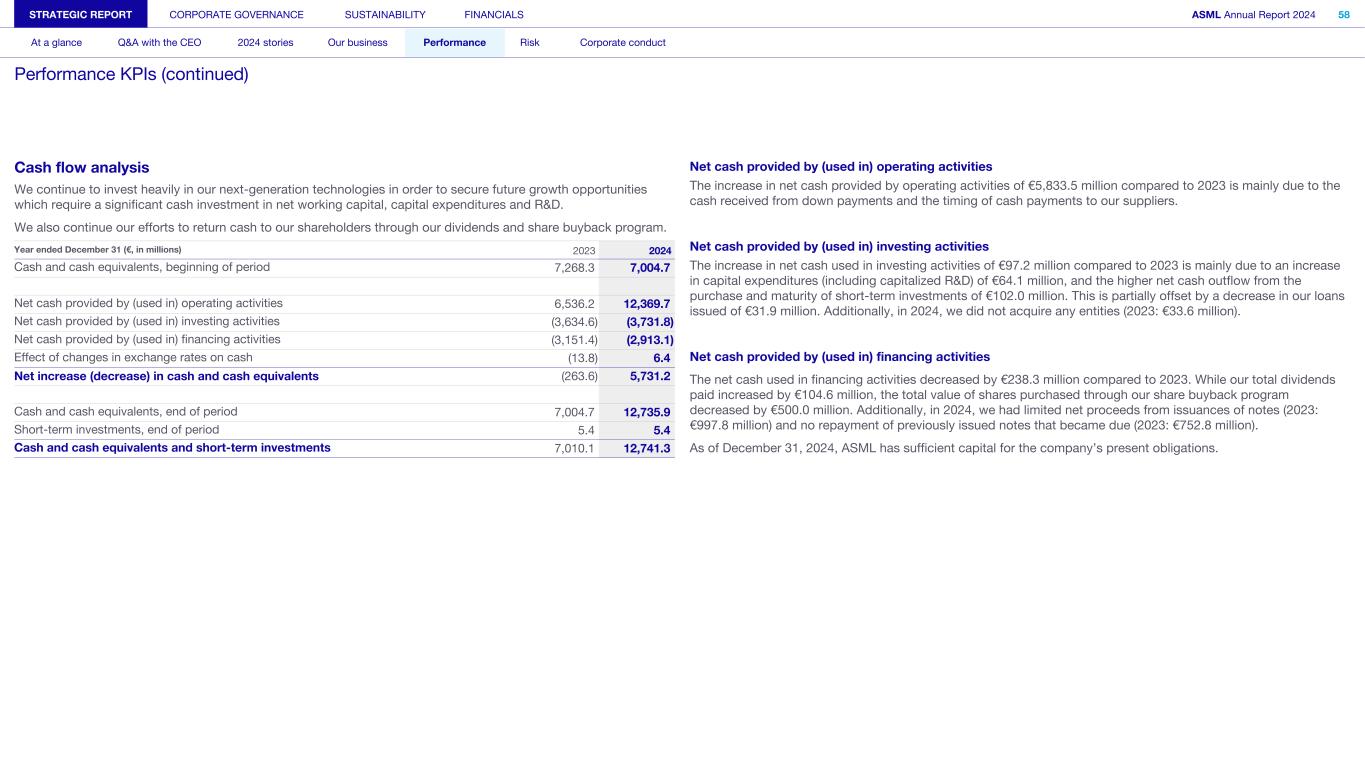 现金流分析我们继续大力投资于我们的下一代技术,以确保未来的增长机会,这需要在净营运资本、资本支出和研发方面进行大量现金投资。我们还继续努力通过我们的股息和股票回购计划向股东返还现金。截至12月31日止年度(欧元,百万)20232024期初现金及现金等价物7,268.37,004.7经营活动提供(用于)的现金净额6,536.212,369.7投资活动提供(用于)的现金净额(3,634.6)(3,731.8)筹资活动提供(用于)的现金净额(3,151.4)(2,913.1)汇率变动对现金的影响(13.8)6.4现金及现金等价物净增加(减少)(263.6)5,731.2现金及现金等价物,期末7,004.712,735.9短期投资,期末5.45.4现金及现金等价物和短期投资7,0 10.112,741.3经营活动提供(用于)的现金净额与2023年相比,经营活动提供的现金净额增加58.335亿欧元,主要是由于从首付款收到的现金以及向我们的供应商支付现金的时间安排。投资活动提供(用于)的现金净额与2023年相比,投资活动使用的现金净额增加了9720万欧元,这主要是由于资本支出(包括资本化的研发)增加了6410万欧元,以及购买和到期的短期投资产生的现金流出净额增加了1.02亿欧元。这部分被我们发放的3190万欧元贷款减少所抵消。此外,在2024年,我们没有收购任何实体(2023年:3360万欧元)。筹资活动提供(用于)的现金净额与2023年相比,筹资活动使用的现金净额减少了2.383亿欧元。虽然我们支付的股息总额增加了1.046亿欧元,但通过我们的股票回购计划购买的股票总价值减少了5亿欧元。此外,在2024年,我们发行票据的净收益有限(2023年:9.978亿欧元),没有偿还到期的先前发行的票据(2023年:7.528亿欧元)。截至2024年12月31日,ASML拥有充足的资金用于公司目前的债务。战略报告公司治理可持续发展财务ASML年度报告2024 58与CEO的一览问答2024故事我们的业务绩效风险公司行为绩效KPI(续)
