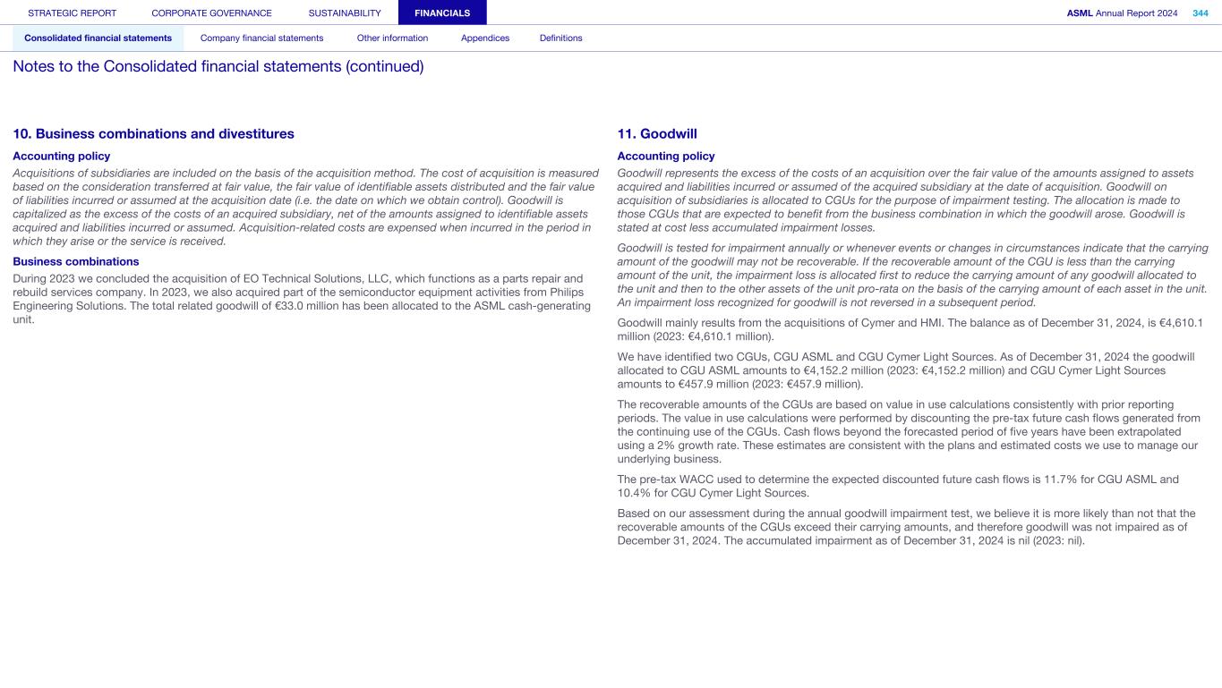 10.企业合并及剥离会计政策对子公司的收购按收购法计入。收购成本按照收购日(即我们取得控制权之日)按公允价值转让的对价、分配的可辨认资产的公允价值和发生或承担的负债的公允价值计量。商誉资本化为被收购子公司成本的超出部分,扣除分配给收购的可识别资产以及发生或承担的负债的金额。购置相关成本在其产生或接受服务期间发生时计入费用。业务合并在2023年期间,我们完成了对EO Technical Solutions,LLC的收购,该公司的职能是一家零件维修和重建服务公司。2023年,我们还从飞利浦工程解决方案公司收购了部分半导体设备活动。相关商誉总额33.0百万欧元已分配给ASML现金产生单位。11.商誉会计政策商誉是指收购成本超过被收购子公司在收购之日分配给所收购资产和发生或承担的负债的公允价值的部分。收购附属公司商誉分配至现金产生单位以进行减值测试。分配给那些预期将从产生商誉的业务合并中受益的现金产生单位。商誉按成本减累计减值亏损列账。商誉每年或每当有事件或情况变化表明商誉的账面值可能无法收回时进行减值测试。如果现金产生单位的可收回金额低于单位的账面值,则减值亏损的分配将首先减少分配给单位的任何商誉的账面值,然后根据单位内每项资产的账面值按比例分配给单位的其他资产。商誉确认的减值损失不在以后期间转回。商誉主要来自对Cymer和HMI的收购。截至2024年12月31日的余额为46.101亿欧元(2023年:46.101亿欧元)。我们确定了CGU两种CGU,CGU ASML和CGU Cymer光源。截至2024年12月31日,分配给CGU ASML的商誉达41.522亿欧元(2023年:41.522亿欧元),CGU Cymer Lights达4.579亿欧元(2023年:4.579亿欧元)。现金产生单位的可收回金额是根据与先前报告期间一致的使用价值计算得出的。使用价值计算乃透过折现持续使用现金产生单位所产生的税前未来现金流量进行。超过五年预测期的现金流已使用2%的增长率外推。这些估计与我们用来管理基础业务的计划和估计成本是一致的。用于确定预期贴现未来现金流的税前WACC对于CGU ASML为11.7%,对于CGU Cymer光源为10.4%。根据我们在年度商誉减值测试期间的评估,我们认为现金产生单位的可收回金额很可能超过其账面值,因此截至2024年12月31日商誉没有减值。截至2024年12月31日的累计减值为零(2023年:无)。战略报告公司治理可持续发展财务ASML年度报告2024344合并财务报表公司财务报表其他信息附录定义合并财务报表附注(续)