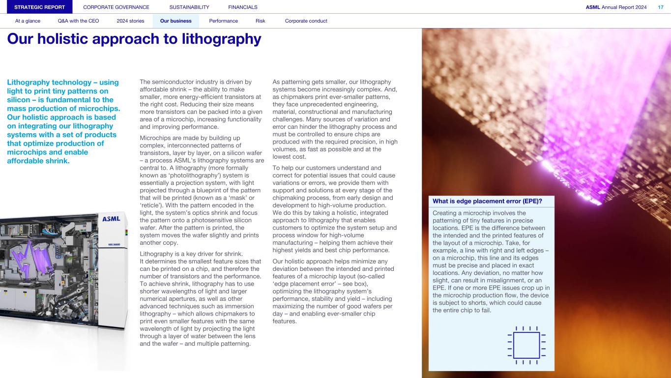 光刻技术——利用光在硅上打印微小图案——是微芯片大规模生产的基础。我们的整体方法是基于将我们的光刻系统与一套优化微芯片生产并实现负担得起的收缩的产品集成。半导体行业是由负担得起的收缩驱动的——以合适的成本制造更小、更节能的晶体管的能力。缩小它们的尺寸意味着可以将更多的晶体管封装到微芯片的特定区域中,从而增加功能并提高性能。微芯片是通过在硅片上一层一层地构建复杂的、相互连接的晶体管图案来制造的——这一过程是ASML的光刻系统的核心。光刻(更正式地称为‘光刻’)系统本质上是一种投影系统,光线通过将被打印的图案的蓝图(称为‘掩模’或‘掩模’)投射出来。随着在光线中编码的图案,系统的光学器件会收缩并将图案聚焦到感光硅片上。打印出图案后,系统会稍微移动晶圆并打印出另一份副本。光刻技术是收缩的关键驱动因素。它决定了可以打印在芯片上的最小特征尺寸,从而决定了晶体管的数量和性能。为了实现收缩,光刻技术必须使用更短波长的光和更大的数值孔径,以及其他先进技术,例如浸入式光刻技术——这使得芯片制造商可以通过透镜和晶圆之间的一层水投射光线,以相同波长的光打印出更小的特征——以及多重图案化。随着图案化变得越来越小,我们的光刻系统变得越来越复杂。而且,随着芯片制造商打印越来越小的图案,他们面临前所未有的工程、材料、建筑和制造挑战。许多变异和误差来源可能会阻碍光刻工艺,因此必须加以控制,以确保以所需的精度、大批量、尽可能快且成本最低的方式生产芯片。为了帮助我们的客户理解和纠正可能导致变异或错误的潜在问题,我们在芯片制造过程的每个阶段为他们提供支持和解决方案,从早期的设计和开发到大批量生产。我们通过采用整体、集成的光刻方法来做到这一点,这使客户能够为大批量制造优化系统设置和工艺窗口——帮助他们实现最高的产量和最佳的芯片性能。我们的整体方法有助于最大限度地减少微芯片布局的预期特征和打印特征之间的任何偏差(所谓的“边缘放置误差”——见方框),优化光刻系统的性能、稳定性和良率——包括最大限度地增加每天良好晶圆的数量——并实现越来越小的芯片特征。战略报告企业治理可持续发展财务ASML年度报告2024 17一览与CEO的问答2024故事我们的业务绩效风险企业行为我们的光刻整体方法什么是边缘放置误差(EPE)?创建微芯片涉及在精确位置对微小特征进行图案化。EPE是微芯片布局的意向特征和打印特征之间的差异。以一条带有左右边缘的线为例——在微芯片上,这条线及其边缘必须是精确的,并放置在精确的位置。任何偏差,无论多么轻微,都可能导致错位,或产生EPE。如果在微芯片生产流程中突然出现一个或多个EPE问题,设备就会出现短缺,这可能会导致整个芯片出现故障。