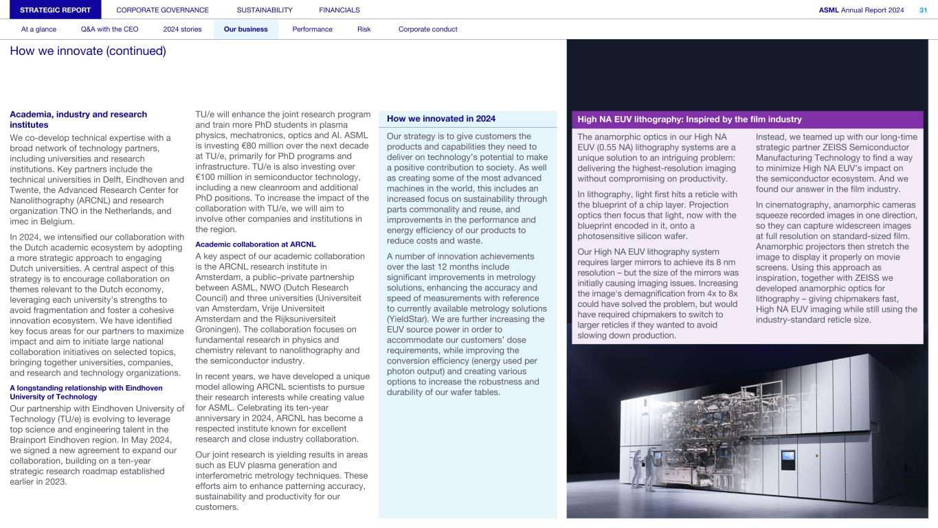 学术界、行业和研究机构我们与广泛的技术合作伙伴网络(包括大学和研究机构)共同开发技术专长。主要合作伙伴包括代尔夫特、埃因霍温和特温特的技术大学、荷兰的纳米光刻高级研究中心(ARCNL)和研究组织TNO,以及比利时的IMIC。2024年,我们加强了与荷兰学术生态系统的合作,采取了一种更具战略性的方法来吸引荷兰大学的参与。该战略的一个核心方面是鼓励在与荷兰经济相关的主题上开展合作,利用每所大学的优势来避免碎片化,并培养一个有凝聚力的创新生态系统。我们为我们的合作伙伴确定了关键的重点领域,以最大限度地发挥影响,并旨在就选定的主题发起大型国家合作倡议,将大学、公司以及研究和技术组织聚集在一起。与埃因霍温科技大学的长期合作关系我们与埃因霍温科技大学(TU/e)的合作伙伴关系正在发展,以利用Brainport埃因霍温地区的顶尖科学和工程人才。2024年5月,我们签署了一项新协议,以扩大我们的合作,建立在2023年早些时候建立的十年战略研究路线图的基础上。TU/E将加强联合研究计划,培养更多等离子体物理、机电一体化、光学和人工智能方面的博士生。ASML将在TU/E的未来十年投资8000万欧元,主要用于博士课程和基础设施建设。TU/E还在半导体技术上投资超过1亿欧元,包括新的洁净室和额外的博士职位。为了增加与TU/E合作的影响,我们将致力于让该地区的其他公司和机构参与进来。ARCNL的学术合作我们学术合作的一个关键方面是位于阿姆斯特丹的ARCNL研究所,这是ASML、NWO(荷兰研究委员会)和三所大学(Universiteit van Amsterdam、Vrije Universiteit Amsterdam和Rijksuniversiteit Groningen)之间的公私合作伙伴关系。此次合作的重点是与纳米光刻和半导体行业相关的物理和化学基础研究。近年来,我们开发了一种独特的模型,让ARCNL科学家在追求他们的研究兴趣的同时,也为ASML创造了价值。在2024年庆祝成立十周年之际,ARCNL已成为一家受人尊敬的机构,以出色的研究和密切的行业协作而闻名。我们的联合研究正在EUV等离子体生成和干涉计量技术等领域取得成果。这些努力旨在为我们的客户提高图案制作的准确性、可持续性和生产力。战略报告企业治理可持续发展财务ASML年度报告2024 31一览与CEO的问答2024故事我们的业务绩效风险企业行为我们如何创新(续)我们在2024年如何创新我们的战略是为客户提供他们需要的产品和能力,以发挥技术的潜力,为社会做出积极贡献。除了创造一些世界上最先进的机器外,这还包括通过零件共通性和再利用,以及提高我们产品的性能和能效,以减少成本和浪费,更加注重可持续性。过去12个月的多项创新成就包括计量解决方案的重大改进,参照当前可用的计量解决方案(YieldStar)提高了测量的准确性和速度。我们正在进一步增加EUV源功率,以适应客户的剂量要求,同时提高转换效率(每个光子输出使用的能量)并创建各种选项,以提高我们的晶圆表的稳健性和耐用性。High NA EUV光刻:受到薄膜行业的启发,我们的High NA EUV(0.55 NA)光刻系统中的变形光学器件是解决一个有趣问题的独特解决方案:在不影响生产力的情况下提供最高分辨率的成像。在光刻技术中,光首先会击中带有芯片层蓝图的标线。然后,投影光学将现在已在其中编码蓝图的光线聚焦到感光硅片上。我们的高NAEUV光刻系统需要更大的反射镜才能实现其8 nm分辨率——但反射镜的尺寸最初会引起成像问题。将图像的去放大率从4倍提高到8倍本可以解决这个问题,但如果芯片制造商想要避免放慢生产速度,就需要改用更大的晶片。相反,我们与我们的长期战略合作伙伴蔡司半导体制造技术合作,以找到一种方法来最大限度地减少高NAEUV对半导体生态系统的影响。我们在电影行业找到了答案。在电影摄影中, 变形相机向一个方向挤压记录的图像,因此它们可以在标准尺寸的胶卷上以全分辨率捕获宽屏图像。变形投影仪然后拉伸图像以在电影屏幕上正确显示它。以这种方法为灵感,我们与蔡司一起开发了用于光刻的变形光学器件——为芯片制造商提供了快速、高NA的EUV成像,同时仍使用行业标准的刻线尺寸。