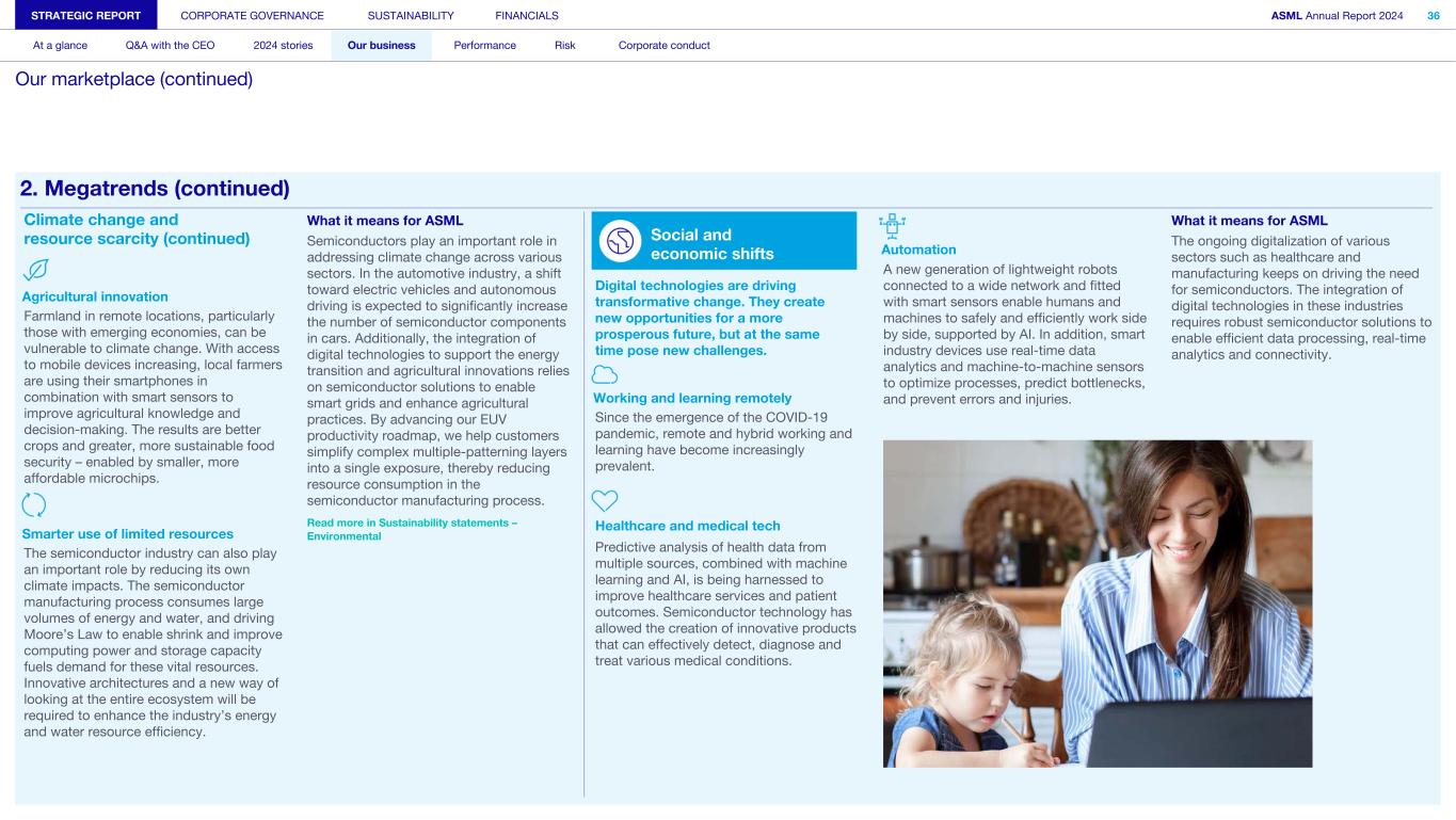气候变化和资源稀缺(续)农业创新偏远地区的农田,特别是那些拥有新兴经济体的农田,可能容易受到气候变化的影响。随着使用移动设备的机会越来越多,当地农民正在将他们的智能手机与智能传感器结合使用,以提高农业知识和决策水平。结果是更好的作物和更大、更可持续的粮食安全——由更小、更实惠的微芯片实现。更明智地利用有限的资源半导体行业还可以通过减少自身的气候影响发挥重要作用。半导体制造过程消耗大量能源和水,推动摩尔定律使计算能力和存储能力得以缩小和提高,推动了对这些重要资源的需求。将需要创新架构和看待整个生态系统的新方式,以提高行业的能源和水资源效率。它对ASML意味着什么半导体在应对气候变化的各个领域都发挥着重要作用。在汽车行业,向电动汽车和自动驾驶的转变有望显著增加汽车中半导体部件的数量。此外,支持能源转型和农业创新的数字技术整合依赖于半导体解决方案,以实现智能电网并增强农业实践。通过推进我们的EUV生产力路线图,我们帮助客户将复杂的多重图案层简化为单一曝光,从而减少半导体制造过程中的资源消耗。阅读更多可持续发展声明–环境社会和经济转变数字技术正在推动变革性变革。它们为更加繁荣的未来创造了新的机遇,但同时也提出了新的挑战。远程工作和学习自新冠疫情出现以来,远程和混合工作和学习变得越来越普遍。医疗保健和医疗技术对来自多个来源的健康数据进行预测分析,并结合机器学习和人工智能,正被用于改善医疗保健服务和患者结果。半导体技术使得能够创造出能够有效检测、诊断和治疗各种医疗状况的创新产品。自动化新一代轻量级机器人连接广泛的网络并配备智能传感器,使人和机器能够在AI的支持下安全高效地并肩工作。此外,智能行业设备使用实时数据分析和机器对机器传感器来优化流程、预测瓶颈、防止错误和伤害。它对ASML意味着什么医疗保健和制造业等各个行业正在进行的数字化不断推动对半导体的需求。数字技术在这些行业的整合需要强大的半导体解决方案,以实现高效的数据处理、实时分析和连接。战略报告公司治理可持续发展财务ASML年度报告2024 36一览与CEO的问答2024故事我们的业务绩效风险公司行为我们的市场(续)2。大趋势(续)