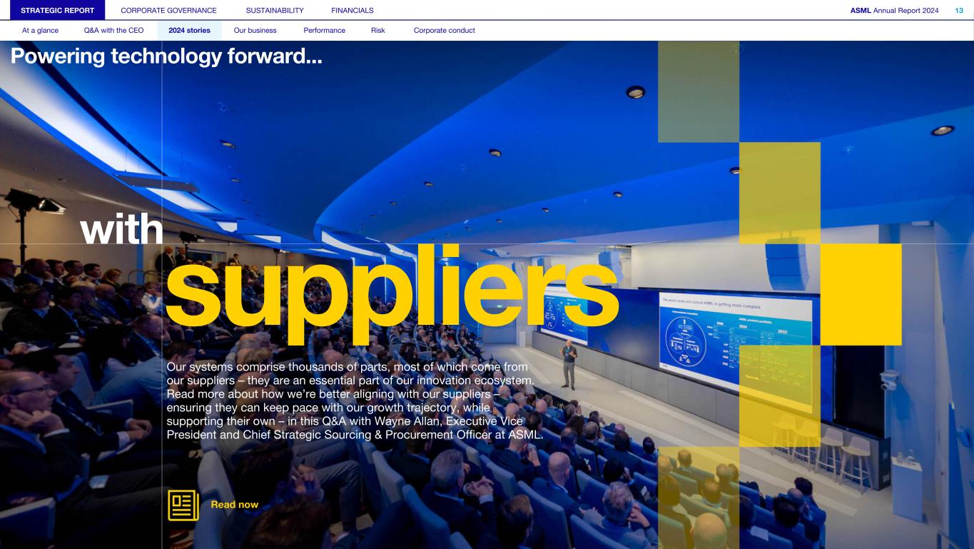 动力科技向前..。战略报告企业治理可持续发展财务ASML年度报告2024 13与CEO问答一览2024故事我们的业务绩效风险使用我们系统的企业行为供应商包含数千个部件,其中大部分来自我们的供应商——它们是我们创新生态系统的重要组成部分。在与ASML执行副总裁兼首席战略采购与采购官Wayne Allan的问答中,详细了解我们如何更好地与供应商保持一致——确保他们能够跟上我们的增长轨迹,同时支持他们自己的增长轨迹。立即阅读