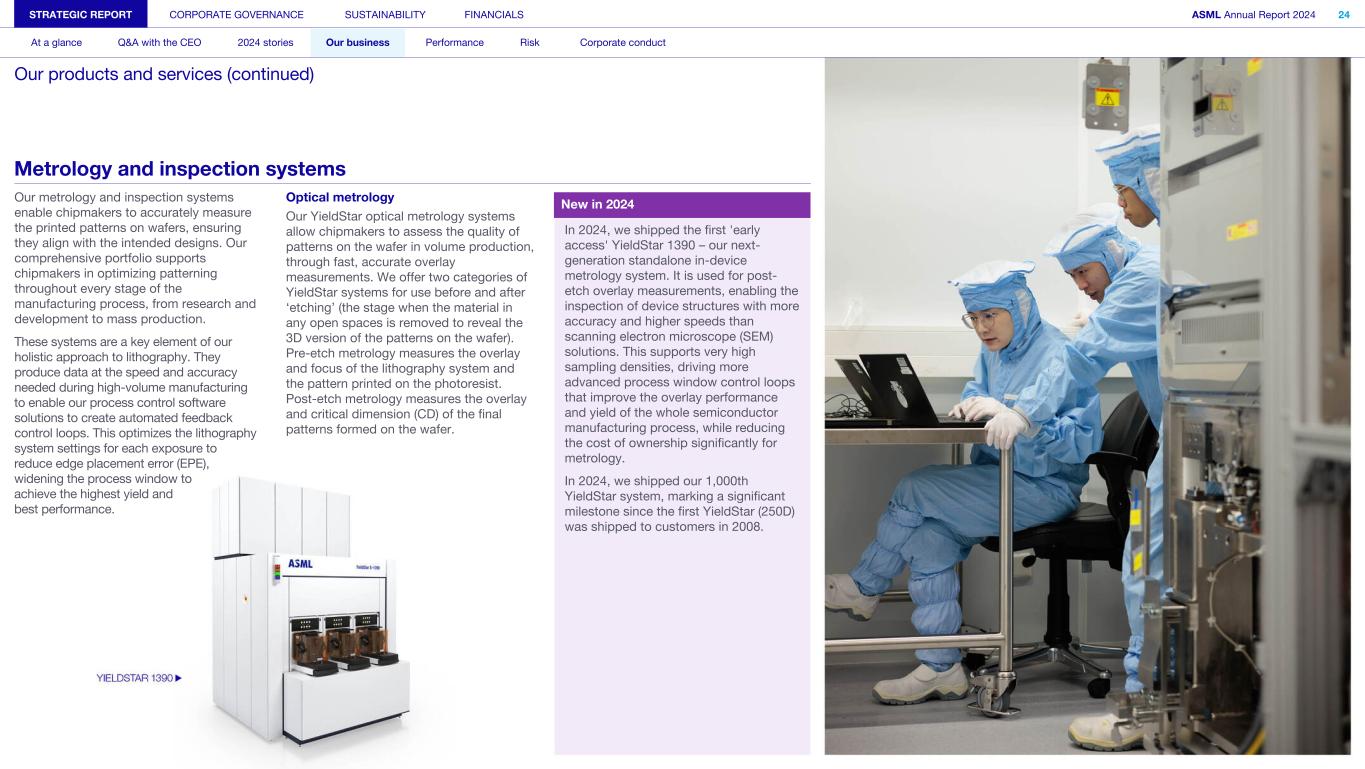 我们的计量和检测系统使芯片制造商能够准确测量晶圆上的打印图案,确保它们与预期设计保持一致。我们全面的产品组合支持芯片制造商在制造过程的每个阶段优化图案化,从研发到大规模生产。这些系统是我们光刻整体方法的关键要素。它们以大批量制造所需的速度和精度产生数据,从而使我们的过程控制软件解决方案能够创建自动反馈控制回路。这优化了每次曝光的光刻系统设置,以减少边缘放置误差(EPE),拓宽工艺窗口以实现最高良率和最佳性能。光学计量我们的YieldStar光学计量系统允许芯片制造商通过快速、准确的叠加测量,在批量生产中评估晶圆上图案的质量。我们提供两个类别的YieldStar系统,用于‘刻蚀’(任何开放空间中的材料被移除以显示晶圆上图案的3D版本的阶段)之前和之后的使用。预刻蚀计量测量光刻系统的重叠和焦点以及打印在光刻胶上的图案。刻蚀后计量测量晶圆上形成的最终图案的叠加和临界尺寸(CD)。2024年,我们交付了第一台“早期访问”YieldStar 1390 ——我们的下一代独立设备内计量系统。它用于刻蚀后叠加测量,能够以比扫描电子显微镜(SEM)解决方案更高的精度和更高的速度检查器件结构。这支持非常高的采样密度,驱动更先进的工艺窗口控制回路,提高整个半导体制造过程的叠加性能和良率,同时显着降低计量的拥有成本。2024年,我们交付了第1000台YieldStar系统,这标志着自2008年向客户交付第一台YieldStar(250D)以来的一个重要里程碑。战略报告企业治理可持续发展财务ASML年度报告2024一览与CEO的问答2024故事我们的业务绩效风险企业行为我们的产品和服务(续)计量和检测系统2024年新