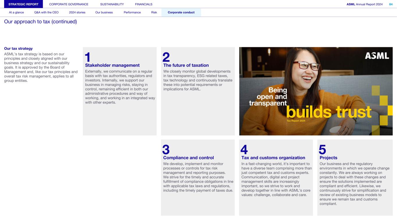 我们的税务战略ASML的税务战略基于我们的原则,并与我们的业务战略和可持续发展目标密切一致。它由管理委员会批准,与我们的税务原则和整体税务风险管理一样,适用于所有集团实体。战略报告企业治理可持续发展财务ASML年度报告202484与CEO问答一览2024故事我们的业务绩效风险企业行为我们的税收方法(续)12利益相关者管理税收的未来对外,我们与税务机关、监管机构和投资者进行定期沟通。在内部,我们支持我们的业务管理风险,保持控制,在我们的行政程序和工作方式上保持高效,并与其他专家以综合方式工作。我们密切关注税收透明度、ESG相关税收、税务技术方面的全球发展,并不断将这些转化为对ASML的潜在要求或影响。345合规和控制税务和海关组织项目我们为税务风险管理和报告目的开发、实施和监控流程或控制。我们努力按照适用的税收法律法规及时准确履行合规义务,包括及时缴纳应缴税款。在瞬息万变的世界中,重要的是要拥有一支多元化的团队,而不仅仅是由称职的税务和海关专家组成。沟通、数字和项目管理技能变得越来越重要,因此我们努力按照ASML的核心价值观一起工作和发展:挑战、协作和关怀。我们的业务和我们经营所处的监管环境不断变化。我们一直在开展项目,以应对这些变化,并确保实施的解决方案合规且高效。同样,我们不断努力简化和审查现有的业务模式,以确保我们保持税务和海关合规。