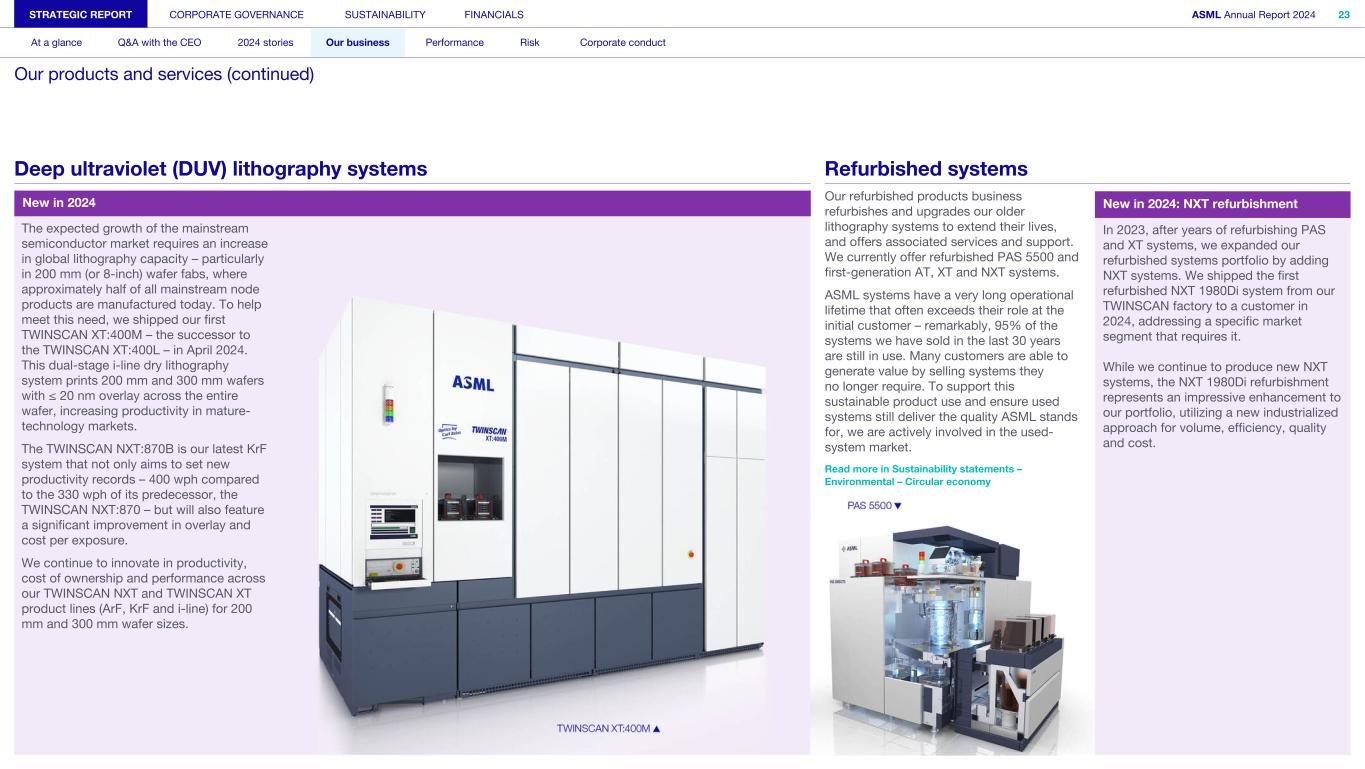 主流半导体市场的预期增长需要全球光刻产能的增加——尤其是在200毫米(或8英寸)晶圆厂,目前所有主流节点产品中约有一半是在这些晶圆厂制造的。为了帮助满足这一需求,我们于2024年4月交付了我们的第一台TWINSCAN XT:400m – TWINSCAN XT:400L的继任者。这种双级i-line干式光刻系统可在整个晶圆上以≤ 20nm的叠加方式打印200mm和300mm晶圆,提高了成熟技术市场的生产力。TWINSCAN NXT:870B是我们最新的KrF系统,它不仅旨在创造新的生产力记录—— 400 wph,而其前身TWINSCAN NXT:870的330 wph ——而且还将在覆盖和每次曝光成本方面有显着改善。我们继续在适用于200毫米和300毫米晶圆尺寸的TWINSCAN NXT和TWINSCAN XT产品线(ArF、KrF和i-line)的生产力、拥有成本和性能方面进行创新。我们的翻新产品业务翻新和升级我们较旧的光刻系统以延长其寿命,并提供相关服务和支持。我们目前提供翻新的PAS 5500和第一代AT,XT和NXT系统。ASML系统具有非常长的使用寿命,这通常超过了它们在初始客户处的作用——值得注意的是,我们在过去30年中销售的系统中有95%仍在使用。许多客户能够通过销售他们不再需要的系统来创造价值。为了支持这种可持续的产品使用,并确保二手系统仍然提供ASML所代表的质量,我们正在积极介入二手系统市场。在可持续发展声明中阅读更多内容–环境–循环经济2024年上新:2023年NXT翻新,在多年翻新PAS和XT系统之后,我们通过添加NXT系统扩展了我们的翻新系统组合。我们于2024年从TWINSCAN工厂向一位客户交付了第一个翻新的NXT 1980Di系统,针对需要它的特定细分市场。虽然我们继续生产新的NXT系统,但NXT 1980Di翻新代表了对我们产品组合的令人印象深刻的增强,利用了一种新的工业化方法来实现体积、效率、质量和成本。战略报告企业治理可持续发展财务ASML 2024年度报告23一览与CEO的问答2024故事我们的业务绩效风险企业行为我们的产品和服务(续)深紫外(DUV)光刻系统2024年新增翻新系统