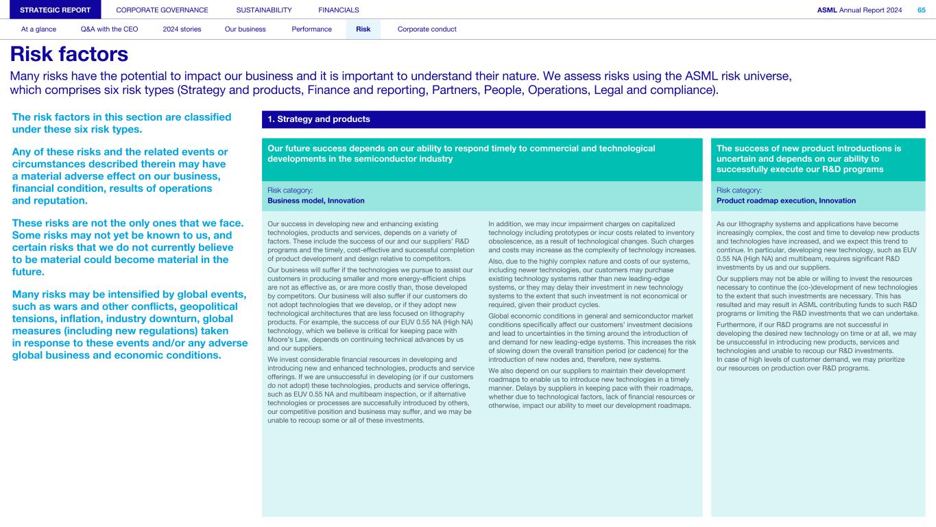 本节中的风险因素分为这六种风险类型。任何这些风险以及其中描述的相关事件或情况都可能对我们的业务、财务状况、经营业绩和声誉产生重大不利影响。这些风险并不是我们面临的唯一风险。有些风险我们可能还不知道,我们目前认为不是实质性的某些风险可能在未来变成实质性的。许多风险可能会因全球事件而加剧,例如战争和其他冲突、地缘政治紧张局势、通货膨胀、行业低迷、为应对这些事件而采取的全球措施(包括新规)和/或任何不利的全球商业和经济状况。1.战略和产品我们未来的成功取决于我们对半导体行业的商业和技术发展做出及时反应的能力新产品推出的成功是不确定的,取决于我们成功执行研发计划的能力风险类别:风险类别:商业模式、创新产品路线图执行、创新我们在开发新的和增强现有技术、产品和服务方面的成功,取决于多种因素。其中包括我们和供应商研发计划的成功,以及相对于竞争对手及时、经济高效和成功地完成产品开发和设计。如果我们为协助客户生产更小、更节能的芯片而追求的技术不如竞争对手开发的技术有效或成本更高,我们的业务将受到影响。如果我们的客户不采用我们开发的技术,或者他们采用较少专注于光刻产品的新技术架构,我们的业务也会受到影响。例如,我们认为与摩尔定律保持同步至关重要的EUV 0.55 NA(High NA)技术的成功取决于我们和供应商持续的技术进步。我们在开发和引进新的和增强的技术、产品和服务产品方面投入了相当大的财政资源。如果我们未能成功开发(或如果我们的客户不采用)这些技术、产品和服务产品,例如EUV0.55NA和多波束检测,或者如果替代技术或工艺被他人成功引入,我们的竞争地位和业务可能会受到影响,我们可能无法收回部分或全部这些投资。此外,由于技术变革,我们可能会对包括原型在内的资本化技术产生减值费用,或产生与库存过时相关的成本。这种收费和成本可能会随着技术复杂性的增加而增加。此外,由于我们的系统的高度复杂性和成本,包括更新的技术,我们的客户可能会购买现有的技术系统而不是新的领先系统,或者他们可能会推迟对新技术系统的投资,因为考虑到他们的产品周期,这种投资不经济或不需要。一般的全球经济状况和半导体市场状况具体影响我们客户的投资决策,并导致围绕新的领先系统的引入和需求的时间不确定性。这增加了为引入新节点、从而引入新系统而放慢整体过渡期(或节奏)的风险。我们还依赖我们的供应商维护他们的发展路线图,以使我们能够及时引入新技术。供应商在与其路线图保持同步方面的延误,无论是由于技术因素、缺乏财政资源还是其他原因,都会影响我们满足发展路线图的能力。随着我们的光刻系统和应用变得日益复杂,开发新产品和技术的成本和时间增加,我们预计这一趋势将持续下去。特别是,开发新技术,例如EUV 0.55 NA(High NA)和多波束,需要我们和我们的供应商进行大量的研发投资。我们的供应商可能无法或不愿意投资必要的资源,以继续(共同)开发新技术,只要这种投资是必要的。这已经并可能导致ASML为此类研发计划提供资金,或限制我们可以进行的研发投资。此外,如果我们的研发计划未能按时或完全成功开发所需的新技术,我们可能无法成功引入新产品、服务和技术,无法收回我们的研发投资。在客户需求水平较高的情况下, 我们可能会将我们的资源优先用于生产而不是研发项目。战略报告公司治理可持续发展财务ASML年度报告202465与CEO的问答一览2024故事我们的业务绩效风险公司行为风险因素许多风险都有可能影响我们的业务,了解其性质非常重要。我们使用ASML风险范围评估风险,该范围包括六种风险类型(策略和产品、财务和报告、合作伙伴、人员、运营、法律和合规)。