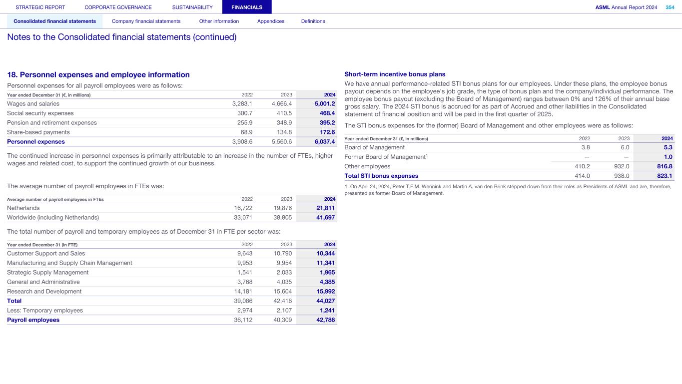 18.人事费用和员工信息所有发薪员工的人事费用如下:截至12月31日止年度(欧元,百万)202220232024工资和薪金3,283.14,666.45,001.2社会保障费用300.74 10.5 468.4养老金和退休金支出255.93 48.93 95.2股份支付68.91 34.81 72.6人事费用3,908.65,56 0.66,037.4人事费用的持续增长主要是由于FTE数量的增加、工资和相关成本的增加,以支持我们业务的持续增长。FTE的平均工资雇员人数为:FTE的平均工资雇员人数202220232024荷兰16,72219,87621,811全球(包括荷兰)33,07138,80541,697截至12月31日,FTE每个部门的工资和临时雇员总数为:截至12月31日止年度(以FTE计)202220232024客户支持和销售9,64310,79010,344制造和供应链管理9,9539,95411,341战略供应管理1,5412,0331,965一般和行政3,7684,0354,385研究和发展14,18115,60415,992合计39,08642,41644,027减:临时雇员2,9742,1071,241工资雇员36,11240,30942,786短期激励奖金计划我们为员工制定了与绩效相关的年度STI奖金计划。在这些计划下,员工奖金的发放取决于员工的工作等级、奖金计划的类型以及公司/个人的表现。员工奖金支出(不包括管理委员会)介于其年度基本毛工资的0%至126%之间。2024年STI奖金作为合并财务状况表中应计负债和其他负债的一部分计提,将于2025年第一季度支付。(前)管理委员会和其他雇员的STI奖金支出如下:截至12月31日止年度(欧元,单位:百万)202220232024管理委员会3.86.05.3前管理委员会1 —— 1.0其他雇员410.2932.08 16.8 STI奖金支出总额414.09 38.08 23.11。2024年4月24日,Peter T.F.M. Wennink和Martin A. van den Brink辞去ASML总裁职务,因此出任前管理委员会成员。战略报告公司治理可持续发展财务公司ASML年度报告2024354合并财务报表公司财务报表其他信息附录定义合并财务报表附注(续)