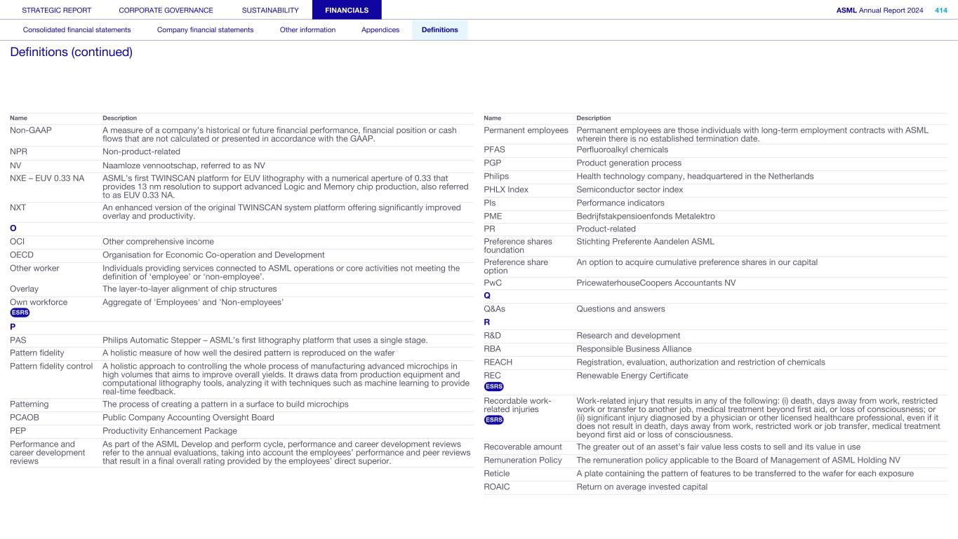 非GAAP衡量公司历史或未来财务业绩、财务状况或现金流量的指标,这些指标不是按照GAAP计算或列报的。NPR非产品相关的NV Naamloze vennootschap,简称NV NXE – EUV 0.33 NA ASML的首个用于EUV光刻的TWINSCAN平台,其数值孔径为0.33,可提供13nm分辨率以支持先进的逻辑和存储芯片生产,也简称EUV 0.33 NA。NXT是原始TWINSCAN系统平台的增强版本,提供显着改进的覆盖和生产力。O OCI其他综合收益OECD经济合作与发展组织提供与ASML运营或核心活动相关的服务的其他工人个人不符合‘雇员’或‘非雇员’的定义。重叠芯片结构的层层对齐自己的劳动力聚合‘员工’和‘非员工’P AS飞利浦自动步进器– ASML的第一个使用单级的光刻平台。图案保真度在晶圆上复制所需图案的整体程度的整体测量图案保真度控制一种整体方法,用于控制以大批量制造先进微芯片的整个过程,旨在提高整体良率。它从生产设备和计算光刻工具中提取数据,用机器学习等技术进行分析,以提供实时反馈。将在一个表面上创建模式的过程模式化,以构建微芯片PCAOB上市公司会计监督委员会PEP生产力增强包绩效和职业发展审查作为ASML开发和执行周期的一部分,绩效和职业发展审查是指年度评估,考虑到员工的绩效和同行审查,从而产生由员工的直接上级提供的最终总体评级。名称说明永久雇员永久雇员是指与ASML签订长期雇佣合同且其中没有确定终止日期的个人。PFAS全氟烷基化学品PGP产品生成过程飞利浦健康科技公司,总部位于荷兰PHLX指数半导体行业指数PI绩效指标PME Bedrijfstakpensioenfonds Metalektro PR产品相关优先股基金会Stichting优先股Aandelen 丨ASML优先股期权一项收购我国资本累计优先股的选择权普华永道会计师事务所NV问答问答研发研发澳洲联储责任商业联盟REACH化学品REC的注册、评估、授权和限制Renewable能源证书可记录工伤工伤导致以下任一情形的工伤:(i)死亡、离岗天数,受限制的工作或转职、急救以外的医疗或失去意识;或(ii)经医生或其他有执照的医疗保健专业人员诊断的重大损伤,即使不会导致死亡、离开工作的天数、受限制的工作或工作转职、急救以外的医疗或失去意识。可收回金额一项资产的公允价值减去销售成本与其使用价值两者中的较大者薪酬政策适用于阿斯麦 NV管理委员会的薪酬政策Reticle A plate containing the pattern of features to be transferred to the wafer for each exposure ROAIC Return on average investment capital Name Description Strategic Report corporate governance sustainability financials丨ASML丨年报2024414合并财务报表公司财务报表其他信息附录定义(续)