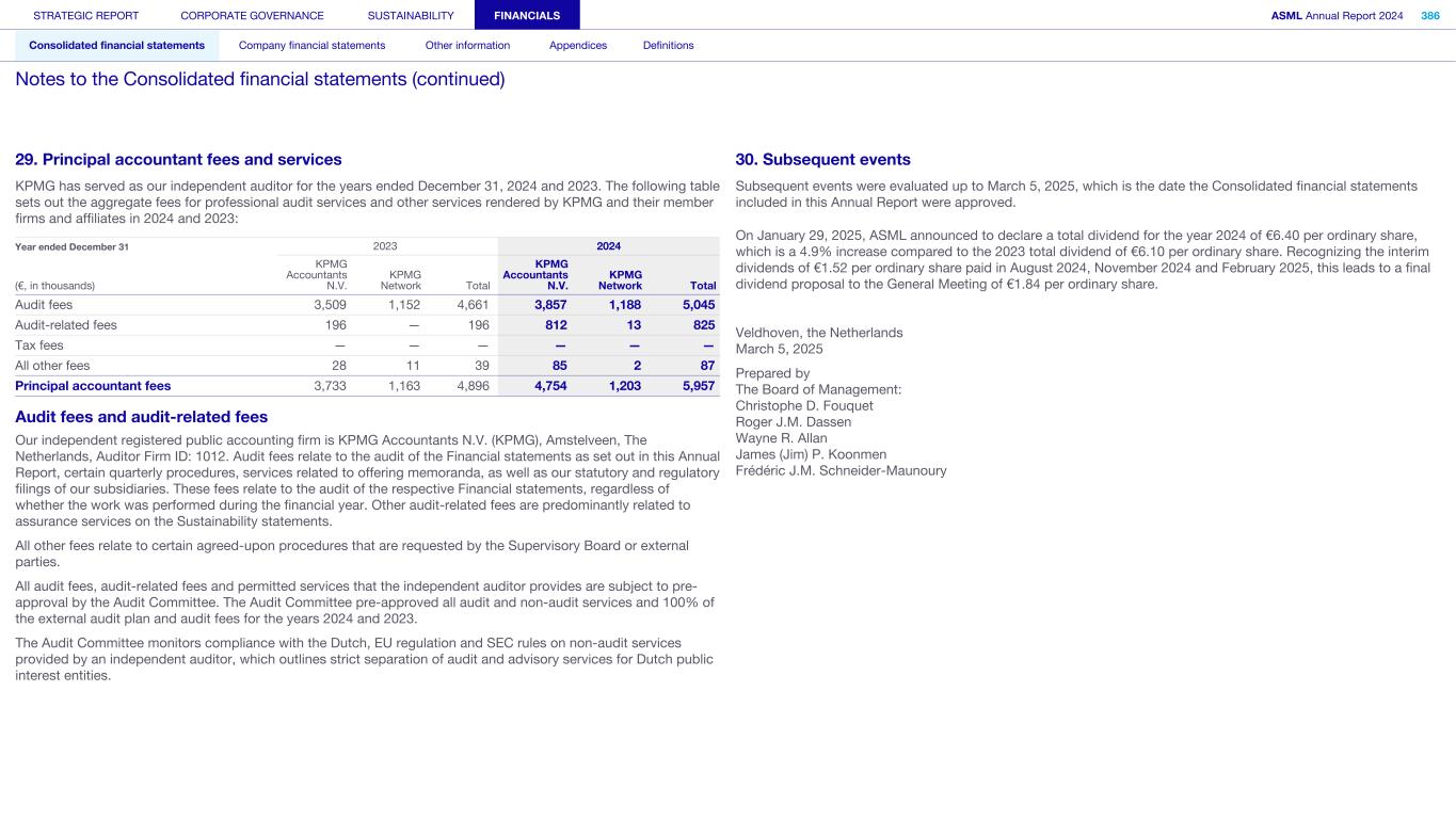 29.首席会计师费用和服务毕马威会计师事务所已担任我们截至2024年12月31日和2023年12月31日止年度的独立审计师。下表列出毕马威及其成员公司和关联公司在2024年和2023年提供的专业审计服务和其他服务的总费用:截至2023年12月31日的年度2024年(欧元,以千为单位)KPMG Accountants N.V. KPMG Network Total KPMG Accountants N.V. KPMG Network Total Audit Fees 3,5091,1524,6613,8571,1885,045 Audit related fees 196 — 19681213825 tax fees —————— All other fees 28113985287 Principal accountant fees 3,7331,1634,8964,7541,2035,957 Audit fees and audit related fees our independent registered public accountants are KPMG Accountants N.V.(KPMG)审计费用涉及本年度报告中规定的财务报表审计、某些季度程序、与发行备忘录相关的服务,以及我们对子公司的法定和监管文件。这些费用与各自财务报表的审计有关,无论工作是否在财政年度进行。其他与审计相关的费用主要与可持续发展报表上的鉴证服务有关。所有其他费用涉及监事会或外部各方要求的某些商定程序。独立审计师提供的所有审计费用、审计相关费用和许可服务均须经审计委员会预先批准。审计委员会预先批准了2024年和2023年所有审计和非审计服务以及100%的外部审计计划和审计费用。审计委员会监督有关独立审计师提供的非审计服务的荷兰、欧盟法规和SEC规则的遵守情况,其中概述了荷兰公共利益实体的审计和咨询服务的严格分离。30.期后事项期后事项评估截止至2025年3月5日,即本年度报告所载合并财务报表获得批准之日。2025年1月29日,ASML宣布宣布2024年的股息总额为每股普通股6.40欧元,与2023年的股息总额每股普通股6.10欧元相比,增长4.9%。确认在2024年8月、2024年11月和2025年2月支付的每股普通股1.52欧元的中期股息,这导致向股东大会提出每股普通股1.84欧元的末期股息提案。荷兰Veldhoven,2025年3月5日由管理委员会编制:Christophe D. Fouquet Roger J.M. Dassen Wayne R. Allan James(Jim)P. Koonmen Fr é d é ric J.M. Schneider-Maunoury战略报告公司治理可持续发展财务丨ASML年度报告2024386合并财务报表公司财务报表其他信息附录定义合并财务报表附注(续)
