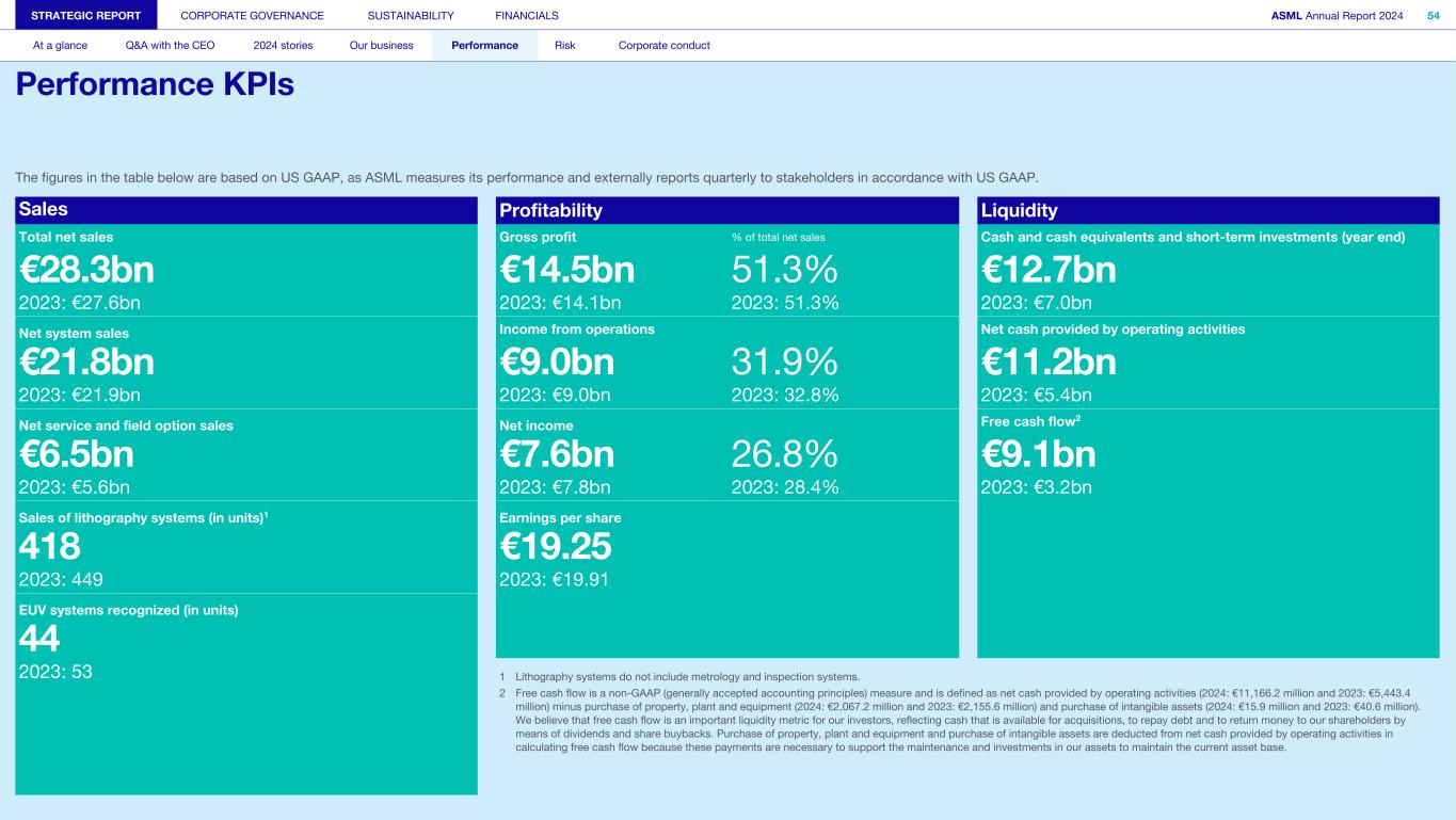 下表中的数字基于美国通用会计准则,因为ASML衡量其业绩并根据美国通用会计准则每季度向利益相关者发布外部报告。销售盈利能力流动性总净销售额毛利润占总净销售额的百分比现金及现金等价物和短期投资(年底)283亿欧元145亿欧元51.3% 127亿欧元2023:276亿欧元2023:141亿欧元2023:51.3% 2023:70亿欧元净系统销售运营收入经营活动提供的净现金218亿欧元90亿欧元31.9% 112亿欧元2023:219亿欧元2023:90亿欧元2023:32.8% 2023:54亿欧元净服务和现场期权销售净收入自由现金流2欧元65亿欧元76亿欧元26.8% 91亿欧元2023年:56亿欧元2023年:78亿欧元2023年:28.4% 2023年:32亿欧元光刻系统销售额(单位)1每股收益418欧元19.25 2023年:4492023年:19.91欧元EUV系统认可(单位)442023年:531光刻系统不包括计量和检测系统。2自由现金流是一种非GAAP(公认会计原则)衡量标准,定义为经营活动提供的净现金(2024年:111.662亿欧元,2023年:54.434亿欧元)减去购买物业、厂房和设备(2024年:20.672亿欧元,2023年:21.556亿欧元)和购买无形资产(2024年:1590万欧元,2023年:4060万欧元)。我们认为,自由现金流对我们的投资者来说是一个重要的流动性指标,反映了可用于收购、偿还债务以及通过股息和股票回购向我们的股东返还资金的现金。购买物业、厂房和设备以及购买无形资产在计算自由现金流时从经营活动提供的现金净额中扣除,因为这些付款是必要的,以支持对我们的资产进行维护和投资,以维持当前的资产基础。战略报告公司治理可持续发展财务ASML年度报告2024 54一览与CEO的问答2024故事我们的业务绩效风险公司行为绩效KPI