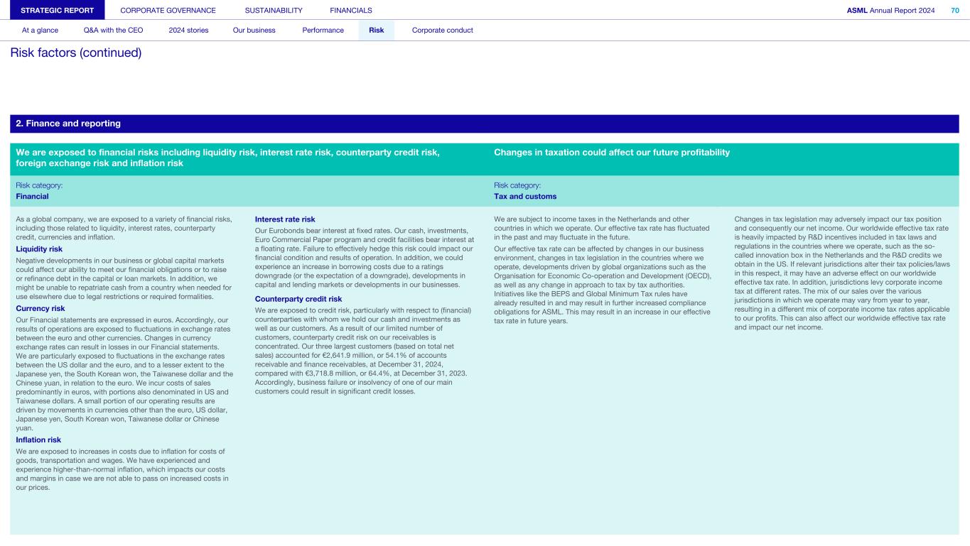 2.财务和报告我们面临的金融风险包括流动性风险、利率风险、交易对手信用风险、外汇风险和通胀风险税收的变化可能会影响我们未来的盈利能力风险类别:风险类别:金融税收和海关作为一家全球性公司,我们面临多种金融风险,包括与流动性、利率、交易对手信用、货币和通胀相关的风险。流动性风险我们的业务或全球资本市场的负面发展可能会影响我们履行财务义务或在资本或贷款市场筹集或再融资债务的能力。此外,由于法律限制或所需手续,我们可能无法在需要时从一个国家汇回现金,以便在其他地方使用。货币风险我们的财务报表以欧元表示。因此,我们的经营业绩受到欧元与其他货币汇率波动的影响。货币汇率的变化可能导致我们的财务报表出现亏损。我们特别受到美元和欧元汇率波动的影响,相对于欧元而言,我们受到日元、韩元、台币和人民币波动的影响较小。我们主要以欧元产生销售成本,部分也以美元和台币计价。我们的经营业绩有一小部分是由欧元、美元、日元、韩元、台币或人民币以外的货币的变动所驱动的。通胀风险由于商品、运输和工资成本的通胀,我们面临成本增加的风险。我们经历并经历了高于正常水平的通货膨胀,这会影响我们的成本和利润率,以防我们无法在价格中转嫁增加的成本。利率风险我们须在荷兰和我们经营所在的其他国家缴纳所得税。我们的有效税率在过去有波动,未来可能会有波动。我们的有效税率可能会受到我们的商业环境变化、我们经营所在国家的税收立法变化、经济合作与发展组织(OECD)等全球组织推动的发展以及税务当局对税收方法的任何变化的影响。像BEPS和全球最低税规则这样的举措已经导致并可能导致ASML的合规义务进一步增加。这可能会导致我们未来几年的有效税率增加。税收立法的变化可能会对我们的税收状况产生不利影响,从而影响我们的净收入。我们的全球有效税率受到我们经营所在国家税法和法规中包含的研发激励措施的严重影响,例如荷兰所谓的创新盒子和我们在美国获得的研发信贷。如果相关司法管辖区改变这方面的税收政策/法律,可能会对我们的全球有效税率产生不利影响。此外,各辖区按不同税率征收企业所得税。我们在我们经营所在的各个司法管辖区的销售组合可能每年都有所不同,从而导致适用于我们利润的公司所得税税率组合不同。这也会影响我们的全球有效税率,并影响我们的净收入。我们的欧洲债券以固定利率计息。我们的现金、投资、欧元商业票据计划和信贷工具以浮动利率计息。未能有效对冲这一风险可能会影响我们的财务状况和经营业绩。此外,由于评级下调(或预期下调)、资本和贷款市场的发展或我们业务的发展,我们可能会经历借贷成本的增加。交易对手信用风险我们面临信用风险,特别是与我们持有现金和投资的(金融)交易对手以及我们的客户有关。由于我们的客户数量有限,我们的应收账款的交易对手信用风险集中。截至2024年12月31日,我们的三个最大客户(基于总净销售额)占应收账款和应收融资款的26.419亿欧元,或54.1%,而2023年12月31日为37.188亿欧元,或64.4%。因此,我们的一个主要客户的业务失败或资不抵债可能会导致重大信用损失。战略报告企业治理可持续发展财务ASML年度报告202470一览与CEO的问答2024故事我们的业务绩效风险企业行为风险因素(续)