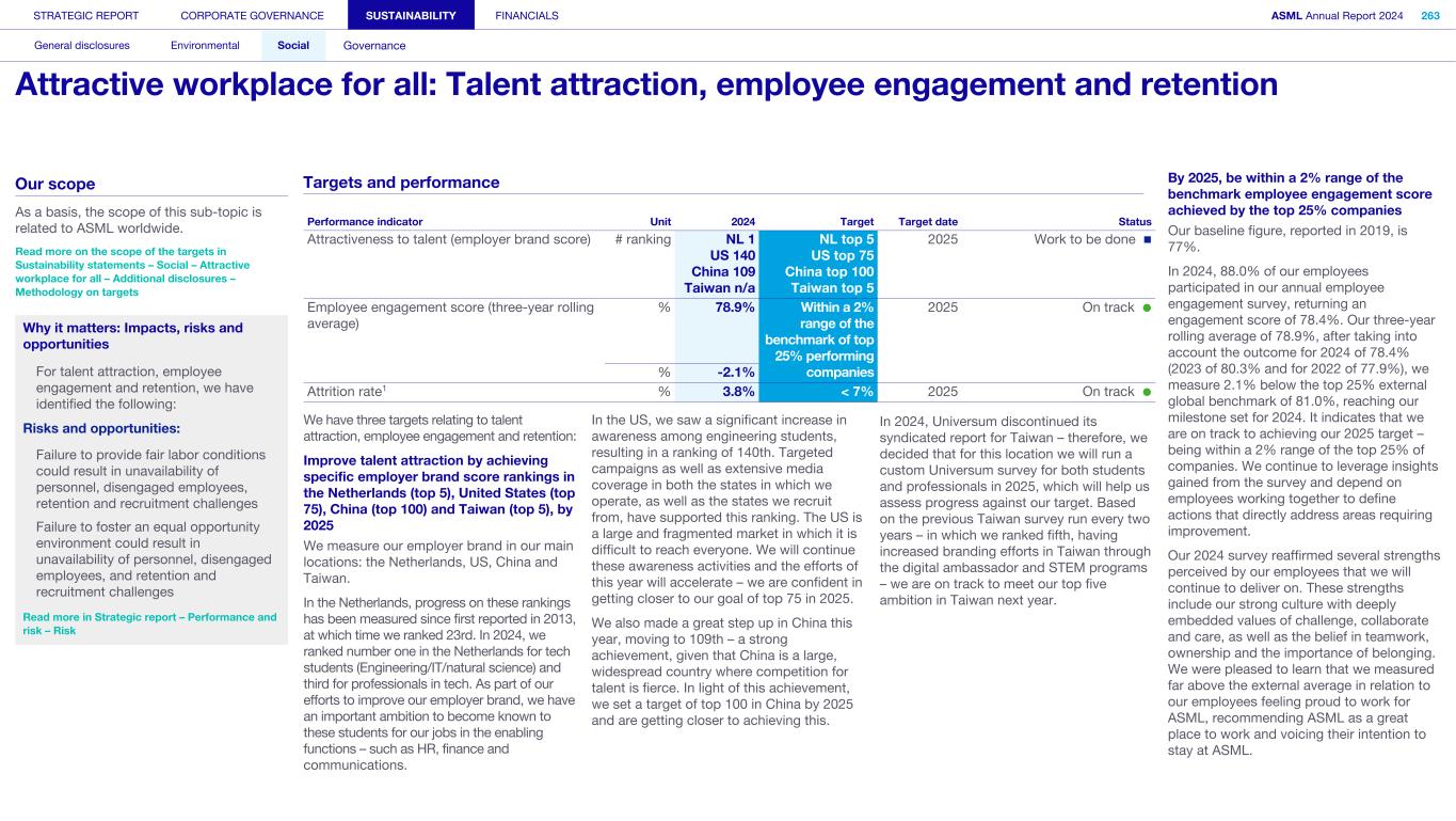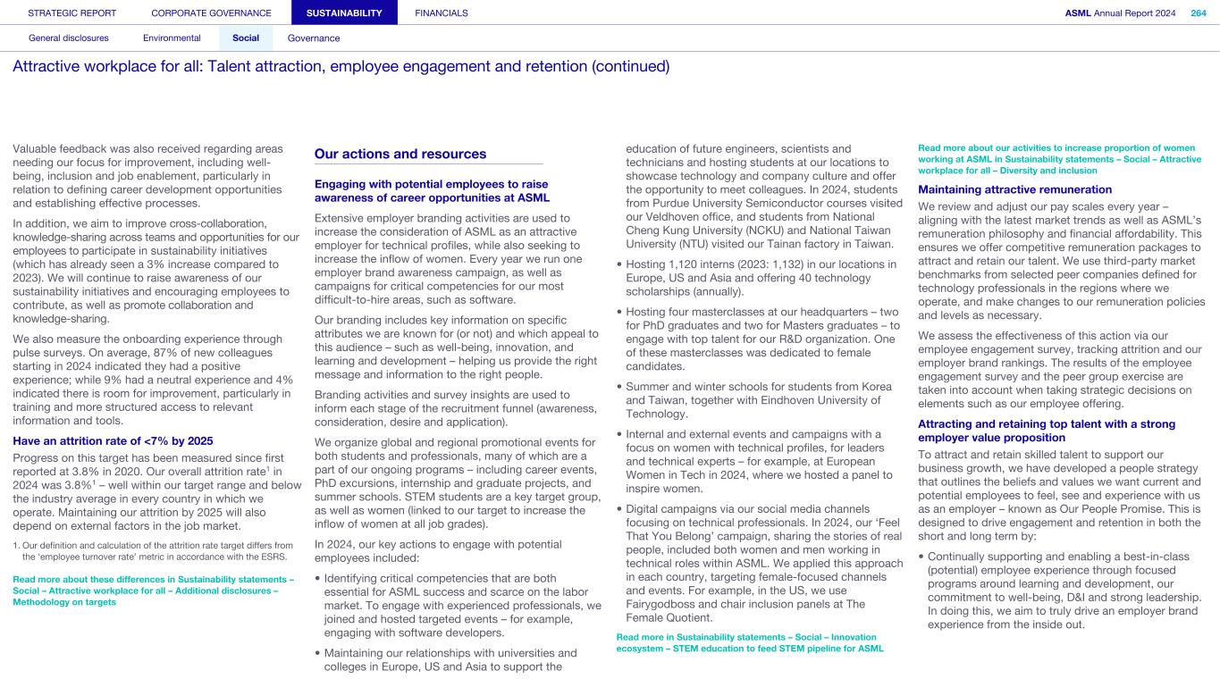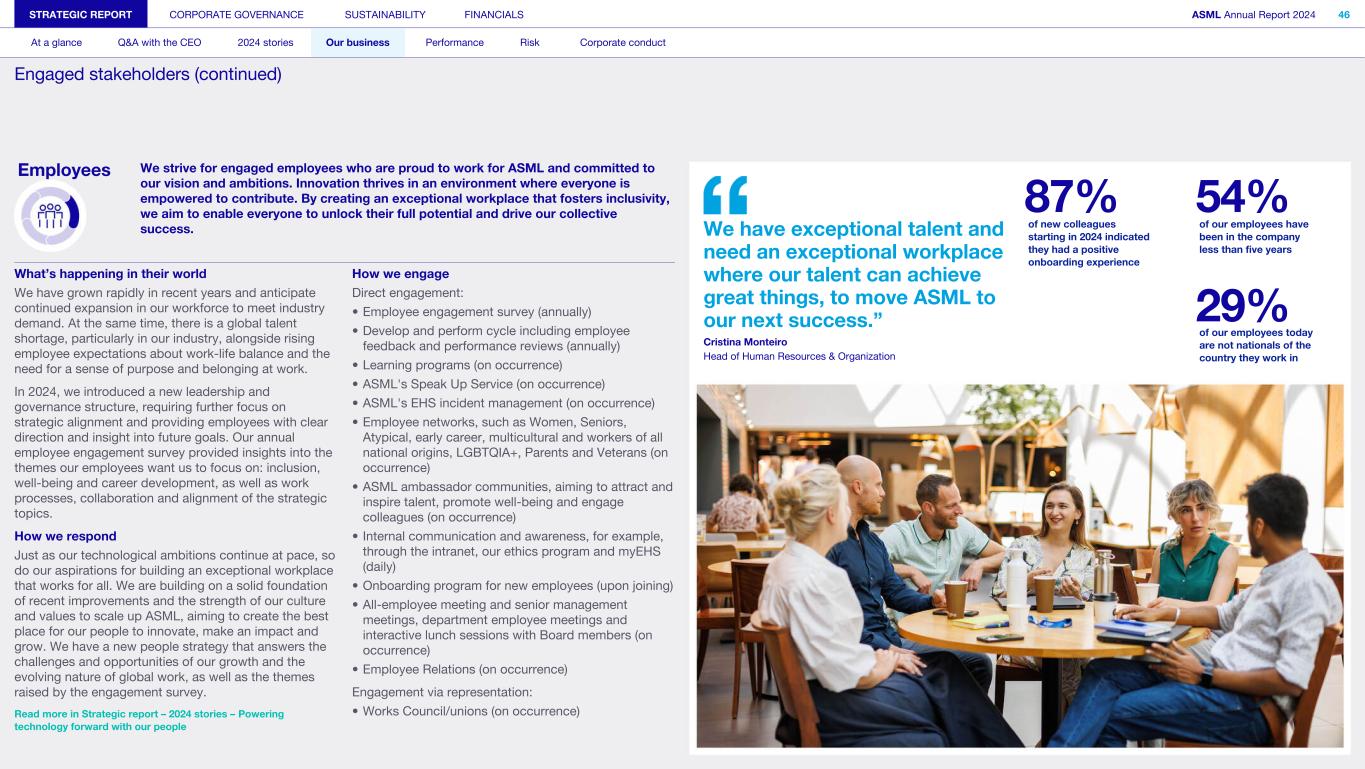 员工我们为敬业的员工而努力,他们以能为ASML工作而自豪,并致力于实现我们的愿景和抱负。创新在每个人都有权做出贡献的环境中茁壮成长。通过创建一个促进包容性的卓越工作场所,我们的目标是使每个人都能释放其全部潜力,并推动我们的集体成功。他们的世界正在发生什么我们近年来增长迅速,并预计我们的劳动力将继续扩张以满足行业需求。与此同时,全球人才短缺,尤其是在我们这个行业,与此同时,员工对工作与生活平衡的期望以及对工作的目标感和归属感的需求不断上升。2024年,我们引入了新的领导层和治理结构,要求进一步关注战略一致性,并为员工提供明确的方向和对未来目标的洞察力。我们的年度员工敬业度调查提供了对员工希望我们关注的主题的见解:包容性、福祉和职业发展,以及工作流程、协作和战略主题的一致性。我们如何应对就像我们的技术抱负继续保持步伐一样,我们建立一个为所有人服务的卓越工作场所的愿望也是如此。我们正立足于最近改进的坚实基础以及我们的文化和价值观的力量来做大ASML,旨在为我们的人民创造一个创新、产生影响和成长的最佳场所。我们有一项新的人员战略,以应对我们增长的挑战和机遇以及全球工作不断演变的性质,以及参与调查提出的主题。在战略报告中阅读更多– 2024年的故事–与我们的员工一起为技术提供动力,我们如何参与直接参与:•员工敬业度调查(每年一次)•制定和执行周期,包括员工反馈和绩效评估(每年一次)•学习计划(发生时)• ASML的Speak Up服务(发生时)• ASML的EHS事件管理(发生时)•员工网络,例如女性、老年人、非典型、早期职业、多元文化和所有国家血统的工人、LGBTQIA +、父母和退伍军人(发生时)• ASML大使社区,旨在吸引和激励人才,促进福祉并让同事参与(发生时)•内部沟通和认识,例如,通过内联网、我们的道德操守计划和myEHS(每日)•新员工入职计划(加入时)•全体员工会议和高级管理层会议,部门员工会议和与董事会成员的互动午餐会(发生时)•员工关系(发生时)通过代表参与:•工委/工会(发生时)战略报告公司治理可持续性财务2024年度报告46与CEO的问答一目了然2024故事我们的业务绩效风险公司行为吸引了利益相关者(续)我们拥有卓越的人才,需要一个卓越的工作场所,让我们的人才能够取得伟大的成就,从而推动ASML走向我们的下一个成功。”Cristina Monteiro人力资源与组织主管87% 54% 2024年开始的新同事表示他们对我们的员工有积极的入职体验在公司工作不到五年29%的员工今天不是他们工作所在国家的国民