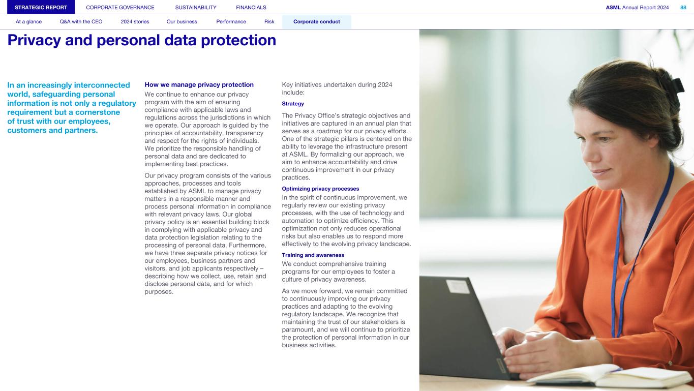 在一个日益相互关联的世界中,保护个人信息不仅是一项监管要求,而且是与我们的员工、客户和合作伙伴建立信任的基石。我们如何管理隐私保护我们继续加强我们的隐私计划,目的是确保遵守我们经营所在司法管辖区的适用法律法规。我们的做法以问责制、透明度和尊重个人权利的原则为指导。我们优先考虑负责任地处理个人数据,并致力于实施最佳做法。我们的隐私计划由ASML建立的各种方法、流程和工具组成,这些方法、流程和工具旨在以负责任的方式管理隐私事务,并在符合相关隐私法的情况下处理个人信息。我们的全球隐私政策是遵守与处理个人数据相关的适用隐私和数据保护立法的重要组成部分。此外,我们分别为员工、商业伙伴和访客以及求职者提供了三份单独的隐私声明——描述了我们如何收集、使用、保留和披露个人数据,以及出于何种目的。2024年期间采取的关键举措包括:战略隐私办公室的战略目标和举措体现在作为我们隐私工作路线图的年度计划中。战略支柱之一集中于利用ASML现有基础设施的能力。通过将我们的方法正规化,我们旨在加强问责制并推动我们的隐私实践不断改进。优化隐私流程本着不断改进的精神,我们定期审查我们现有的隐私流程,利用技术和自动化来优化效率。这种优化不仅降低了操作风险,还使我们能够更有效地应对不断变化的隐私环境。培训和意识我们为员工开展全面的培训计划,以培养隐私意识文化。在我们向前迈进的过程中,我们将继续致力于不断改进我们的隐私实践,并适应不断变化的监管环境。我们认识到维护利益相关者的信任至关重要,我们将继续在我们的业务活动中优先保护个人信息。战略报告公司治理可持续发展财务ASML年度报告202488一览与CEO的问答2024故事我们的业务绩效风险公司行为隐私和个人数据保护
