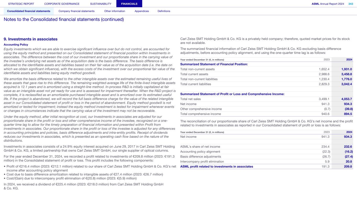 9.对联营公司的投资会计政策我们能够对其施加重大影响但不加以控制的股权投资采用权益法核算,并在我们的合并财务状况表中列报于对联营公司的投资中。我司投资成本与我司在被投资单位截至收购日的标的净资产账面价值中所占比例的差额为基差。基差按购买日(即我们取得重大影响之日)的公允价值分配给可辨认资产和负债,投资成本超过我们可辨认资产和负债按比例公允价值的部分为权益法商誉。我们将与其他无形资产相关的基差在这些资产产生该差额的预计剩余使用寿命内进行摊销。取得的使用寿命有限的无形资产剩余加权平均年限为12.1年,采用直线法摊销。在研研发初始按公允价值资本化,作为尚未达到可使用状态的无形资产,此后进行减值评估。研发项目完成后,重新分类为可摊销的外购无形资产,在其预计使用寿命内摊销。如果项目被放弃,我们将在放弃期间在我们的综合损益表中记录相关无形资产价值的全额基差费用。权益法商誉不进行摊销或减值测试;相反,每当有事件或情况变化表明投资的账面价值可能无法收回时,权益法投资就进行减值测试。在权益法下,在按成本进行初始确认后,我们对联营公司的投资根据我们在被投资单位的损益和其他综合收益中所占的比例进行调整,按一个季度的时滞确认,以便及时编制财务资料,并在联营公司投资的利润中列报。我们在被投资单位的损益中所占的比例份额将根据会计原则和政策、基差调整和实体内部利润的任何差异进行调整。收到股息减少了我们对联营公司的投资,这是根据分配的性质作为经营现金流呈现的。对联营公司的投资包括于2017年6月29日收购Carl Zeiss SMT Holding GmbH & Co. KG的24.9%股权,后者是一家有限合伙企业,拥有Carl Zeiss SMT GmbH,我们的光柱单一供应商。截至2024年12月31日止年度,我们在综合损益表中录得与投资相关的利润2.098亿欧元(2023年:1.913亿欧元)。该利润包括以下部分:•与我们在Carl Zeiss SMT Holding GmbH & Co. KG会计政策调整后的净收入份额相关的利润2.164亿欧元(2023年:2.121亿欧元)•与无形资产相关的基差摊销成本2740万欧元(2023年:2670万欧元)•成本/(收益)由于公司间利润消除(20.8)百万欧元(2023年:(5.9)百万欧元)在2024年,我们从Carl Zeiss SMT Holding GmbH & Co. KG获得了2.254亿欧元(2023年:2.18亿欧元)的股息。Carl Zeiss SMT Holding GmbH & Co. KG是一家私人控股公司;因此,无法获得其股票的市场报价。Carl Zeiss SMT Holding GmbH & Co. KG不包括基差调整、会计政策调整前、使用一个季度时滞的财务信息汇总如下:截至12月31日止年度(欧元,百万元)20232024年财务状况汇总表:非流动资产总额1,65 2.41,931.0流动资产总额2,988.63,458.8非流动负债总额1,230.41,776.0流动负债总额2,829.33,042.4损益和综合收益表汇总表:销售净额总额3,499.14,053.7净收益941.39 34.3其他综合收益(0.7)(39.8)综合收益总额940.6894.5我们按比例应占Carl Zeiss SMT Holding GmbH & Co. KG净收益的调节以及我们的综合损益表中报告的与联营公司投资相关的利润如下:截至12月31日止年度(欧元, 百万元)20232024净收入941.39 34.3 ASML在净利润中所占份额234.42 32.6会计政策对齐(22.3)(16.2)基差调整(26.7)(27.4)公司间利润抵销5.92 0.8与对联营公司投资相关的ASML利润191.3209.8战略报告公司治理可持续发展财务2024343年度报告合并财务报表公司财务报表其他信息附录定义合并财务报表附注(续)