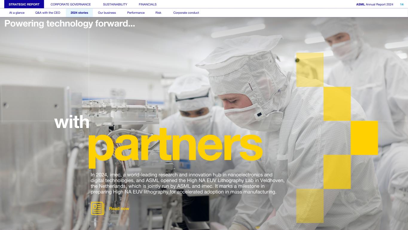 动力科技向前..。战略报告公司治理可持续发展财务报告ASML 2024年度报告14一览与CEO的问答2024故事我们的业务绩效风险公司行为与2024年合作伙伴、纳米电子和数字技术领域世界领先的研究和创新中心IMEC和ASML在荷兰费尔霍芬开设了High NA EUV光刻实验室,该实验室由ASML和IMEC共同运营。它标志着为加速在大规模制造中采用而准备高NA EUV光刻技术的一个里程碑。立即阅读