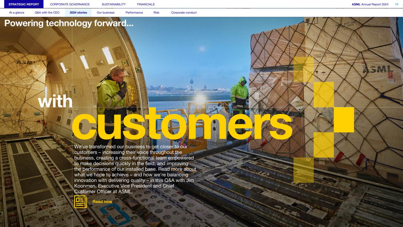动力科技向前..。战略报告公司治理可持续发展金融学ASML年度报告2024 11一览与CEO的问答2024故事我们的业务绩效风险公司行为客户我们已经转变了我们的业务,以更接近我们的客户——增加他们在整个业务中的发言权,创建一个跨职能团队,有权在该领域快速做出决策,并提高我们安装基础的性能。在与ASML执行副总裁兼首席客户官Jim Koonmen的问答中,详细了解我们希望实现什么——以及我们如何在创新与交付质量之间取得平衡。立即阅读