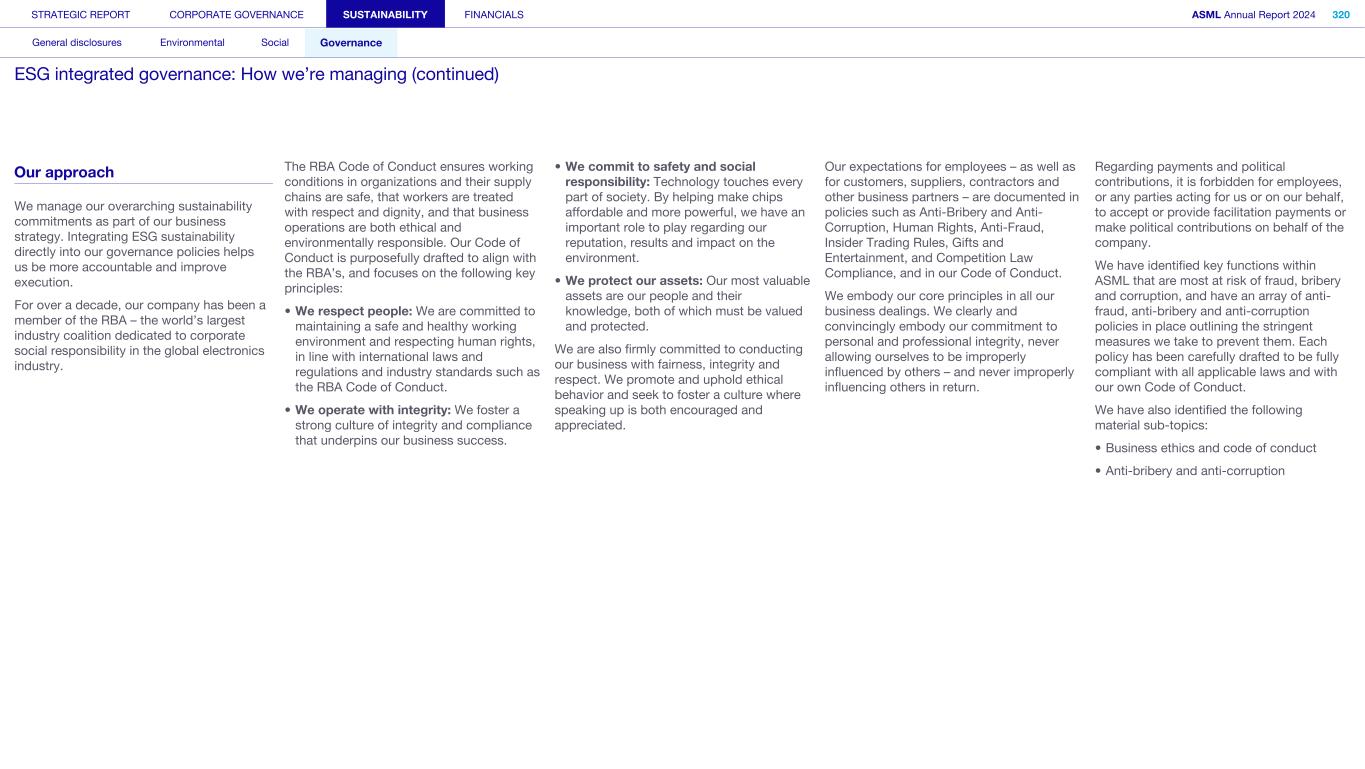 我们的方法我们管理我们的总体可持续发展承诺,作为我们业务战略的一部分。将ESG可持续性直接纳入我们的治理政策有助于我们更负责任并提高执行力。十多年来,我们公司一直是澳洲联储的成员——这是全球最大的致力于全球电子行业企业社会责任的行业联盟。澳洲联储行为准则确保组织及其供应链的工作条件是安全的,员工受到尊重和尊严的对待,企业运营既符合道德规范,又对环境负责。我们的行为准则是有目的地起草的,以与澳洲联储的一致,并侧重于以下关键原则:•我们尊重人:我们致力于维护安全和健康的工作环境,并尊重人权,符合国际法律法规和行业标准,如澳洲联储行为准则。•我们以诚信经营:我们培养强大的诚信和合规文化,这是我们业务成功的基础。•我们致力于安全和社会责任:科技触及社会的每一部分。通过帮助使芯片价格实惠且功能更强大,我们可以在我们的声誉、结果和对环境的影响方面发挥重要作用。•我们保护我们的资产:我们最宝贵的资产是我们的人民和他们的知识,这两者都必须受到重视和保护。我们也坚定地致力于以公平、诚信和尊重的态度开展业务。我们提倡和维护道德行为,并寻求培养一种发声既受到鼓励又受到赞赏的文化。我们对员工的期望——以及对客户、供应商、承包商和其他商业伙伴的期望——在反贿赂和反腐败、人权、反欺诈、内幕交易规则、礼品和娱乐、竞争法合规等政策以及我们的行为准则中都有记载。我们在所有业务往来中都体现了我们的核心原则。我们清楚而令人信服地体现了我们对个人和职业诚信的承诺,从不允许自己受到他人的不当影响——也从不以不当的方式影响他人作为回报。关于支付和政治献金,禁止员工或代表我们或代表我们行事的任何一方接受或提供好处费或代表公司进行政治献金。我们在ASML内部确定了最容易出现欺诈、贿赂和腐败风险的关键职能,并制定了一系列反欺诈、反贿赂和反腐败政策,概述了我们为防止这些风险而采取的严厉措施。每一项政策都经过精心起草,以完全符合所有适用的法律和我们自己的行为准则。我们还确定了以下材料子主题:•商业道德和行为准则•反贿赂和反腐败战略报告公司治理可持续金融ASML年度报告2024320一般披露环境社会治理ESG一体化治理:我们如何管理(续)