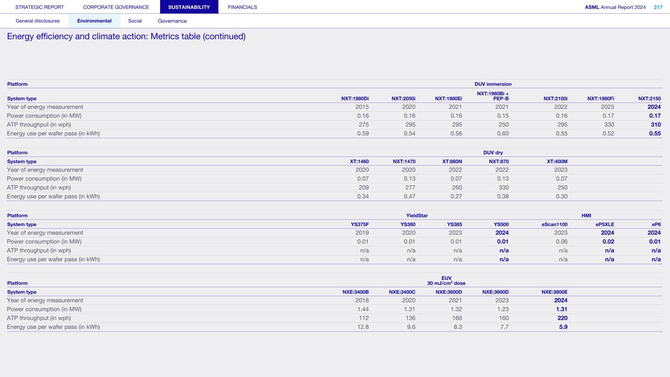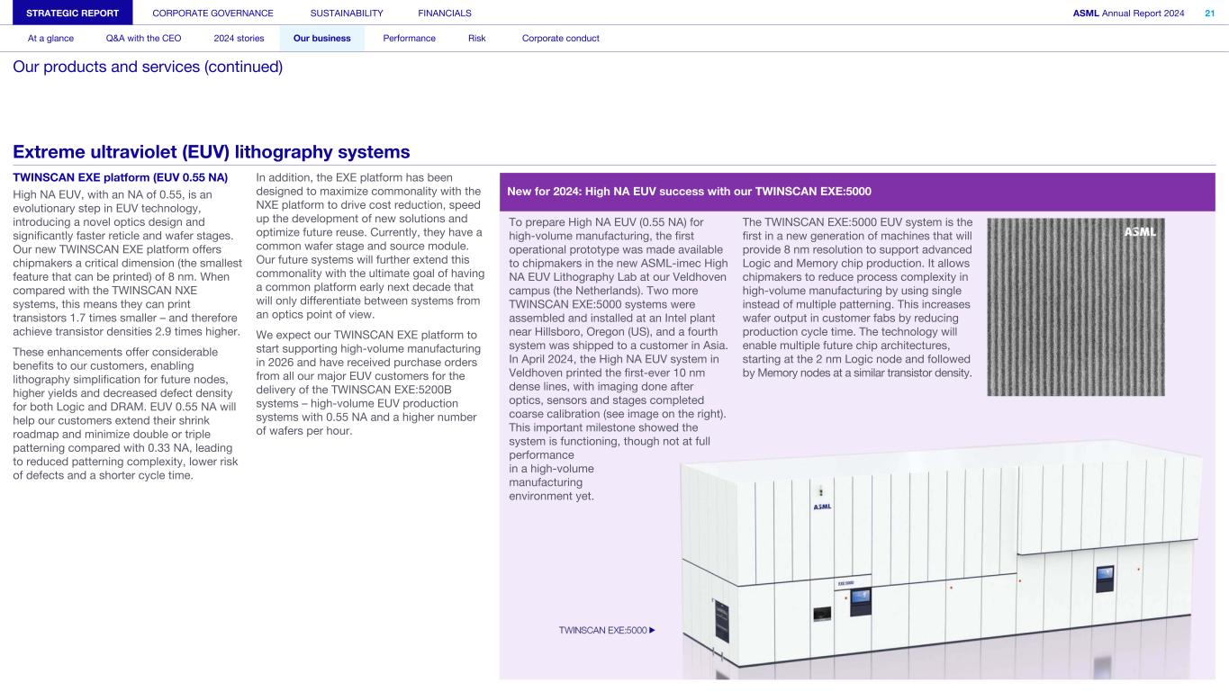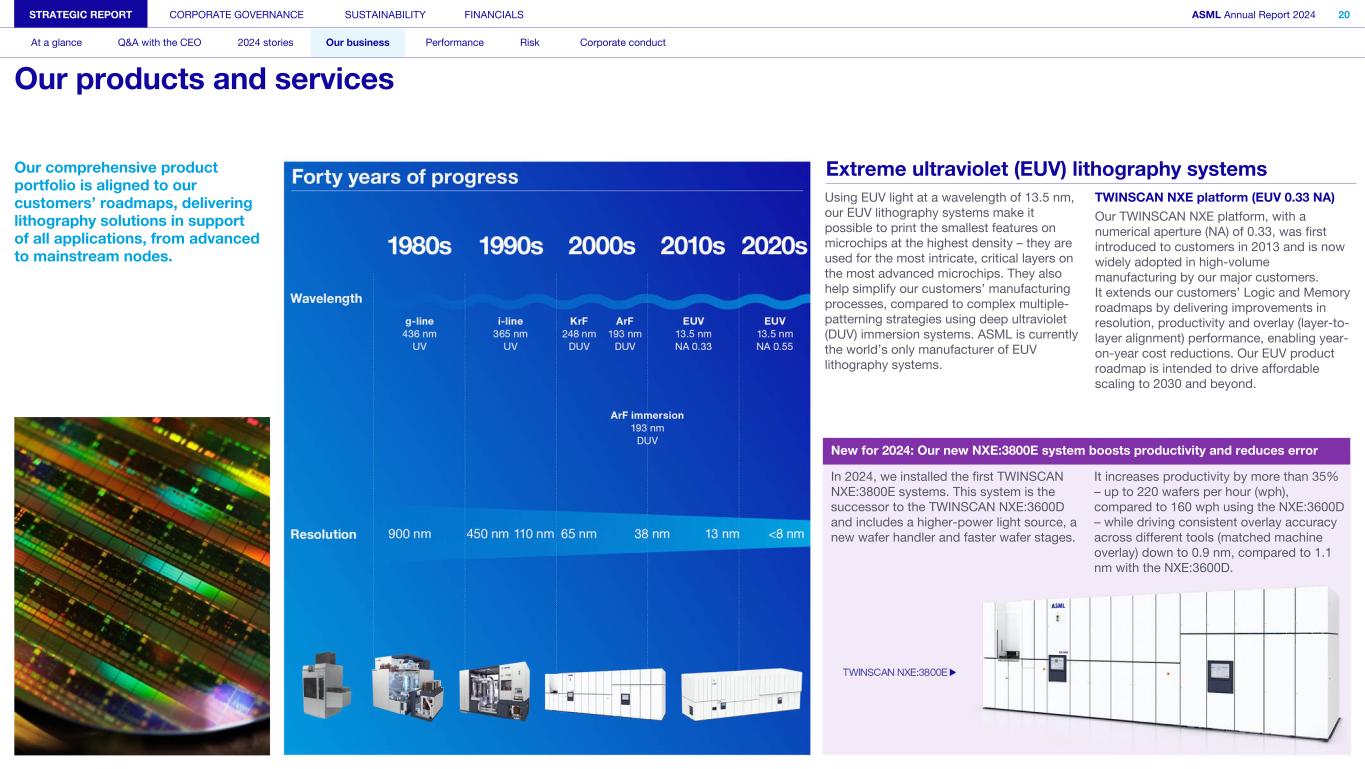 我们全面的产品组合与客户的路线图保持一致,提供支持所有应用的光刻解决方案,从先进节点到主流节点。使用波长为13.5 nm的EUV光,我们的EUV光刻系统使得以最高密度在微芯片上打印最小的特征成为可能——它们被用于最先进的微芯片上最复杂、最关键的层。与使用深紫外(DUV)浸没系统的复杂多重图案化策略相比,它们还有助于简化我们客户的制造流程。ASML是目前全球唯一的EUV光刻系统制造商。TWINSCAN NXE平台(EUV0.33NA)我们的TWINSCAN NXE平台,数值孔径(NA)为0.33,于2013年首次引入客户,现已被我们的主要客户广泛采用于大批量制造中。它通过提供分辨率、生产力和覆盖(层对层对齐)性能的改进,扩展了我们客户的逻辑和内存路线图,从而实现了逐年降低成本。我们的EUV产品路线图旨在推动可负担得起的扩展到2030年及以后。战略报告企业治理可持续发展财务报告2024-20年ASML年度报告与CEO问答一览2024年的故事我们的业务绩效风险企业行为我们的产品和服务极紫外(EUV)光刻系统2024年新增:我们新的NXE:3800E系统提高了生产力并减少了误差在2024年,我们安装了第一个TWINSCAN NXE:3800E系统。该系统是TWINSCAN NXE:3600D的继任者,并包括更高功率的光源、新的晶圆处理器和更快的晶圆级。它可将生产率提高超过35% –最高可达每小时220片晶圆(wph),而使用NXE:3600D的生产率为160 wph –同时将不同工具(匹配的机器叠加)上的一致叠加精度降至0.9 nm,而使用NXE:3600D的生产率为1.1 nm。