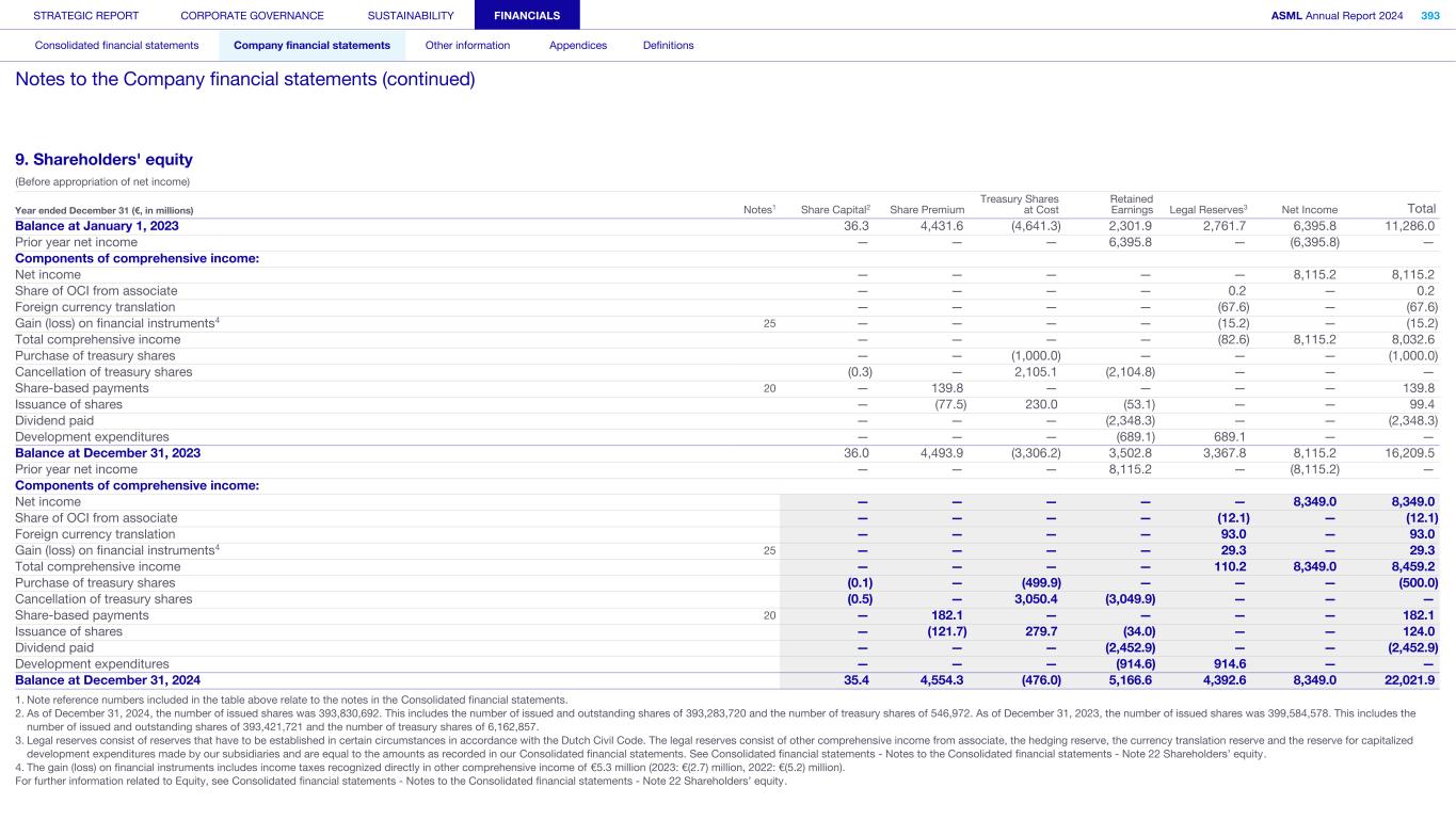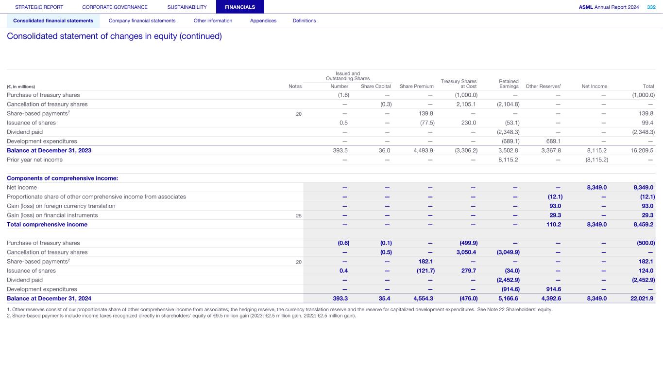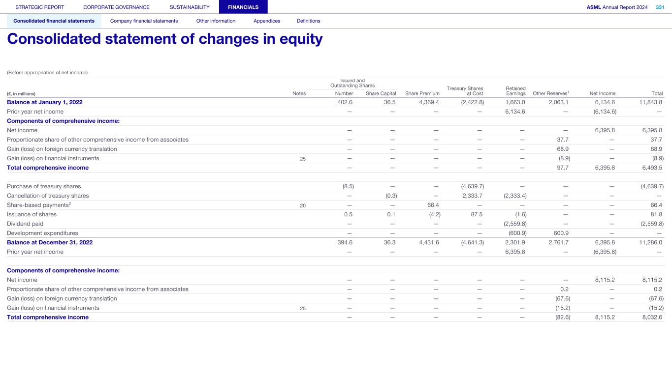 (净收益拨款前)1月1日余额,2022402.636.54,369.4(2,422.8)1,663.02,063.16,134.611,843.8上年净收益————6,134.6 ——(6,134.6)——综合收益构成部分:净收益—————— 6,395.86,395.8按比例应占联营公司其他综合收益———— 37.7 — 37.7外币折算损益———— 68.9 — 68.9金融工具损益25 ————(8.9)——(8.9)综合收益总额———— 97.76,395.86,493.5购买库存股(8.5)——(4,639.7)———(4,639.7)注销库存股—(0.3)— 2,333.7(2,333.4)————股份支付220 —— 66.4 ———— 66.4发行股份0.5 0.1(4.2)87.5(1.6)—— 81.8支付股利————(2,559.8)——(2,559.8)开发支出————(600.9)600.9 —— 12月31日余额,2022394.6 36.34,431.6(4,641.3)2,301.92,761.76,395.8 11,286.0上年净收益————6,395.8 ——(6,395.8)——综合收益构成部分:净收益———————— 8,115.28,115.2按比例应占联营公司其他综合收益—————— 0.2 —— 0.2外币折算损益————(67.6)——(67.6)金融工具损益25 ————(15.2)——(15.2)综合收益总额————(82.6)8,115.28,032.6已发行和流通股股份溢价库存股按成本计留存收益其他储备1净收入总额(欧元,百万)票据编号股本战略报告公司治理可持续发展财务ASML年度报告2024331合并财务报表公司财务报表其他信息附录定义合并权益变动表