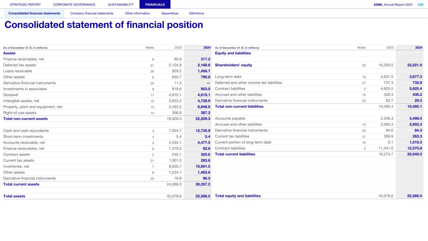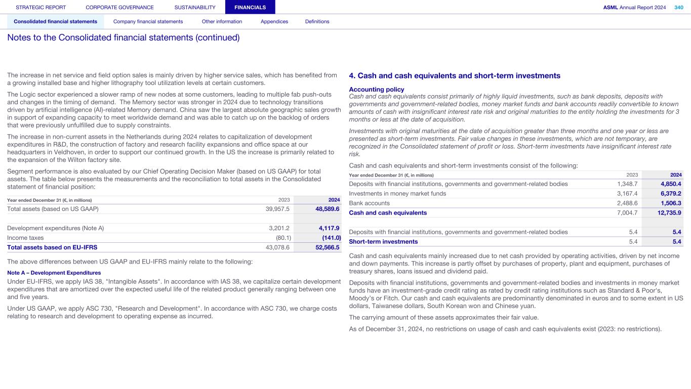 净服务和现场期权销售额的增长主要是由更高的服务销售额推动的,这得益于不断增长的安装基数和某些客户更高的光刻工具利用率水平。逻辑部门经历了一些客户的新节点爬坡速度较慢,导致多个晶圆厂推出和需求时机的变化。由于人工智能(AI)相关内存需求推动的技术转型,内存板块在2024年走强。中国看到了最大的绝对地理销售增长,以支持扩大产能以满足全球需求,并且能够赶上之前由于供应限制而未完成的积压订单。2024年荷兰非流动资产的增加涉及研发开发支出的资本化、工厂和研究设施扩建的建设以及我们在Veldhoven总部的办公空间,以支持我们的持续增长。在美国,这一增长主要与威尔顿工厂场地的扩建有关。分部业绩也由我们的首席运营决策者(基于美国公认会计原则)对总资产进行评估。下表列出了合并财务状况表中的计量以及与总资产的对账情况:截至12月31日止年度(欧元,百万)20232024年总资产(基于美国公认会计原则)39,957.548,589.6发展支出(注A)3,201.24,117.9所得税(80.1)(141.0)基于欧盟国际财务报告准则的总资产43,078.652,566.5美国公认会计原则与欧盟国际财务报告准则的上述差异主要涉及以下方面:注A –欧盟国际财务报告准则下的发展支出,我们采用IAS 38,“无形资产”。根据国际会计准则第38号,我们将在相关产品的预期使用寿命内摊销的某些开发支出资本化,一般在一年到五年之间。在美国通用会计准则下,我们应用ASC 730,“研发”。根据ASC 730,我们在发生时将与研发相关的成本计入营业费用。4.现金及现金等价物和短期投资会计政策现金及现金等价物主要包括高流动性投资,例如银行存款、存放在政府和政府相关机构的存款、货币市场基金和银行账户,这些投资在收购之日向持有投资的实体提供的原始到期日为3个月或更短的利率风险很小且易于转换为已知金额的现金且易于转换为已知金额的现金。收购日原始到期日大于三个月且不超过一年的投资作为短期投资列报。这些投资的公允价值变动并非暂时性的,在综合损益表中确认。短期投资利率风险不大。现金及现金等价物和短期投资包括:截至12月31日止年度(欧元,百万)20232024年存放于金融机构、政府和政府相关机构的存款1,348.74,850.4投资于货币市场基金3,167.46,379.2银行账户2,488.61,506.3现金及现金等价物7,004.712,735.9存放于金融机构、政府和政府相关机构的存款5.45.4短期投资5.45.4现金及现金等价物增加,主要是由于经营活动提供的现金净额在净收入和首付款的推动下增加。这一增长被购买物业、厂房和设备、购买库存股、发放的贷款和支付的股息部分抵消。在金融机构、政府和政府相关机构的存款以及对货币市场基金的投资具有标准普尔、穆迪或惠誉等信用评级机构评级的投资级信用评级。我们的现金和现金等价物主要以欧元计价,在某种程度上以美元、台币、韩元和人民币计价。这些资产的账面值与其公允价值相若。截至2024年12月31日,不存在使用现金及现金等价物的限制(2023年:无限制)。战略报告公司治理可持续发展财务ASML年度报告2024340合并财务报表公司财务报表其他信息附录定义合并财务报表附注(续)