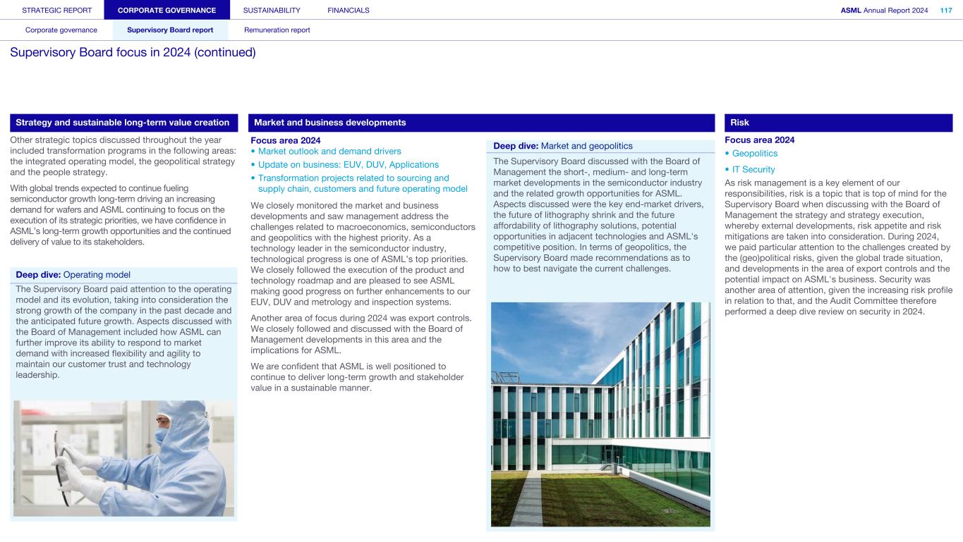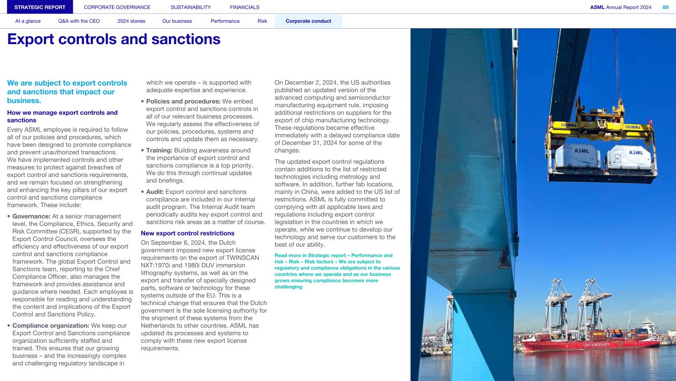 我们受到影响我们业务的出口管制和制裁。我们如何管理出口管制和制裁措施ASML的每一位员工都必须遵守我们所有的政策和程序,这些政策和程序旨在促进合规并防止未经授权的交易。我们实施了控制措施和其他措施,以防止违反出口管制和制裁要求,我们仍然专注于加强和加强我们的出口管制和制裁遵守框架的关键支柱。其中包括:•治理:在高级管理层面,合规、道德、安全和风险委员会(CESR)在出口管制委员会的支持下,监督我们的出口管制和制裁合规框架的效率和有效性。向首席合规官报告的全球出口管制和制裁小组也管理该框架,并在需要时提供援助和指导。每位员工负责阅读和理解出口管制和制裁政策的内容和影响。•合规组织:我们保持我们的出口管制和制裁合规组织有足够的人员配备和培训。这确保了我们不断增长的业务——以及我们所处的日益复杂和具有挑战性的监管环境——得到了足够的专业知识和经验的支持。•政策和程序:我们在所有相关业务流程中嵌入了出口管制和制裁管制。我们定期评估我们的政策、程序、系统和控制措施的有效性,并根据需要进行更新。•培训:围绕出口管制和遵守制裁的重要性建立认识是当务之急。我们通过不断更新和简报来做到这一点。•审计:出口管制和制裁合规被纳入我们的内部审计计划。内部审计小组理所当然地定期审计关键的出口管制和制裁风险领域。新的出口管制限制2024年9月6日,荷兰政府对TWINSCAN NXT:1970i和1980i DUV浸没式光刻系统的出口,以及为这些系统在欧盟以外地区出口和转让特别设计的零件、软件或技术,施加了新的出口许可要求。这是一项技术变革,确保荷兰政府是将这些系统从荷兰运往其他国家的唯一许可机构。ASML已更新其流程和系统以符合这些新的出口许可要求。2024年12月2日,美国当局公布了先进计算和半导体制造设备规则的更新版本,对出口芯片制造技术的供应商施加了额外限制。这些规定立即生效,部分变更的延迟合规日期为2024年12月31日。更新后的出口管制条例增加了包括计量和软件在内的限制技术清单。此外,主要在中国的更多晶圆厂地点被添加到美国的限制清单中。ASML充分致力于遵守所有适用的法律法规,包括我们经营所在国家的出口管制立法,同时我们将继续开发我们的技术并尽我们所能为客户提供服务。在战略报告中阅读更多内容–绩效和风险–风险–风险因素–我们在我们经营所在的各个国家承担监管和合规义务,随着我们业务的增长,确保合规变得更具挑战性战略报告公司治理可持续发展财务ASML年度报告202489与首席执行官的问答一目了然2024年的故事我们的业务绩效风险公司行为出口管制和制裁