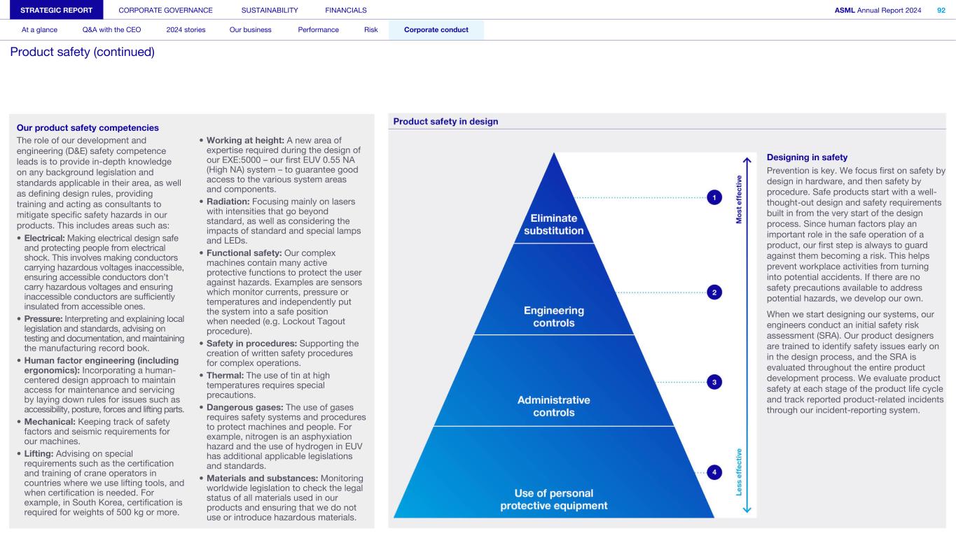 安全防范中的设计是关键。我们在硬件上首先注重设计上的安全,然后才是程序上的安全。安全产品从设计过程的一开始就从深思熟虑的设计和内置的安全要求开始。由于人为因素在产品的安全运行中起着重要作用,因此我们的第一步始终是要防范它们成为风险。这有助于防止工作场所的活动演变成潜在的事故。如果没有可用的安全预防措施来解决潜在的危险,我们开发自己的。当我们开始设计我们的系统时,我们的工程师会进行初始安全风险评估(SRA)。我们的产品设计人员经过培训,能够在设计过程的早期就识别安全问题,并在整个产品开发过程中对SRA进行评估。我们在产品生命周期的每个阶段评估产品安全性,并通过我们的事件报告系统跟踪报告的产品相关事件。战略报告公司治理可持续财务ASML年度报告202492与CEO问答一览2024故事我们的业务绩效风险企业行为产品安全(续)我们的产品安全能力我们的开发和工程(D & E)安全能力线索的作用是提供有关其所在地区适用的任何背景立法和标准的深入知识,以及定义设计规则、提供培训和担任顾问以减轻我们产品中的特定安全隐患。这包括以下领域:•高空工作:我们的EXE:5000 ——我们的第一个EUV 0.55 NA(High NA)系统——设计过程中所需的一个新的专业领域,以保证对各个系统领域和组件的良好访问。•辐射:主要关注强度超出标准的激光器,同时考虑标准和特殊灯具和LED的影响。•功能安全:我们复杂的机器包含许多主动防护功能,保护用户免受危害。例如,传感器可以监测电流、压力或温度,并在需要时将系统独立置于安全位置(例如Lockout Tagout程序)。•程序安全:支持为复杂操作创建书面安全程序。•热:高温下使用锡需要特别注意。•危险气体:使用气体需要安全系统和程序来保护机器和人员。例如,氮气是一种窒息危险,在EUV中使用氢气有额外的适用立法和标准。•材料和物质:监测全球立法,以检查我们产品中使用的所有材料的法律地位,并确保我们不使用或引入危险材料。•电气:让电气设计变得安全,保护人们免受电击。这涉及使携带危险电压的导体无法接近,确保可接近的导体不携带危险电压,并确保不可接近的导体与可接近的导体充分绝缘。•压力:解读和解释当地立法和标准,就测试和文件提供建议,并维护制造记录簿。•人因工程(包括人体工程学):采用以人为中心的设计方法,通过为可访问性、姿势、力和提升部件等问题制定规则来保持维护和维修的访问。•机械:不断跟踪我们机器的安全系数和抗震要求。•起重:就特殊要求提供咨询意见,例如在我们使用起重工具的国家对起重机操作员的认证和培训,以及何时需要认证。例如,在韩国,500公斤以上的重量需要认证。