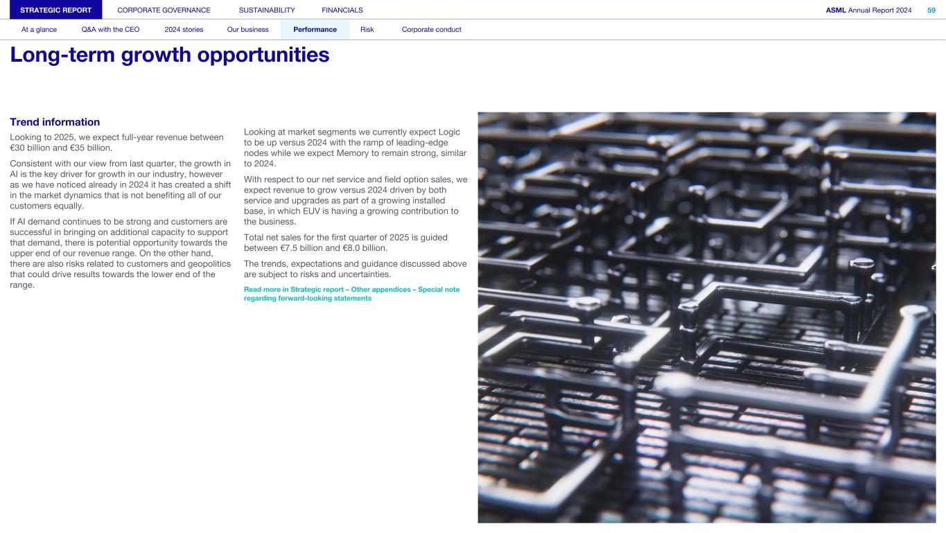趋势信息展望2025年,我们预计全年收入在300亿欧元至350亿欧元之间。与我们上个季度的观点一致,人工智能的增长是我们行业增长的关键驱动力,但正如我们在2024年已经注意到的那样,它造成了市场动态的转变,并没有使我们所有的客户都平等受益。如果人工智能需求持续强劲,并且客户成功地带来了额外的产能来支持这种需求,那么我们的收入范围的上限就有潜在的机会。另一方面,也存在与客户和地缘政治相关的风险,这些风险可能会将业绩推向区间的低端。从细分市场来看,我们目前预计随着领先节点的增加,Logic将高于2024年,而我们预计内存将保持强劲,类似于2024年。关于我们的净服务和现场选项销售,我们预计收入将比2024年增长,这得益于服务和升级,这是不断增长的安装基础的一部分,其中EUV对业务的贡献越来越大。2025年第一季度的总净销售额指引在75亿欧元至80亿欧元之间。以上讨论的趋势、预期和指引受制于风险和不确定性。在战略报告中阅读更多内容–其他附录–关于前瞻性陈述的特别说明战略报告公司治理可持续发展财务ASML年度报告2024 59与首席执行官的问答一目了然2024年的故事我们的业务绩效风险公司进行长期增长机会