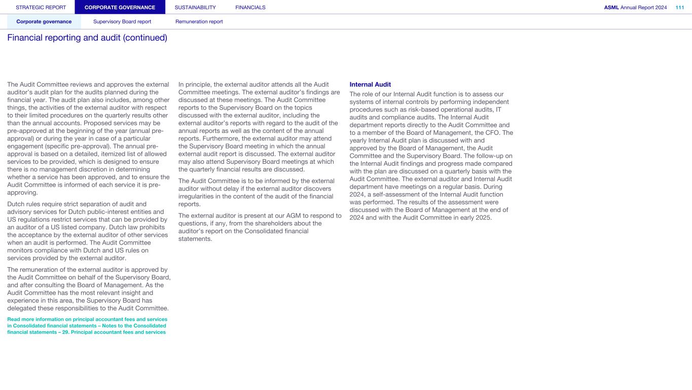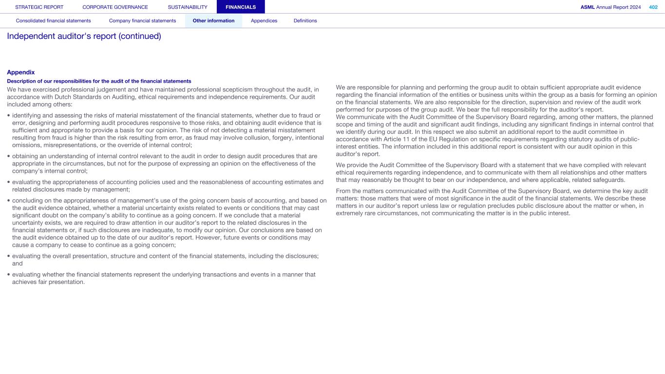通过执行这些程序,我们遵守了荷兰民法典第2册第9部分和荷兰标准720的要求。所履行程序的范围小于我们审计财务报表所履行的范围。其他信息由阿斯麦 NV的管理层负责准备,包括《荷兰民法典》第2册第9部分要求的信息。关于其他法律法规要求和ESEF参与的报告我们最初于2015年4月30日获股东大会任命为阿斯麦 NV的审计师,截至2016年年度的审计,并自该财政年度起一直担任法定审计师。没有禁止的非审计服务我们没有提供欧盟条例第5(1)条中提到的关于公共利益实体法定审计的具体要求的禁止的非审计服务。European Single Electronic Format(ESEF)阿斯麦 NV已在ESEF编制年度报告。关于单一电子报告格式规范的监管技术标准(以下简称:ESEF上的RTS),授权条例(EU)2019/815规定了这方面的要求。我们认为,以XHTML格式编制的年度报告,包括阿斯麦 NV在报告包中包含的加价合并财务报表,在所有重大方面均符合ESEF上的RTS。管理层负责根据ESEF上的RTS编制包括财务报表在内的年度报告,据此,管理层将各个组成部分合并为一个单一的报告包。我们的责任是为我们的意见获得合理保证,本报告包中的年度报告是否符合ESEF上的RTS。我们根据荷兰法律进行了审查,包括荷兰标准3950N’Assurance-opdrachten inzake het voldoen aan de criteria voor het opstellen van een digitaal verantwoordingsdocument’(与遵守数字报告标准有关的保证约定)。我们的检查包括:•了解实体的财务报告流程,包括编制报告包;•识别和评估年度报告在所有重大方面不符合ESEF上的RTS的风险,并针对这些风险设计和执行进一步的保证程序,为我们的意见提供基础,包括:⑤获得报告包并进行验证,以确定包含内联XBRL实例文档和XBRL扩展分类法文件的报告包是否已按照ESEF上的RTS中包含的技术规范编制;⑤检查报告包中与合并财务报表相关的信息,以确定是否已应用所有必要的加价,以及这些是否符合ESEF上的RTS。关于财务报表的责任说明管理层和监事会对财务报表的责任管理层负责根据欧盟国际财务报告准则和荷兰民法典第2册第9部分编制和公允列报财务报表。此外,管理层对管理层认为必要的内部控制负责,以使财务报表的编制不存在重大错报,无论是由于欺诈还是错误。在这方面,管理层在监事会的监督下,负责预防和发现欺诈和不遵守法律法规的行为,包括确定解决其后果的措施和防止再次发生。作为编制财务报表的一部分,管理层负责评估公司持续经营的能力。基于所提到的财务报告框架,管理层应使用持续经营会计基础编制财务报表,除非管理层要么打算清算公司或停止运营,要么别无选择,只能这样做。管理层应在财务报表中披露可能对公司持续经营能力产生重大怀疑的事件和情况。监事会负责监督公司的财务报告流程。我们对财务报表审计的责任我们的目标是计划和执行审计业务,使我们能够为发表意见获取充分和适当的审计证据。我们的审计是以很高但不是绝对的保证水平进行的, 这意味着我们可能无法在审计过程中发现所有重大错误和欺诈行为。错报可能源于欺诈或错误,如果可以合理地预期错报单独或总体上会影响用户根据这些财务报表作出的经济决策,则被视为重大错报。重要性影响我们审计程序的性质、时间和范围以及对已识别错报对我们意见影响的评估。关于我们对财务报表审计职责的进一步说明载于这份审计报告的附录。本说明构成我们审计报告的一部分。阿姆斯特丹,2025年3月5日KPMG Accountants N.V. P.J. Groenland – van der Linden RA Strategic Report公司治理可持续发展金融公司ASML年度报告2024401合并财务报表公司财务报表其他信息附录定义独立审计师报告(续)