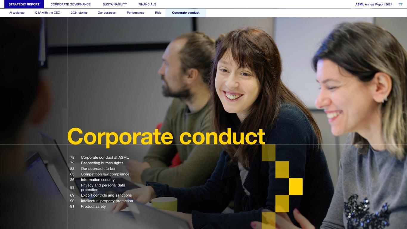 战略报告公司治理可持续发展金融学ASML年度报告202477与CEO的一览问答2024故事我们的业务绩效风险公司行为公司行为78在ASML的公司行为79尊重人权83我们的税收方法85遵守竞争法86信息安全88隐私和个人数据保护89出口管制和制裁90知识产权保护91产品安全