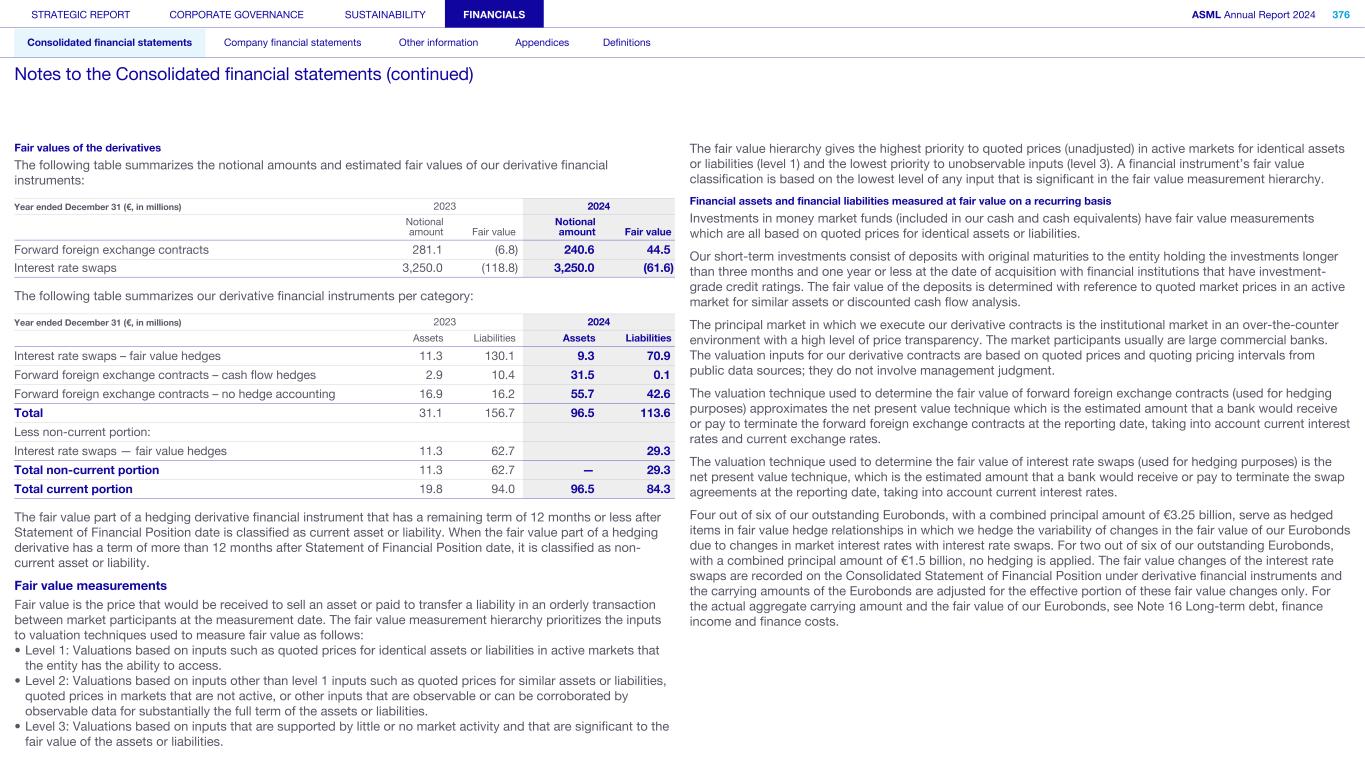 衍生工具的公允价值下表汇总了我们衍生金融工具的名义金额和估计公允价值:截至12月31日止年度(欧元,百万)20232024年名义金额公允价值名义金额公允价值远期外汇合约281.1(6.8)240.64 4.5利率掉期3,250.0(118.8)3,250.0(61.6)下表汇总了我们每个类别的衍生金融工具:截至12月31日止年度(欧元,百万)20232024资产负债资产负债利率掉期–公允价值套期11.31 30.19.37 0.9远期外汇合约–现金流量套期2.9 10.43 1.5 0.1远期外汇合约–无套期会计16.9 16.255.74 2.6合计31.11 56.7 96.51 13.6减非流动部分:利率掉期—公允价值套期11.36 2.72 9.3非流动部分合计11.36 2.7 — 29.3流动部分合计19.89 4.09 6.58 4.3对冲衍生金融工具的公允价值部分在财务状况表日期后剩余期限为12个月或更短的,分类为流动资产或负债。当套期保值衍生工具的公允价值部分的期限在财务状况表日后超过12个月时,则将其分类为非流动资产或负债。公允价值计量公允价值是市场参与者在计量日进行的有序交易中出售资产所收到的价款或转移负债所支付的价款。公允价值计量层次结构将用于计量公允价值的估值技术的输入值优先排序如下:•第1级:根据实体有能力获得的活跃市场中相同资产或负债的报价等输入值进行估值。•第2级:基于第1级输入值以外的输入值的估值,例如类似资产或负债的报价、不活跃市场的报价,或在资产或负债的几乎整个期限内可观察到或可由可观察数据证实的其他输入值。•第3级:基于很少或没有市场活动支持且对资产或负债的公允价值具有重要意义的投入的估值。公允价值层次结构给予相同资产或负债在活跃市场中的报价(未经调整)最高优先级(第1级),给予不可观察输入值最低优先级(第3级)。金融工具的公允价值分类是基于公允价值计量层次结构中重要的任何输入值的最低水平。以经常性基础以公允价值计量的金融资产和金融负债货币市场基金投资(包括在我们的现金和现金等价物中)的公允价值计量均基于相同资产或负债的报价。我们的短期投资包括在取得之日向拥有投资级信用评级的金融机构提供原始期限超过三个月和一年或更短时间的投资持有实体的存款。存款的公允价值参考同类资产活跃市场中的市场报价或现金流折现分析确定。我们执行衍生品合约的主要市场是场外交易环境中的机构市场,价格透明度较高。市场参与者通常是大型商业银行。我们的衍生品合约的估值输入是基于公开数据来源的报价和报价定价区间;它们不涉及管理层的判断。用于确定远期外汇合约公允价值(用于套期保值目的)的估值技术近似于净现值技术,即银行在报告日为终止远期外汇合约而将收到或支付的估计金额,同时考虑了当前利率和当前汇率。用于确定利率掉期公允价值(用于套期保值目的)的估值技术是净现值技术,它是银行在报告日为终止掉期协议而将收到或支付的估计金额,其中考虑了当前利率。我们未偿还的六笔欧洲债券中有四笔,本金总额为32.5亿欧元,作为公允价值对冲关系中的对冲项目,在这些项目中,我们通过利率掉期对冲市场利率变化导致的欧洲债券公允价值变动的可变性。对于我们六只未偿还的欧洲债券中的两只,本金总额为15亿欧元, 不进行套期保值。利率掉期的公允价值变动记入综合财务状况表衍生金融工具项下,而欧洲债券的账面值仅就该等公允价值变动的有效部分进行调整。关于我们的欧洲债券的实际总账面值和公允价值,见附注16长期债务、财务收入和财务成本。战略报告公司治理可持续发展金融公司ASML年度报告2024376合并财务报表公司财务报表其他信息附录定义合并财务报表附注(续)