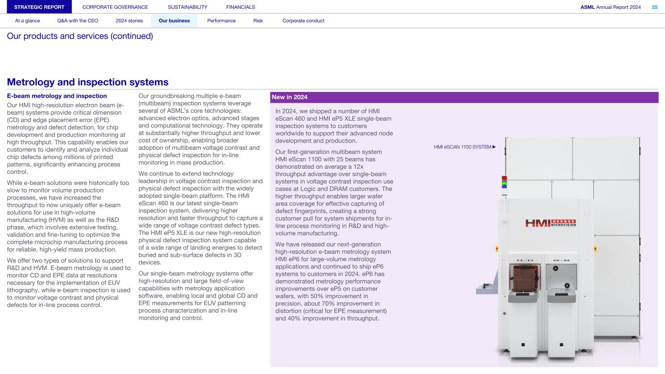 电子束计量和检测我们的HMI高分辨率电子束(e-beam)系统提供临界尺寸(CD)和边缘放置误差(EPE)计量和缺陷检测,用于芯片开发和高通量生产监控。这种能力使我们的客户能够在数百万个打印图案中识别和分析单个芯片缺陷,显着增强了过程控制。虽然e-beam解决方案在历史上监测批量生产过程的速度太慢,但我们已经提高了吞吐量,现在独特地提供了用于大批量制造(HVM)以及研发阶段的e-beam解决方案,这涉及广泛的测试、验证和微调,以优化完整的微芯片制造过程,实现可靠、高收益的大规模生产。我们提供两种类型的解决方案来支持研发和HVM。E光束计量用于以实施EUV光刻所需的分辨率监测CD和EPE数据,而E光束检测用于监测电压对比和物理缺陷以进行在线过程控制。我们开创性的多电子束(multi-beam)检测系统利用了ASML的几项核心技术:先进的电子光学、先进的舞台和计算技术。它们以显着更高的吞吐量和更低的拥有成本运行,从而能够在大规模生产中更广泛地采用多波束电压对比和物理缺陷检查进行在线监测。我们通过广泛采用的单波束平台,继续在电压对比检测和物理缺陷检测方面扩展技术领先地位。HMI eScan 460是我们最新的单波束检测系统,可提供更高的分辨率和更快的吞吐量,以捕捉范围广泛的电压对比度缺陷类型。HMI eP5 XLE是我们新型的高分辨率物理缺陷检测系统,能够以宽范围的着陆能量检测3D设备中的埋地和亚表面缺陷。我们的单波束计量系统通过计量应用软件提供高分辨率和大视野能力,可实现EUV图案化过程表征和在线监测和控制的本地和全球CD和EPE测量。2024年,我们向全球客户发运了多款HMI eScan 460和HMI eP5 XLE单波束检测系统,以支持其先进的节点开发和生产。在Logic和DRAM客户的电压对比度检测用例中,我们的第一代多波束系统HMI eScan 1100具有25波束,平均比单波束系统显示出12倍的吞吐量优势。更高的吞吐量可实现更大的晶圆区域覆盖,以有效捕获缺陷指纹,为研发和大批量制造中的在线过程监控的系统出货量创造强大的客户拉力。我们发布了用于大容量计量应用的下一代高分辨率电子束计量系统HMI eP6,并在2024年继续向客户发货eP6系统。eP6在客户晶圆上展示了优于eP5的计量性能改进,精度提高了50%,失真提高了约70%(对EPE测量至关重要),吞吐量提高了40%。战略报告企业治理可持续发展财务ASML 2024年度报告25一览CEO问答2024故事我们的业务绩效风险企业行为我们的产品和服务(续)计量和检测系统2024年新