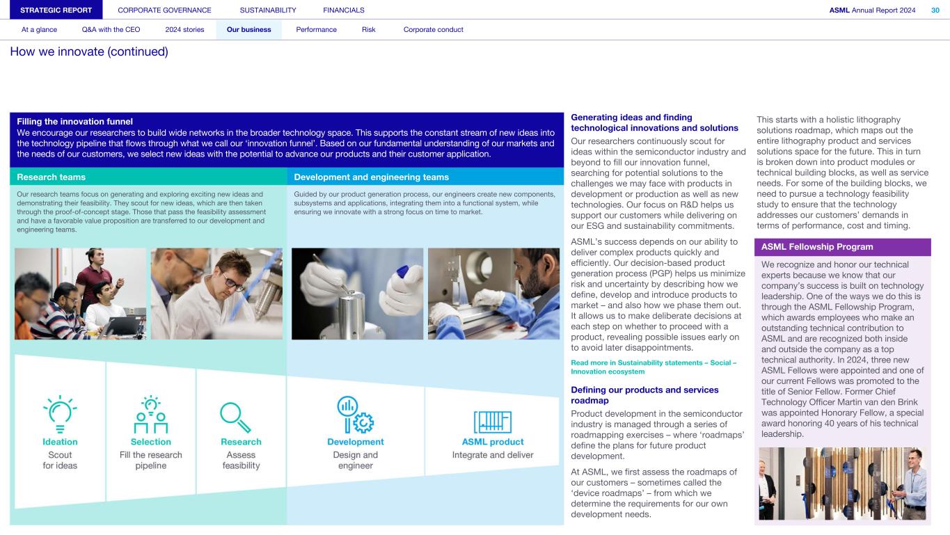战略报告公司治理可持续发展金融学ASML年度报告202430一览与CEO的问答2024故事我们的业务绩效风险公司行为我们如何创新(续)填补创新漏斗我们鼓励我们的研究人员在更广阔的技术空间中建立广泛的网络。这支持源源不断的新想法进入流经我们称之为‘创新漏斗’的技术管道。基于我们对市场和客户需求的基本理解,我们选择具有潜力的新想法来推进我们的产品及其客户应用。研究团队开发和工程团队我们的研究团队专注于产生和探索令人兴奋的新想法并证明其可行性。他们寻找新的想法,然后通过概念验证阶段。那些通过可行性评估,有有利价值主张的,转给我们的开发和工程团队。以我们的产品生成流程为指导,我们的工程师创建新的组件、子系统和应用程序,将它们集成到一个功能系统中,同时确保我们以对上市时间的强烈关注进行创新。产生想法并寻找技术创新和解决方案我们的研究人员不断在半导体行业内外寻找想法,以填补我们的创新漏斗,寻找潜在的解决方案,以应对我们在开发或生产中的产品以及新技术方面可能面临的挑战。我们对研发的关注帮助我们支持客户,同时兑现我们的ESG和可持续发展承诺。ASML的成功取决于我们快速高效地交付复杂产品的能力。我们基于决策的产品生成过程(PGP)通过描述我们如何定义、开发和将产品推向市场——以及我们如何逐步淘汰它们,帮助我们最大限度地降低风险和不确定性。它让我们能够在每一步就是否继续开发产品做出深思熟虑的决定,及早揭示可能存在的问题,以避免后来的失望。阅读更多可持续发展声明–社会–创新生态系统定义我们的产品和服务路线图半导体行业的产品开发是通过一系列路线图练习进行管理的——‘路线图’定义了未来产品开发的计划。在ASML,我们首先评估客户的路线图——有时也被称为‘设备路线图’——我们从中确定满足自身开发需求的需求。这要从一个整体的光刻解决方案路线图开始,为未来绘制出整个光刻产品和服务解决方案空间。这反过来又被分解为产品模块或技术积木,以及服务需求。对于某些构建块,我们需要进行技术可行性研究,以确保该技术满足客户在性能、成本和时间方面的需求。ASML奖学金计划我们认可并表彰我们的技术专家,因为我们知道我们公司的成功建立在技术领先地位之上。我们这样做的方式之一是通过ASML研究金计划,该计划奖励对ASML做出杰出技术贡献并在公司内外被公认为顶级技术权威的员工。在2024年,任命了三名新的ASML研究员,我们现有的一名研究员晋升为高级研究员。前首席技术官Martin van den Brink被任命为荣誉研究员,这是一个表彰他40年技术领导能力的特别奖项。